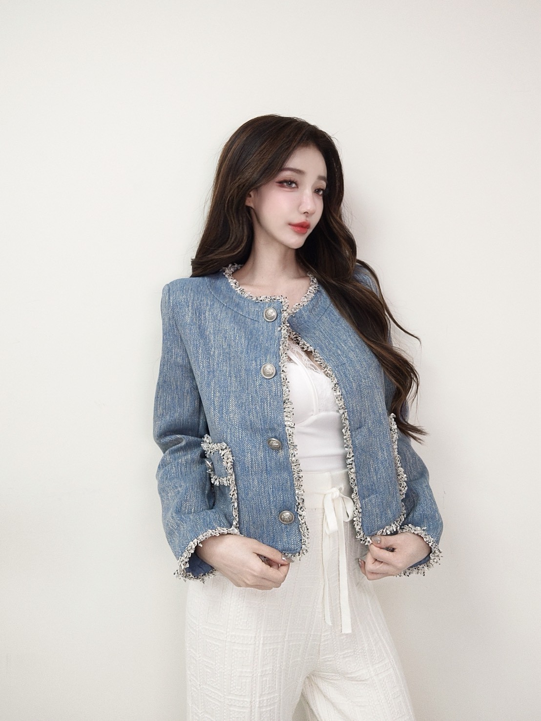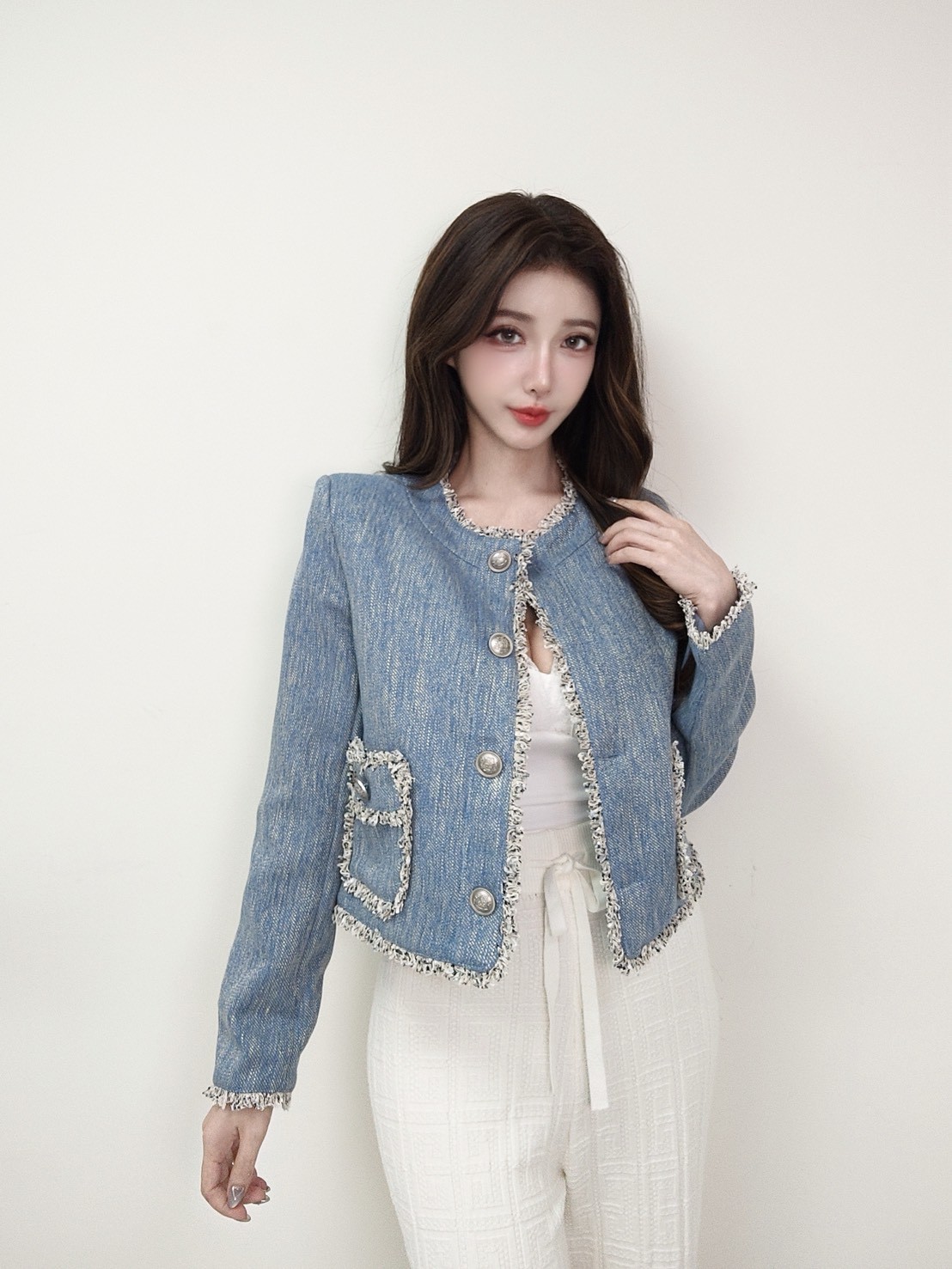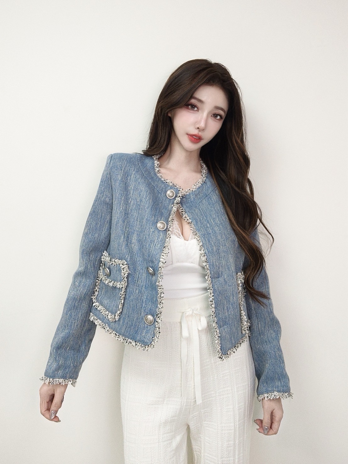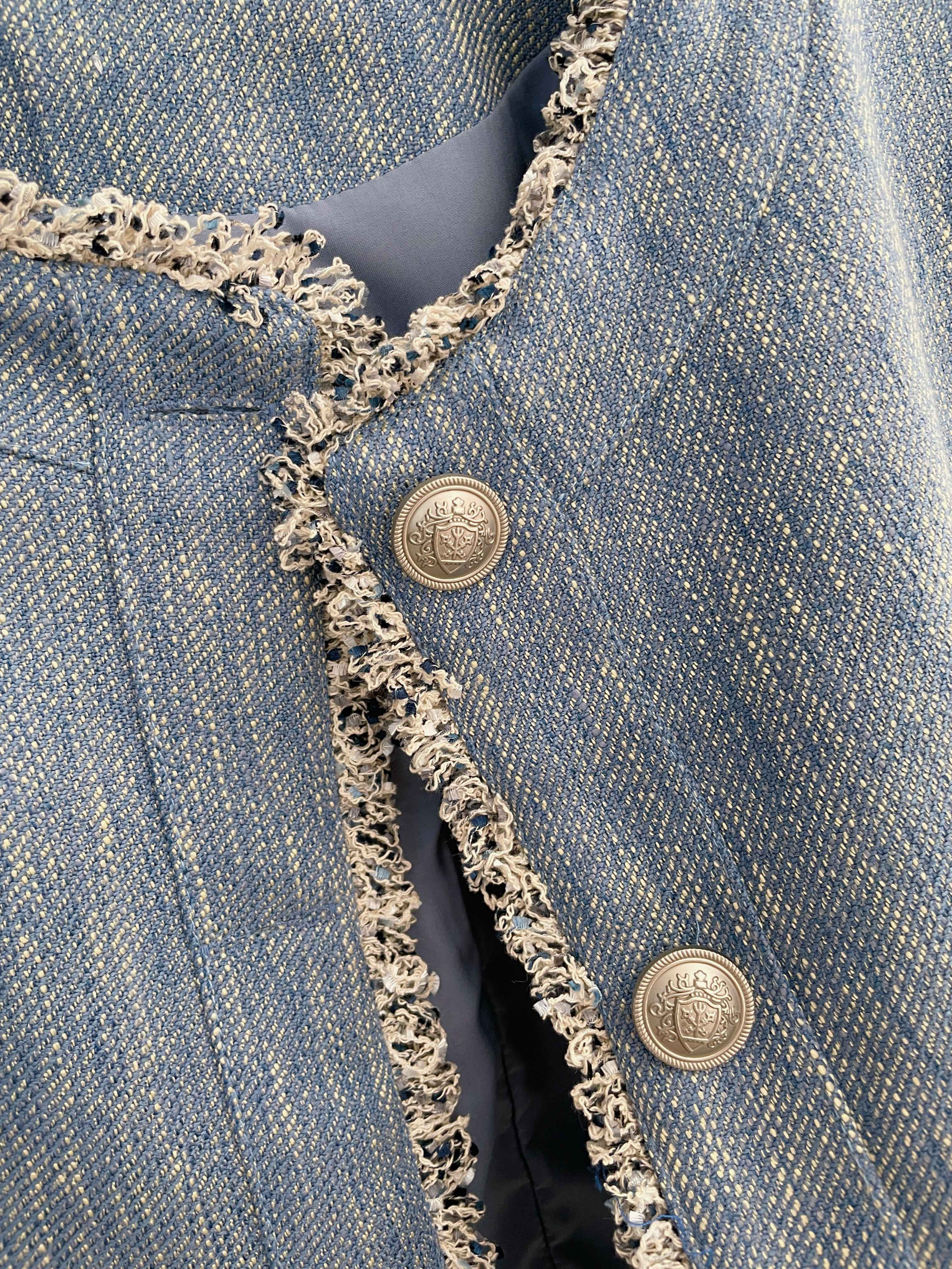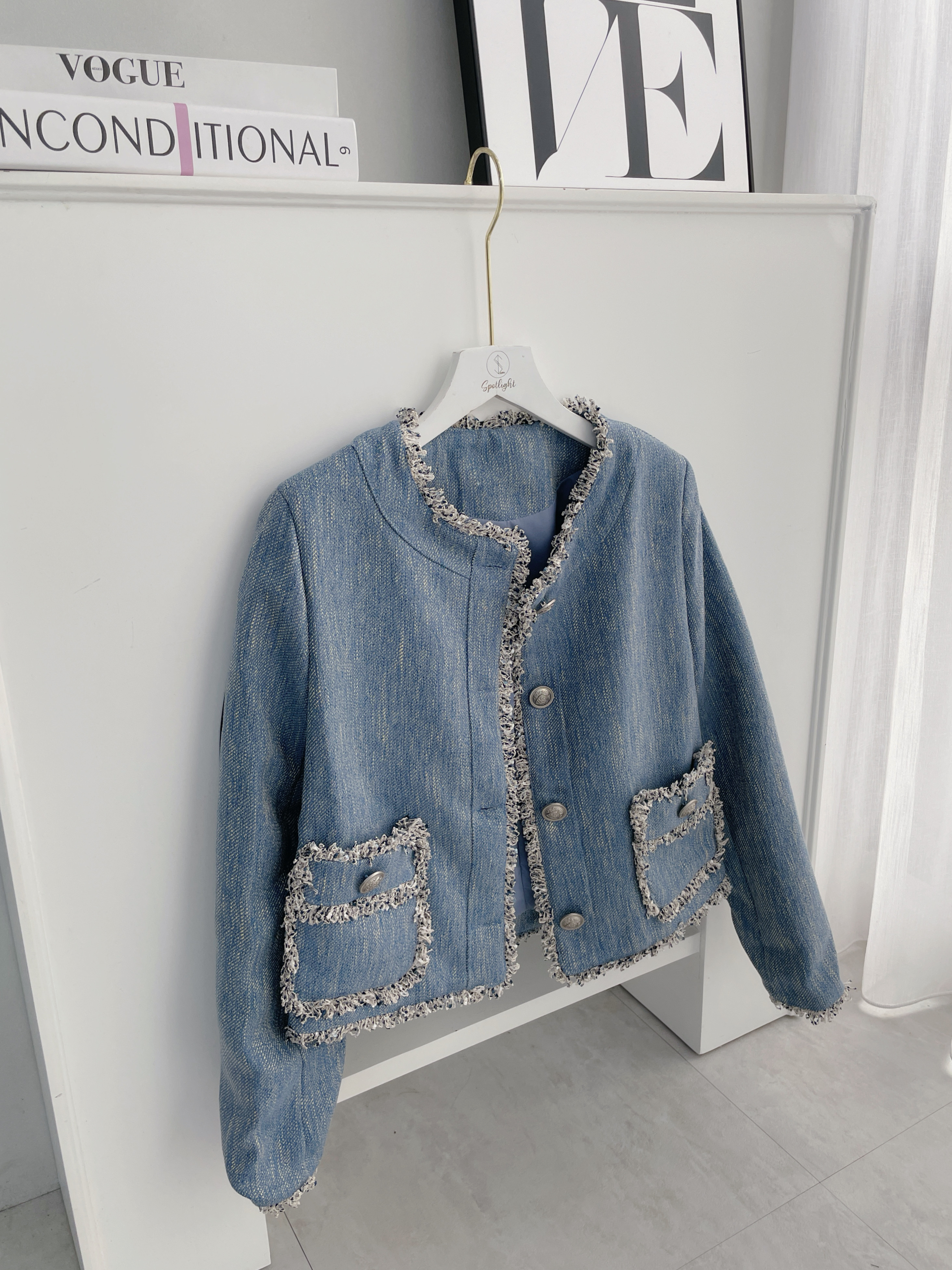 藍系優雅 小香鬚邊雙口袋外套