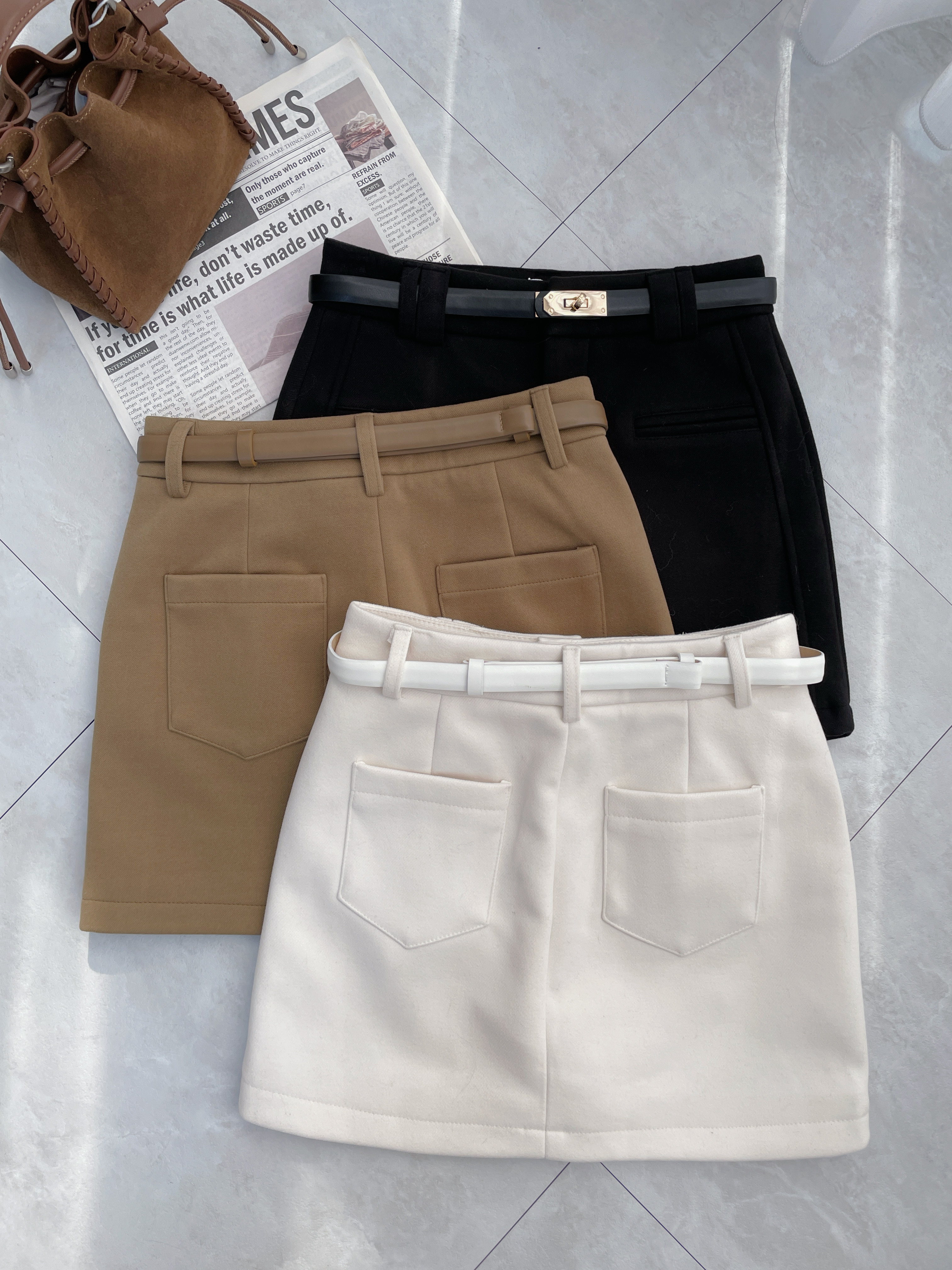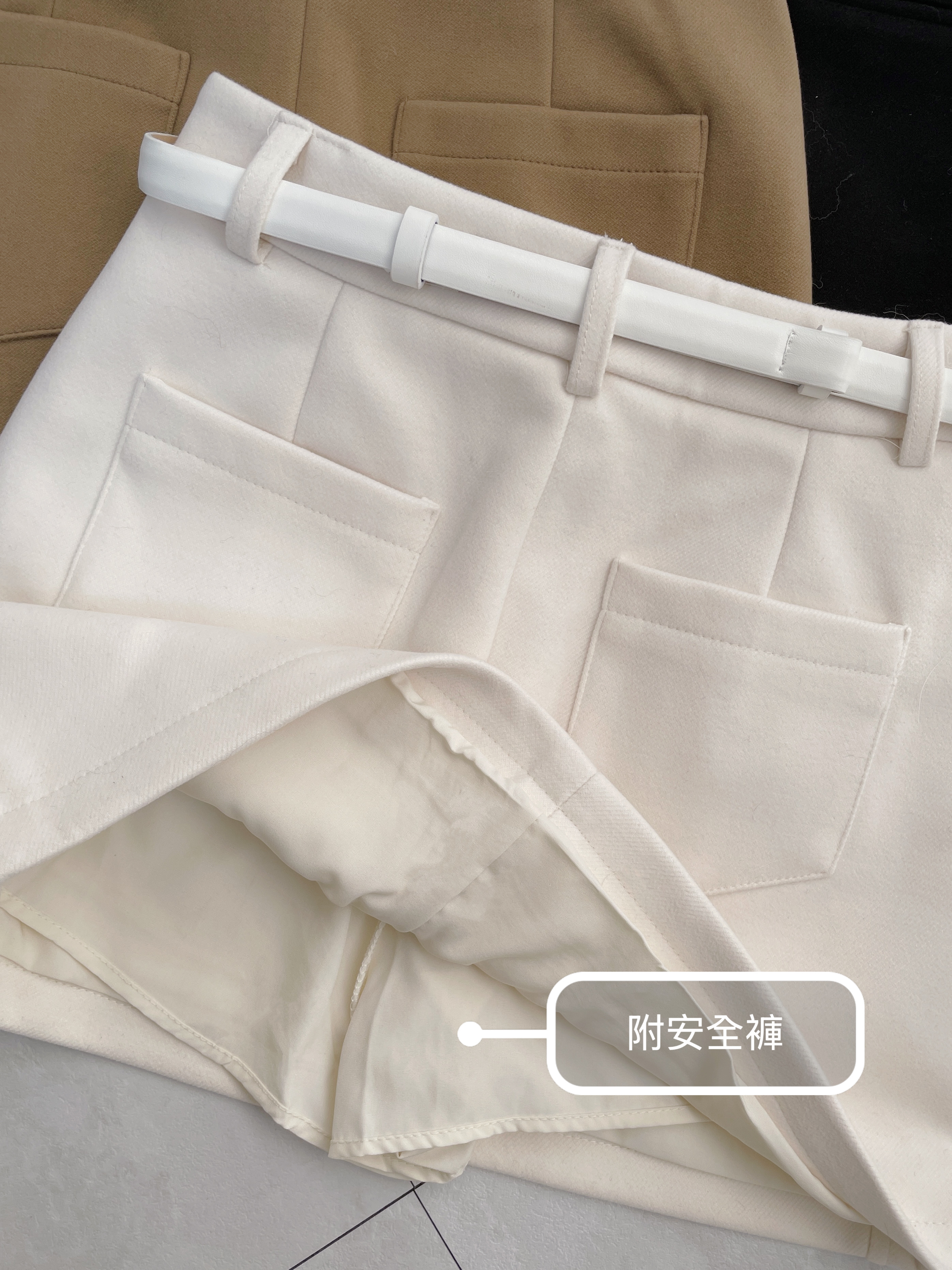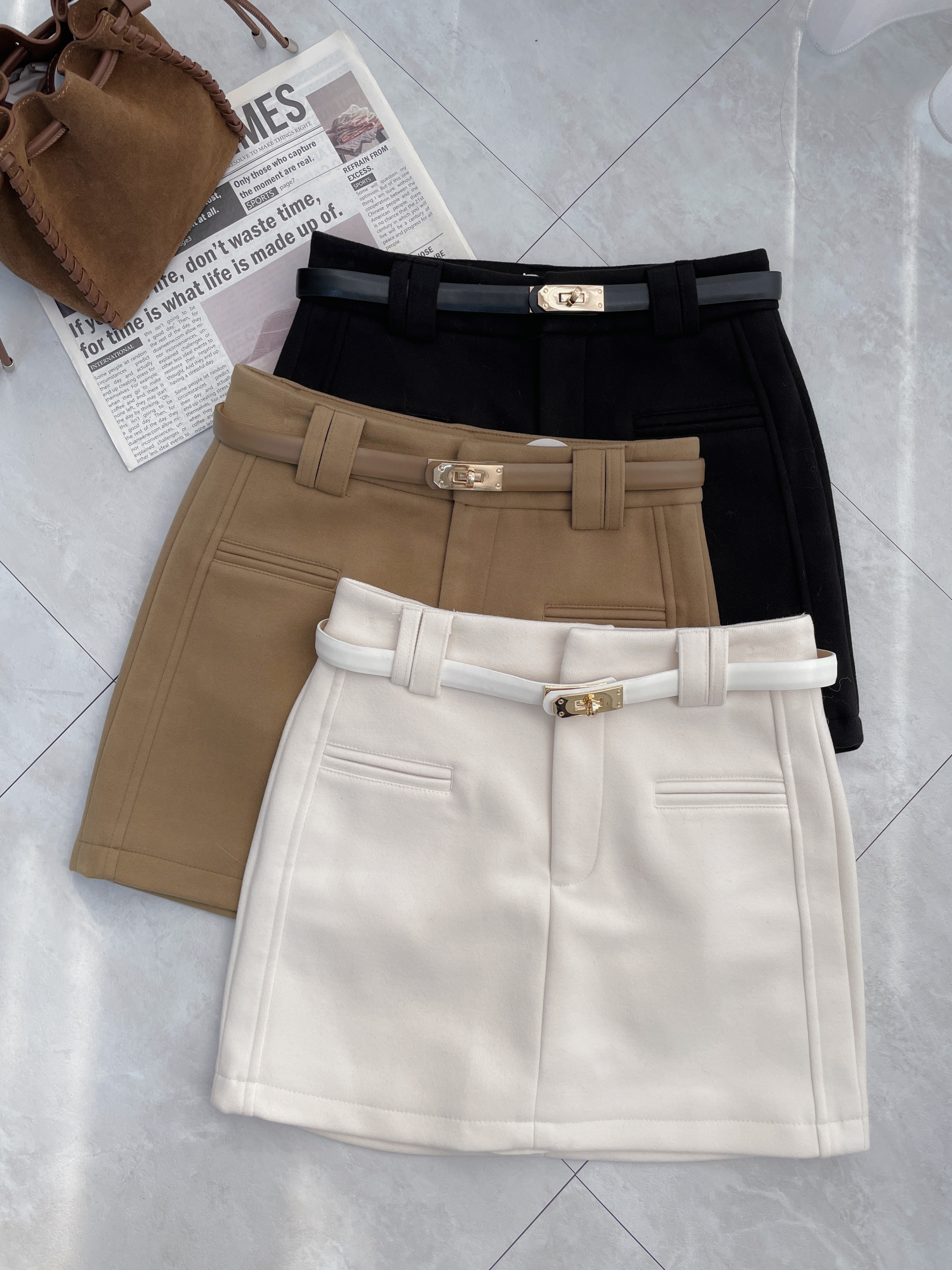 顯瘦必備 附金環腰帶假口袋毛呢短裙