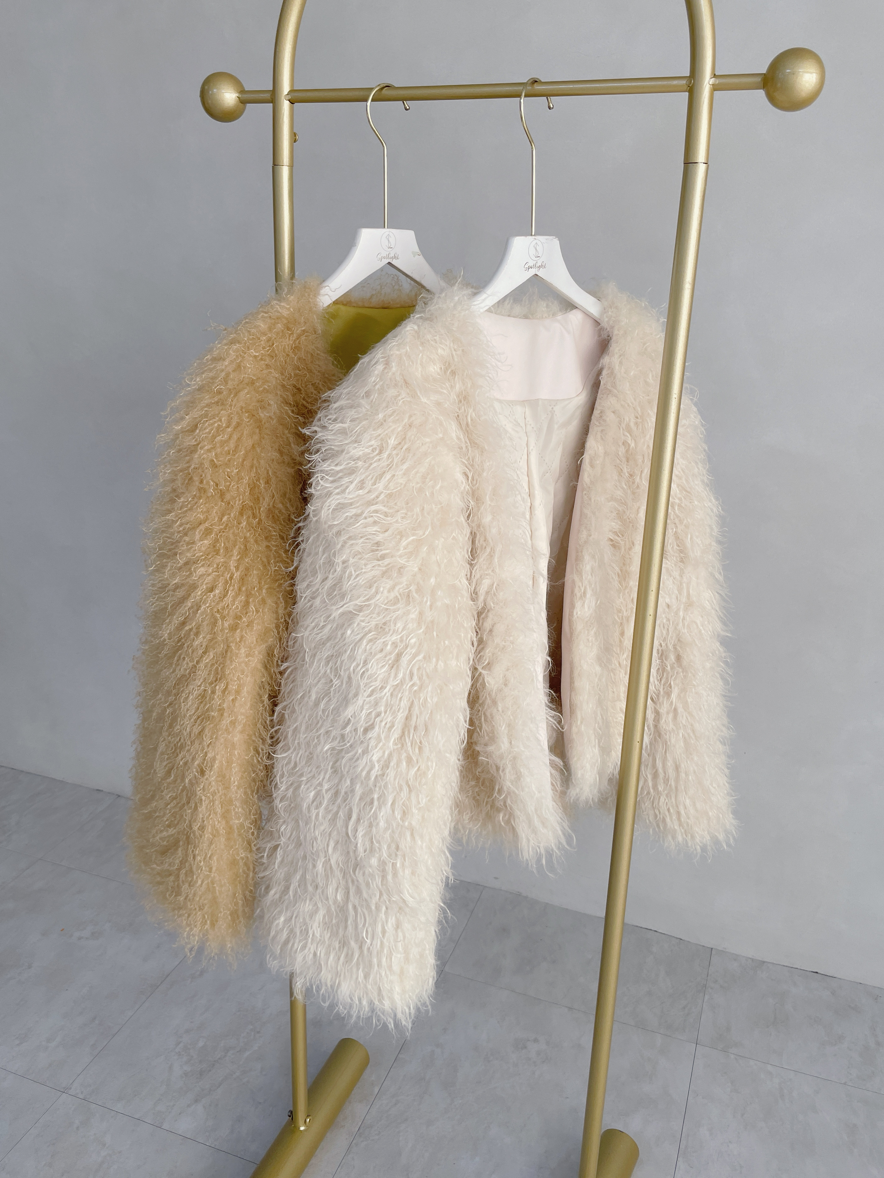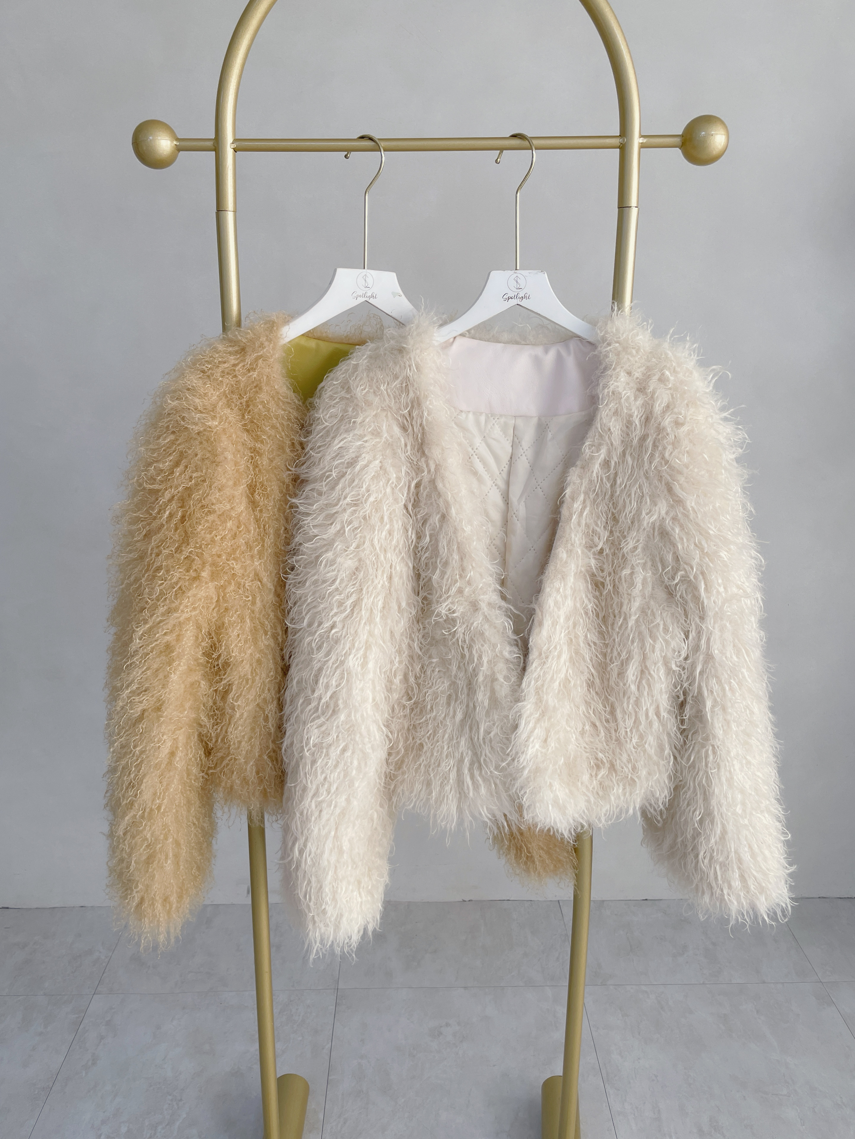 首爾時髦 捲捲毛拼接皮革皮草外套