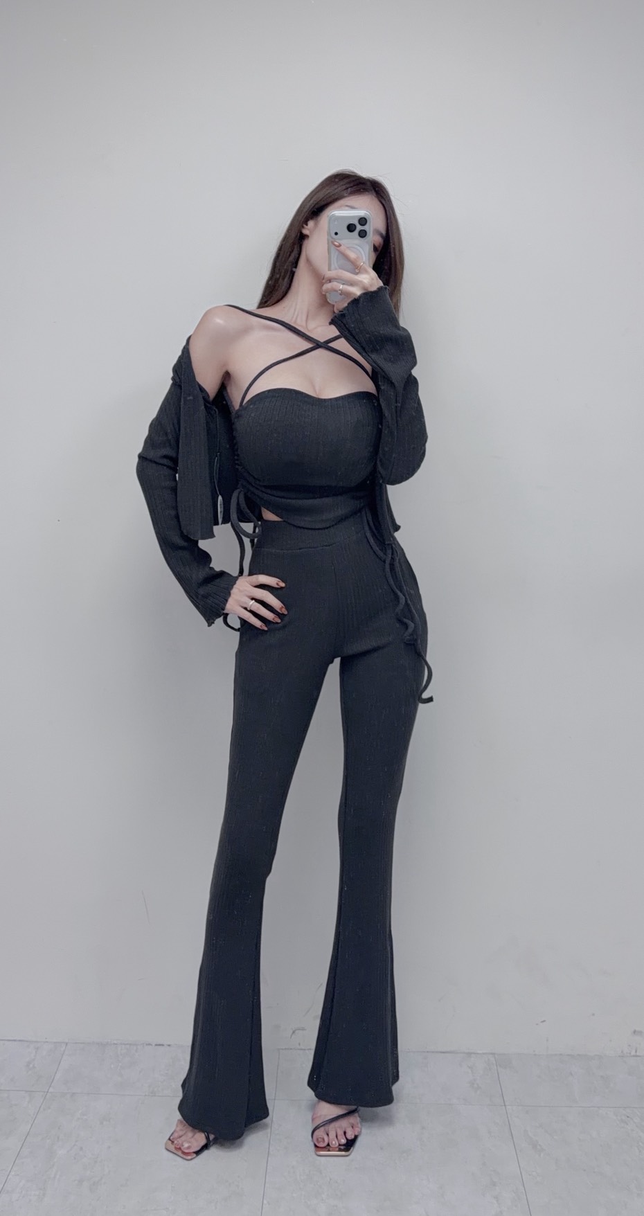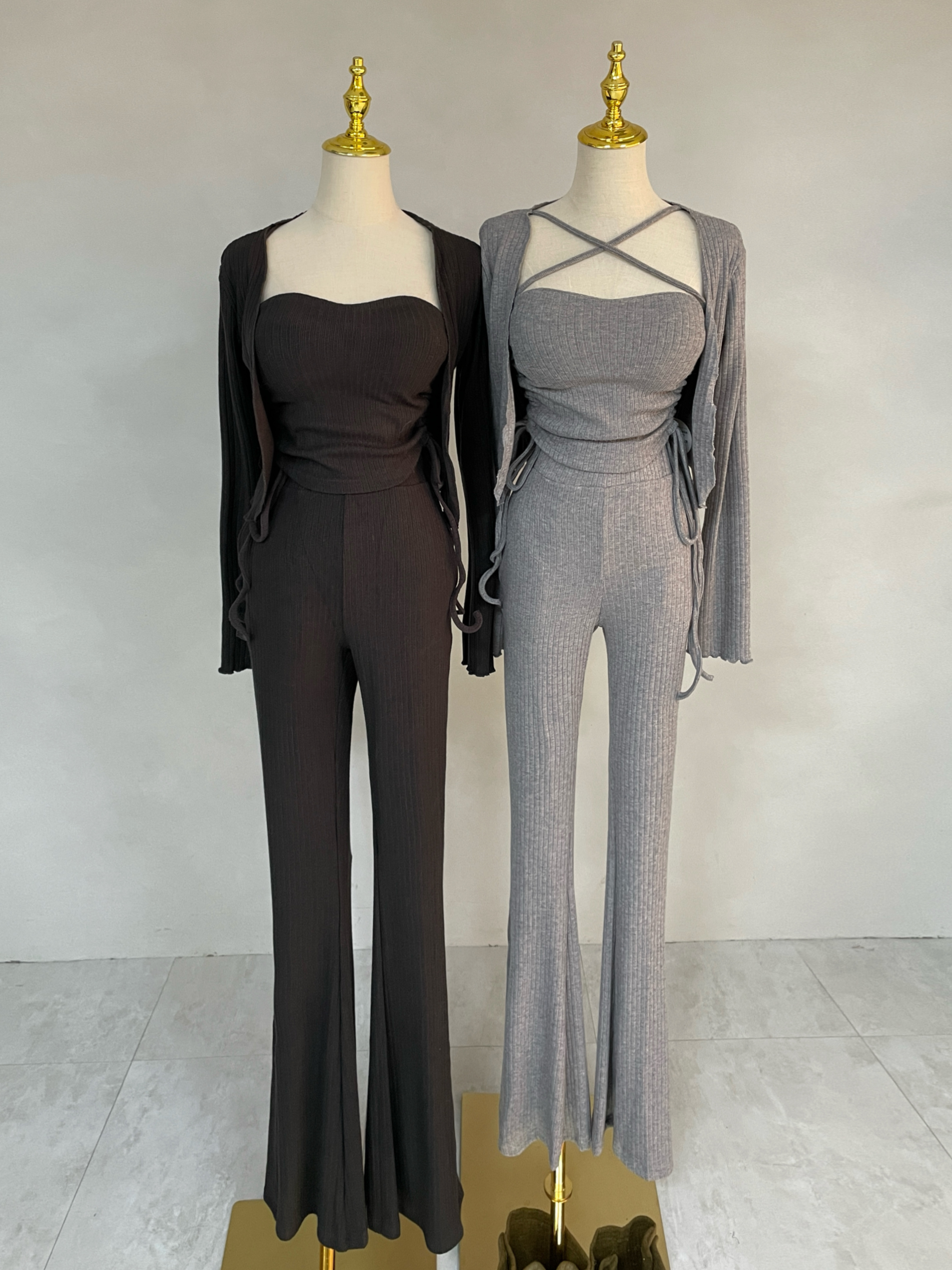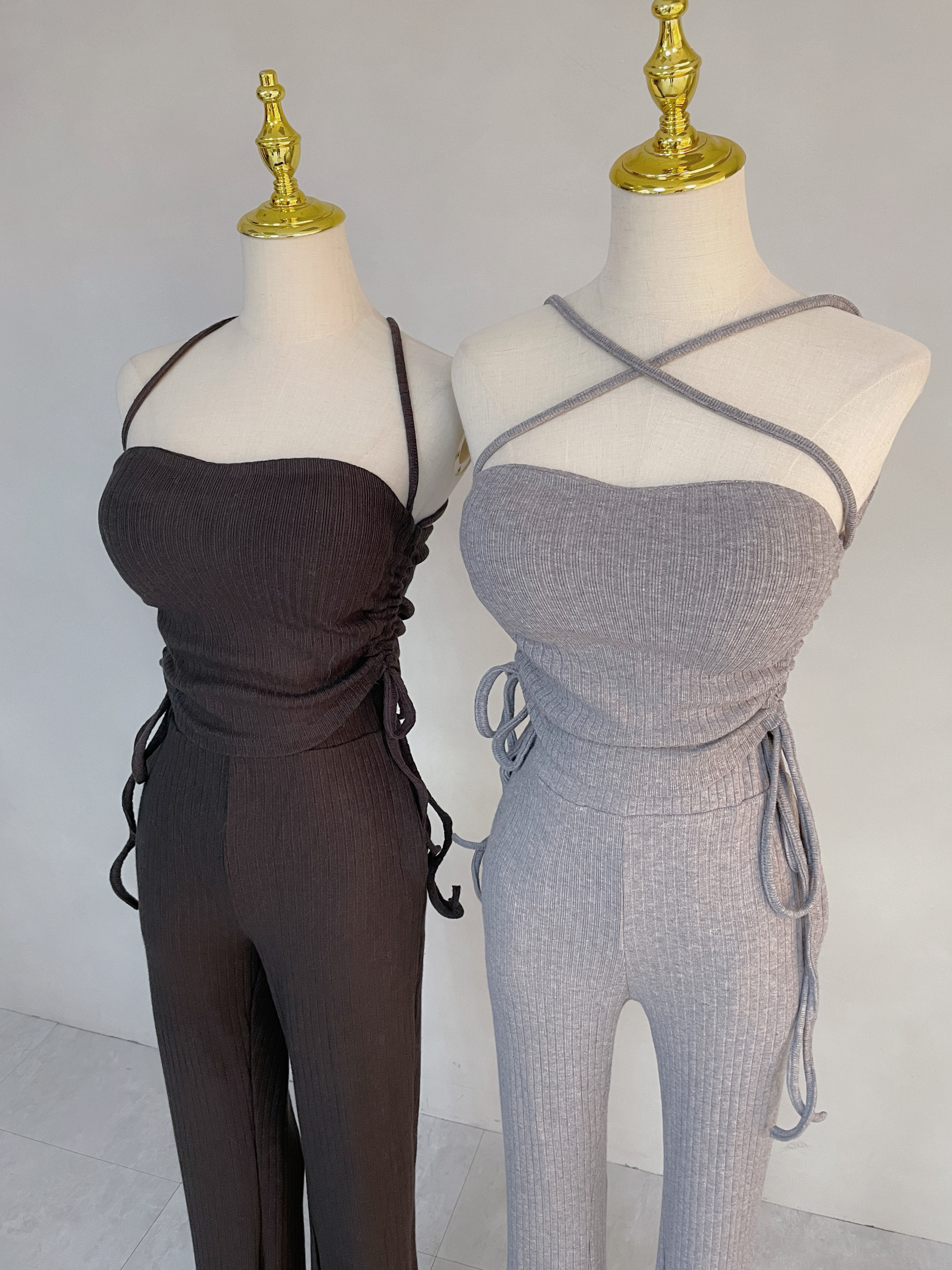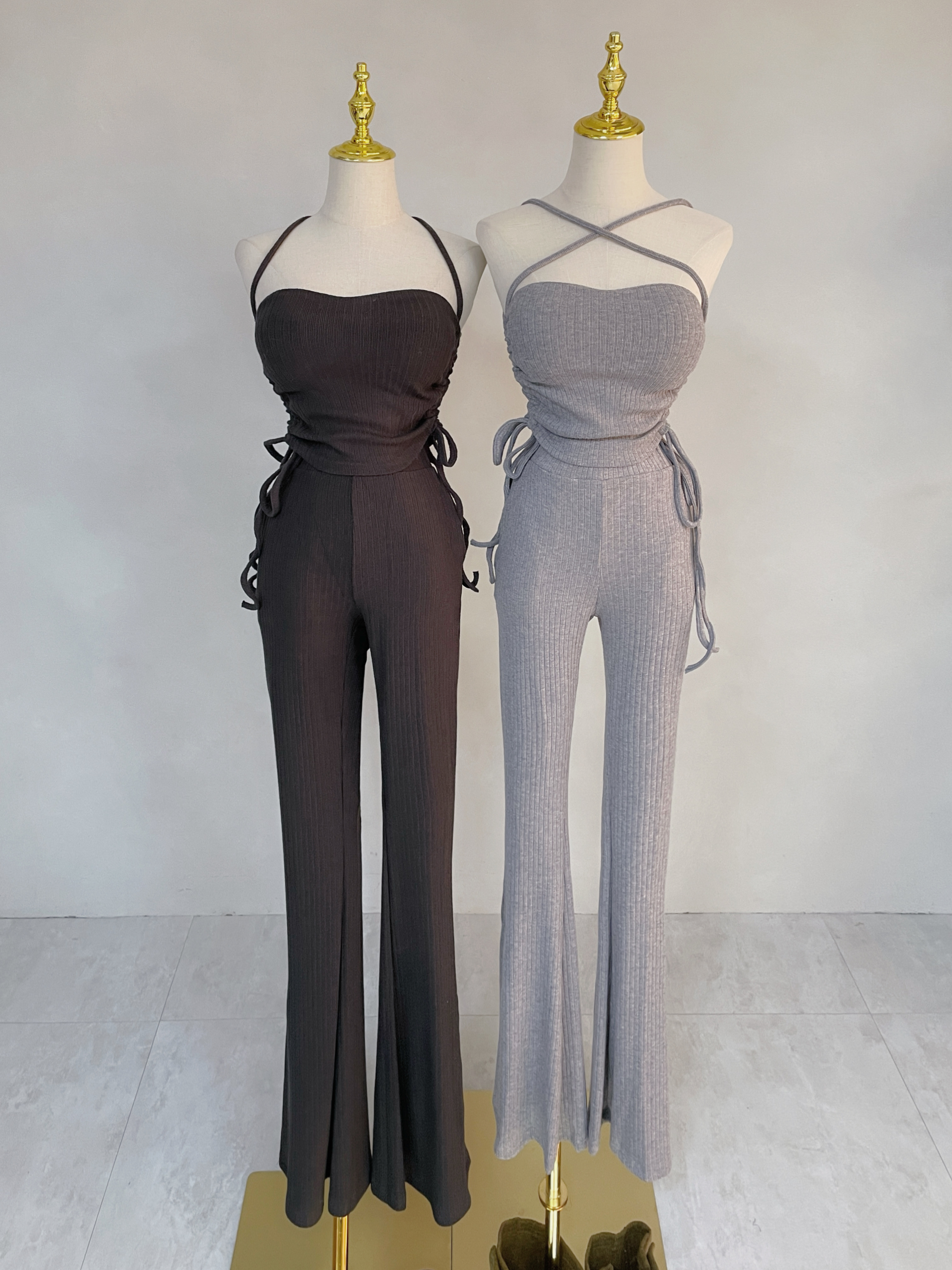 【SET】羅紋繞脖側抽繩背心+喇叭褲+罩衫