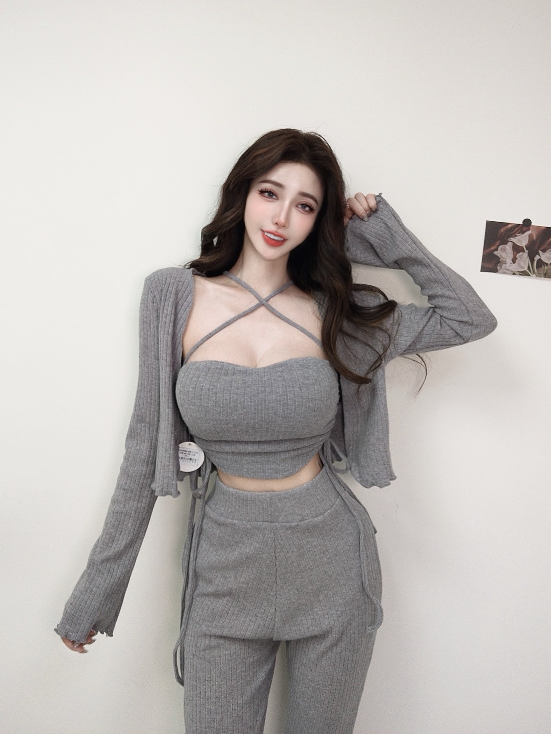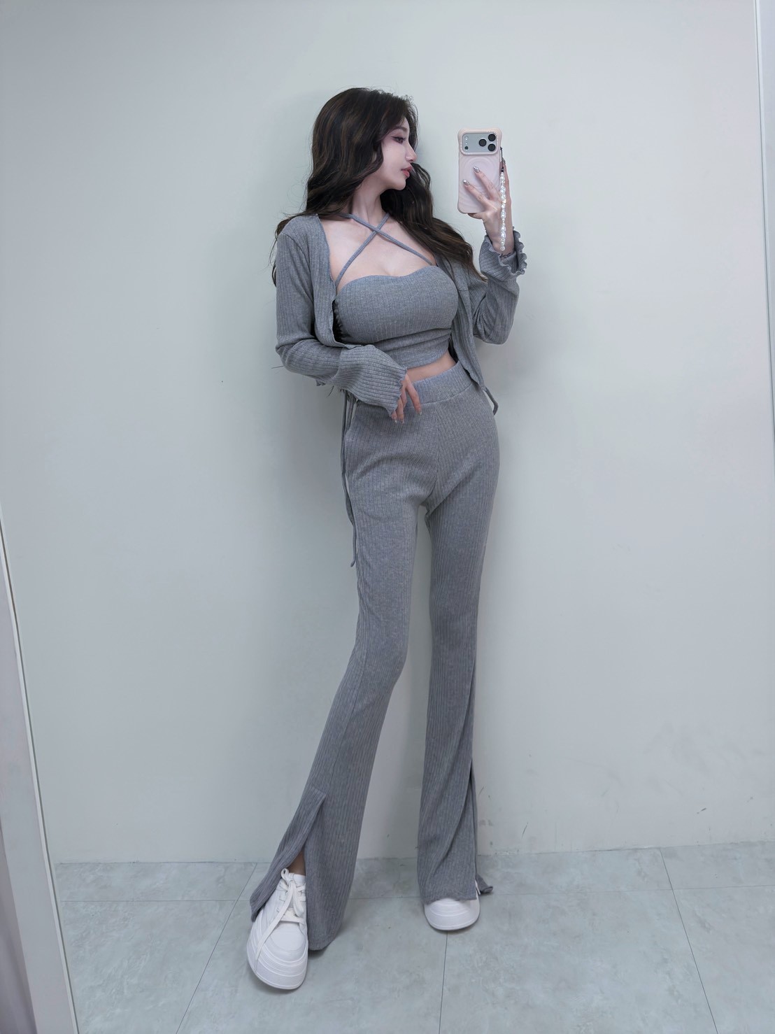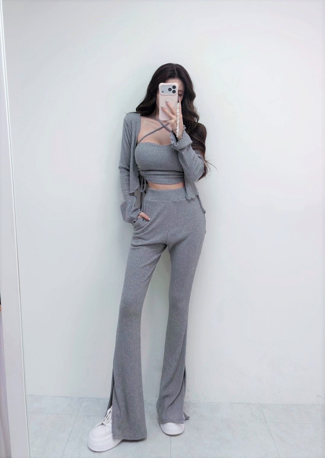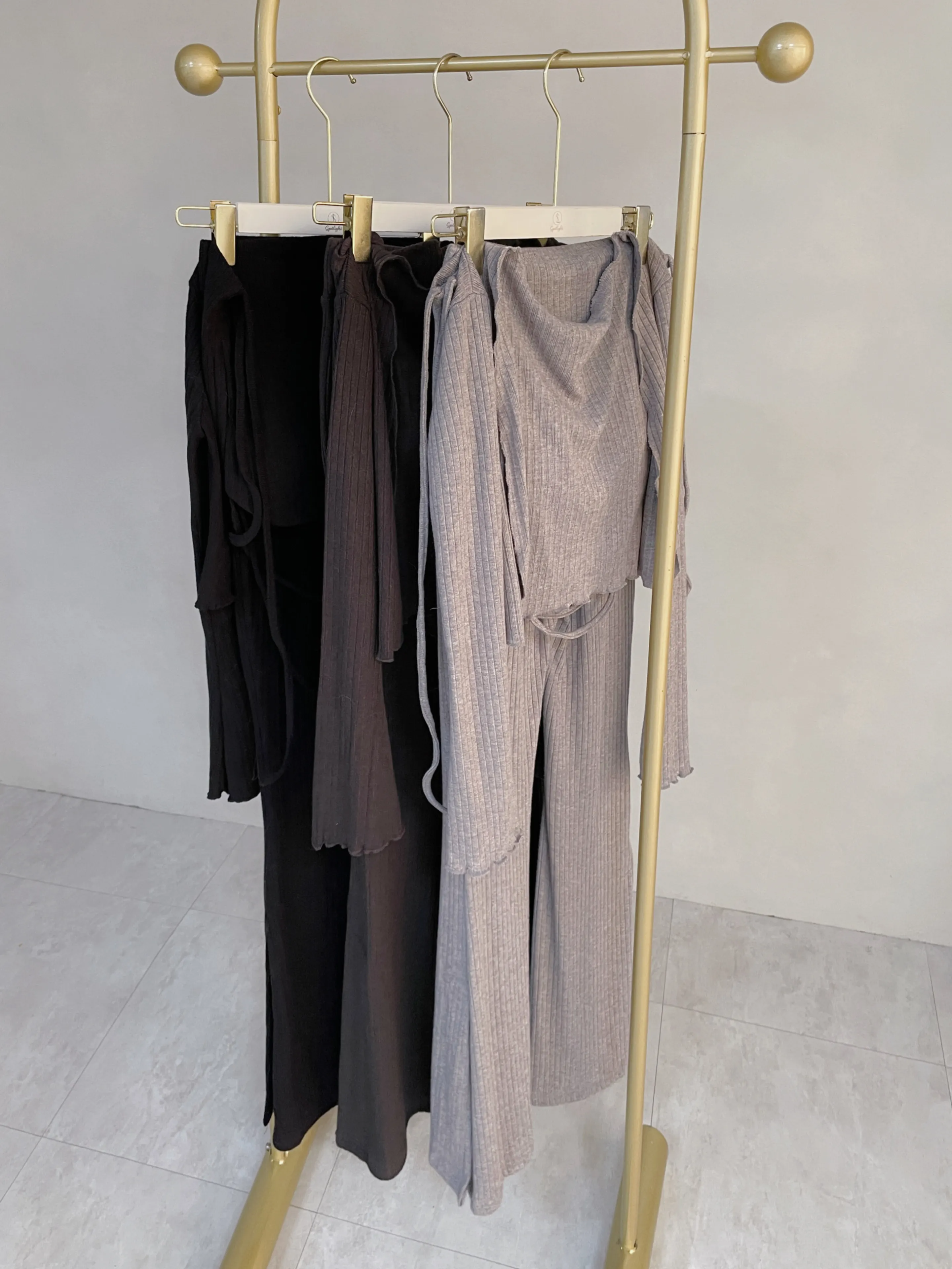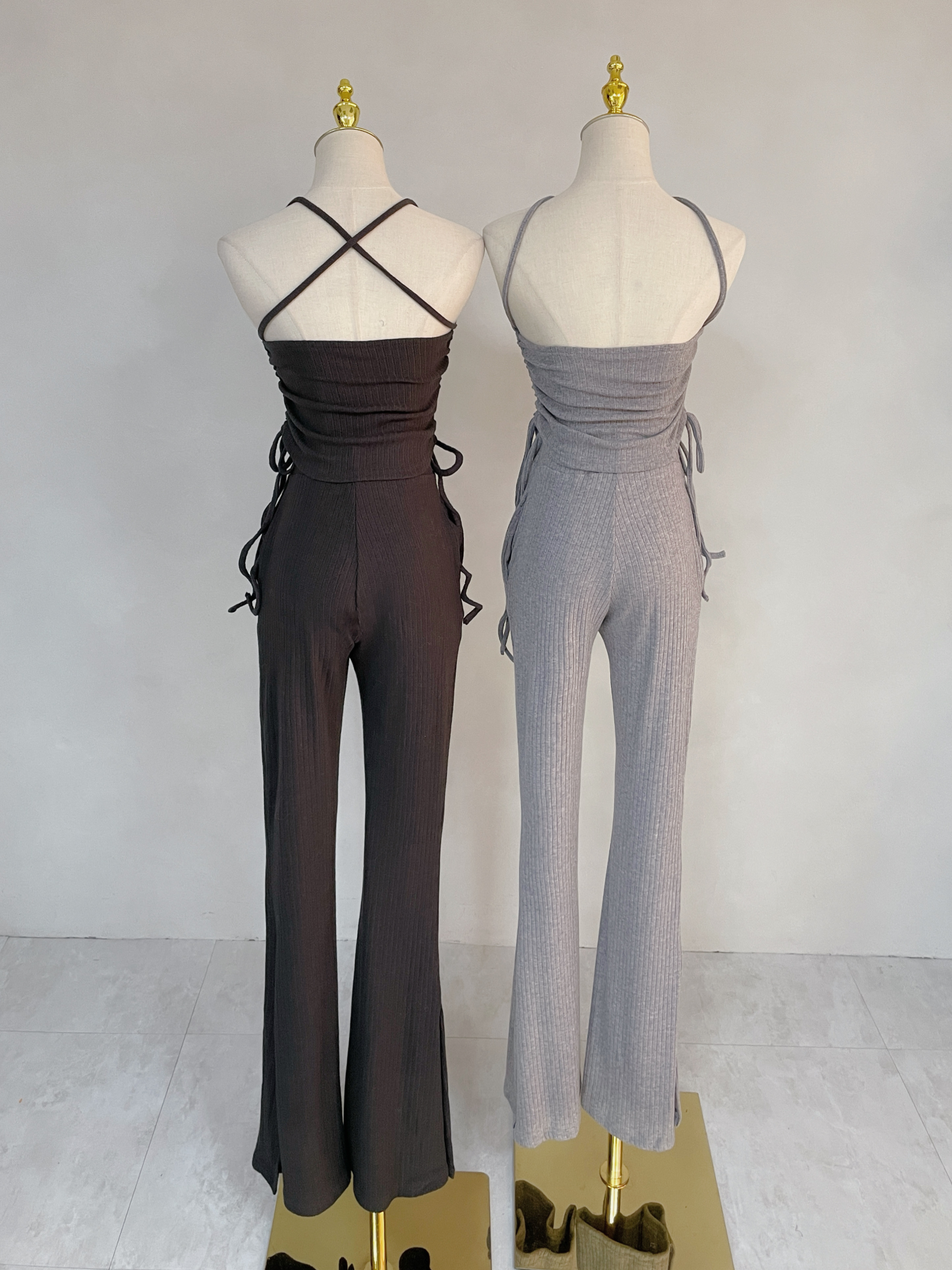 【SET】羅紋繞脖側抽繩背心+喇叭褲+罩衫