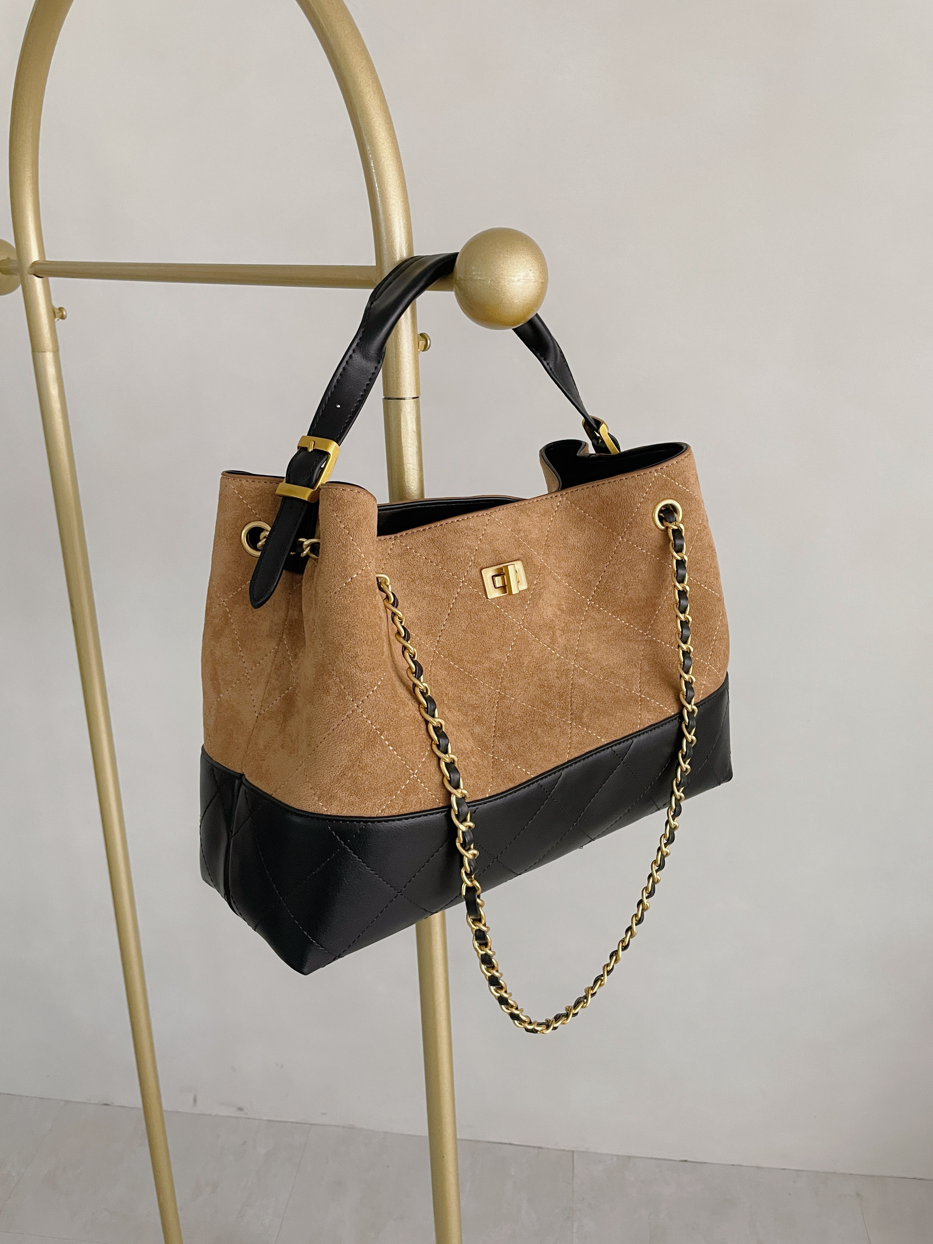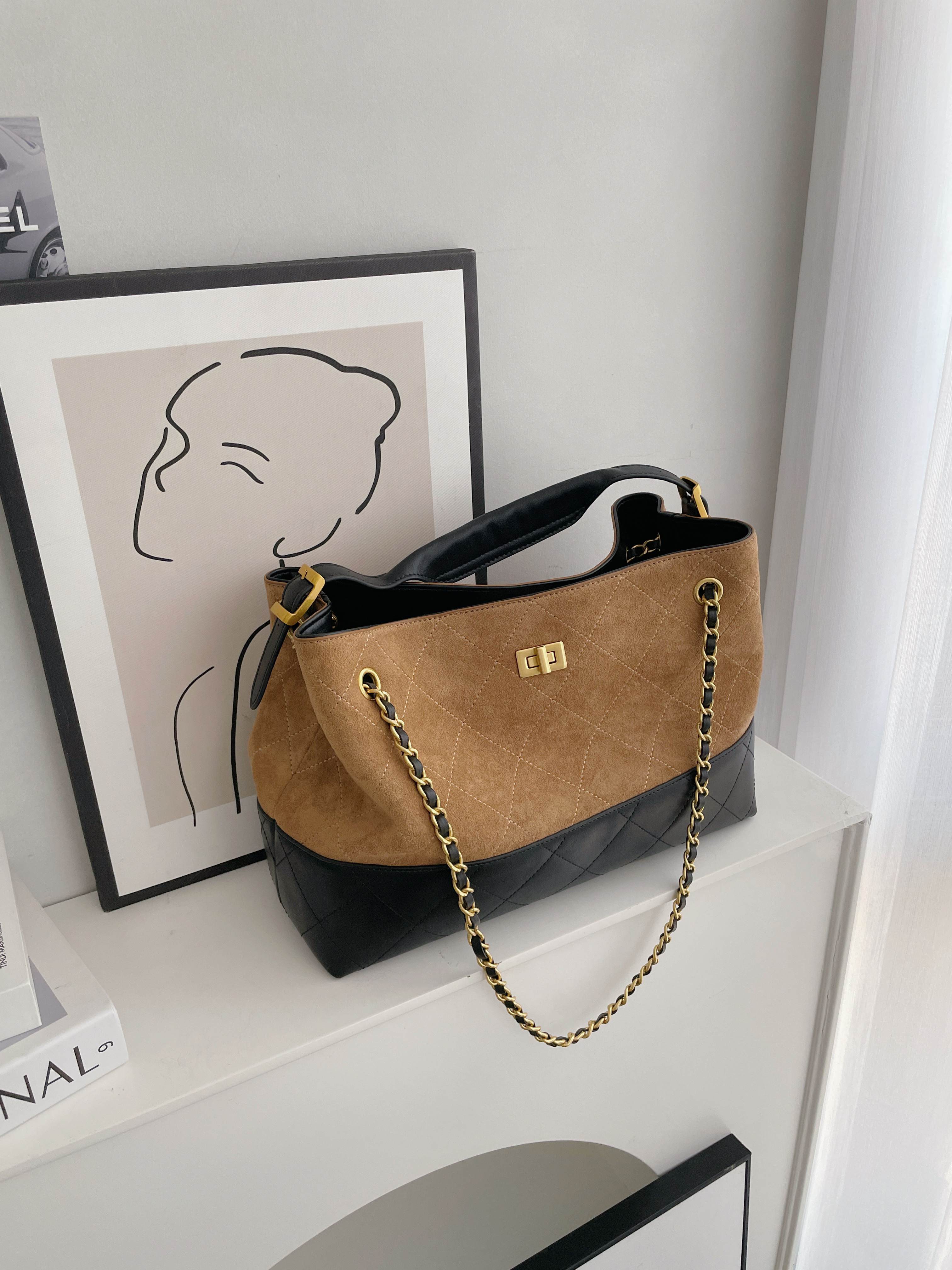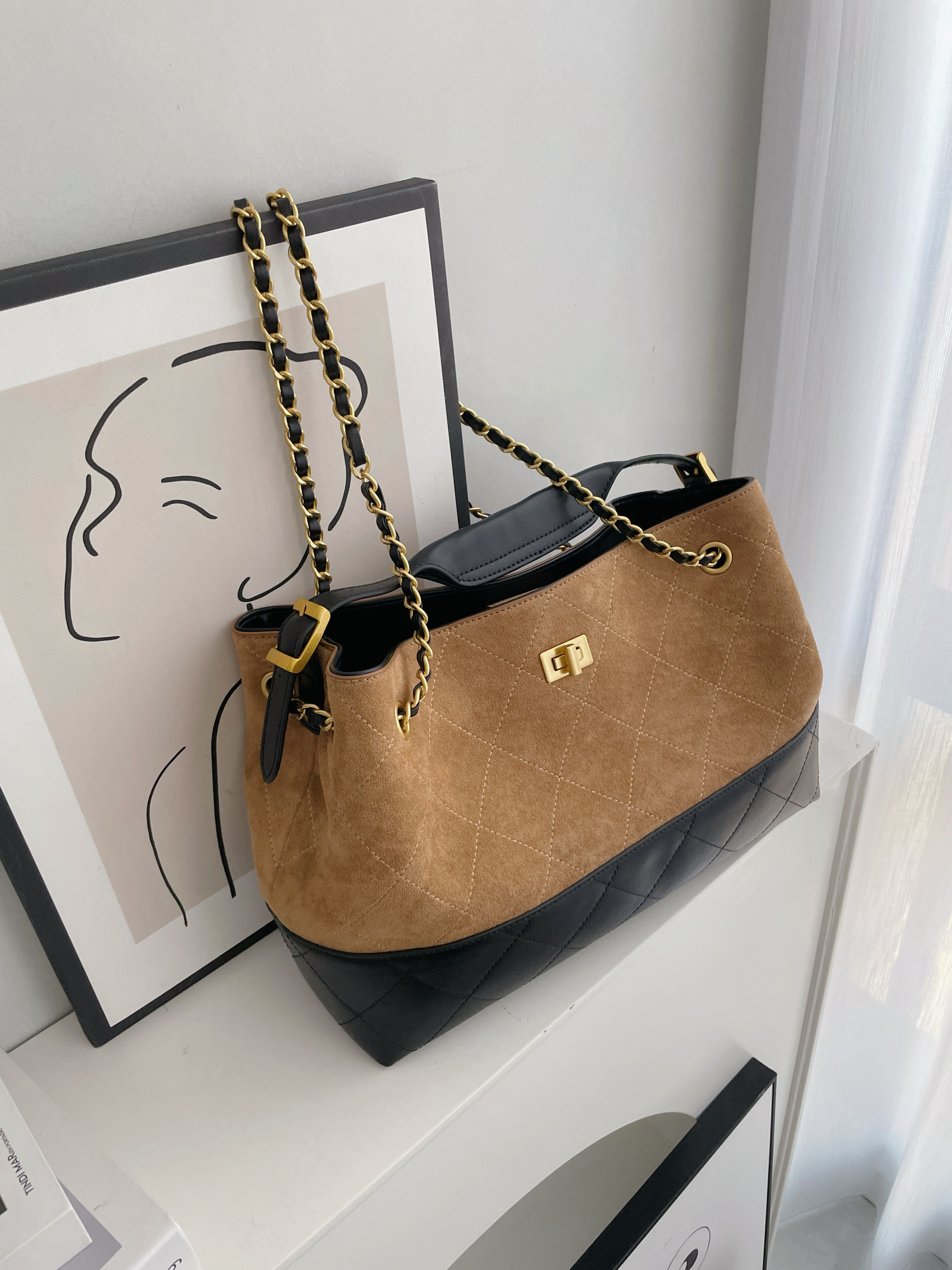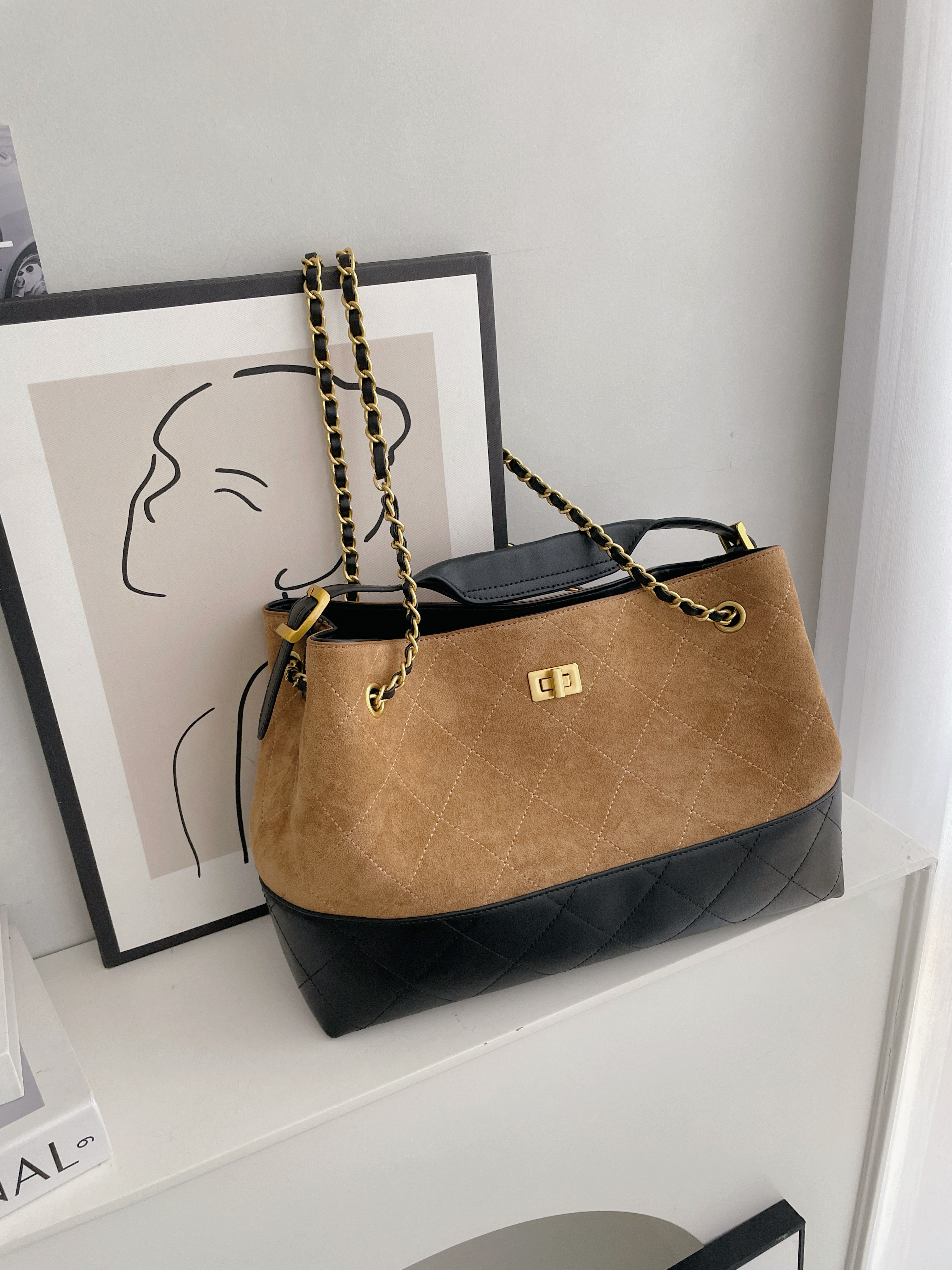 撞色麂皮拼接皮革金鏈包