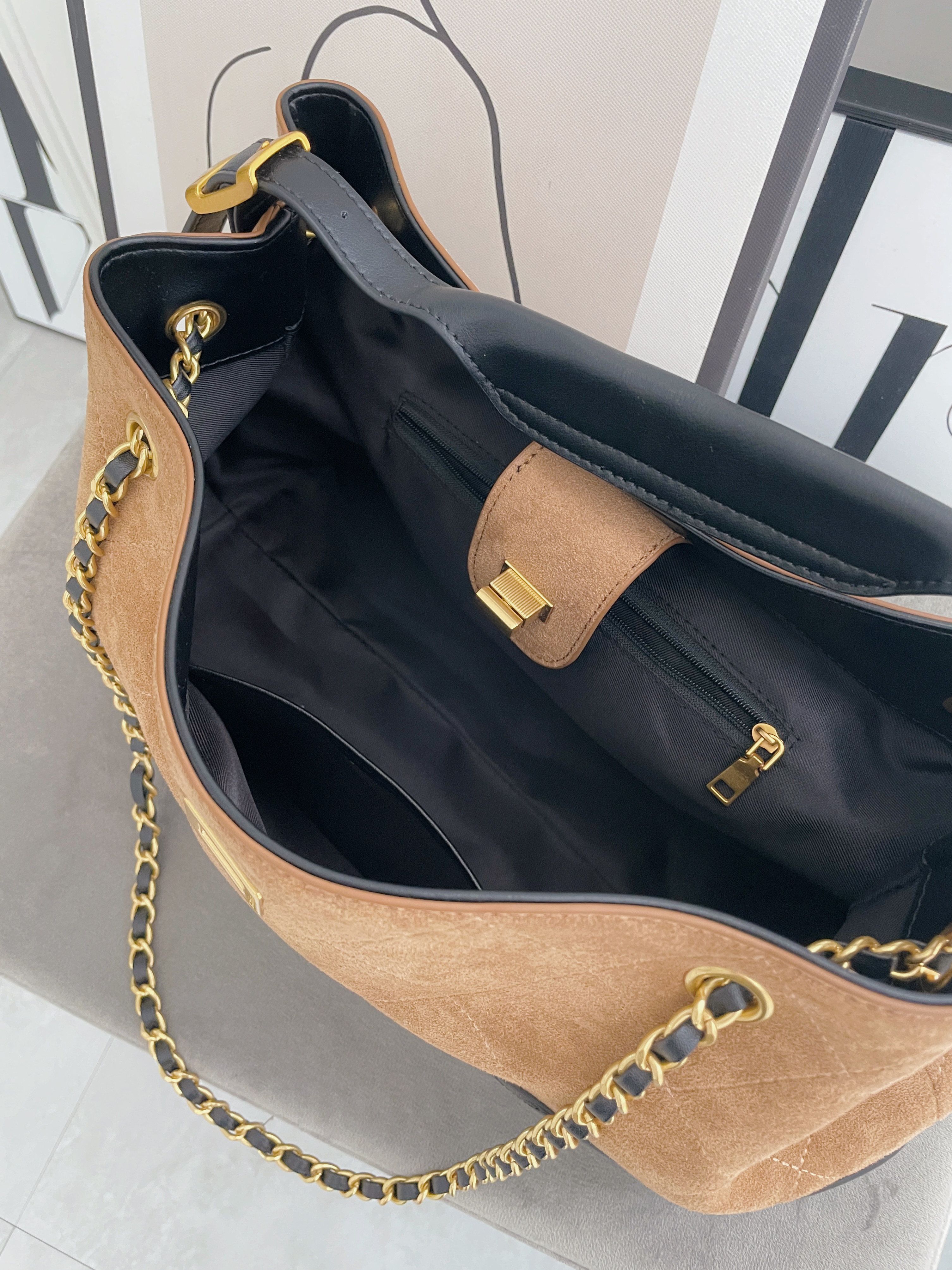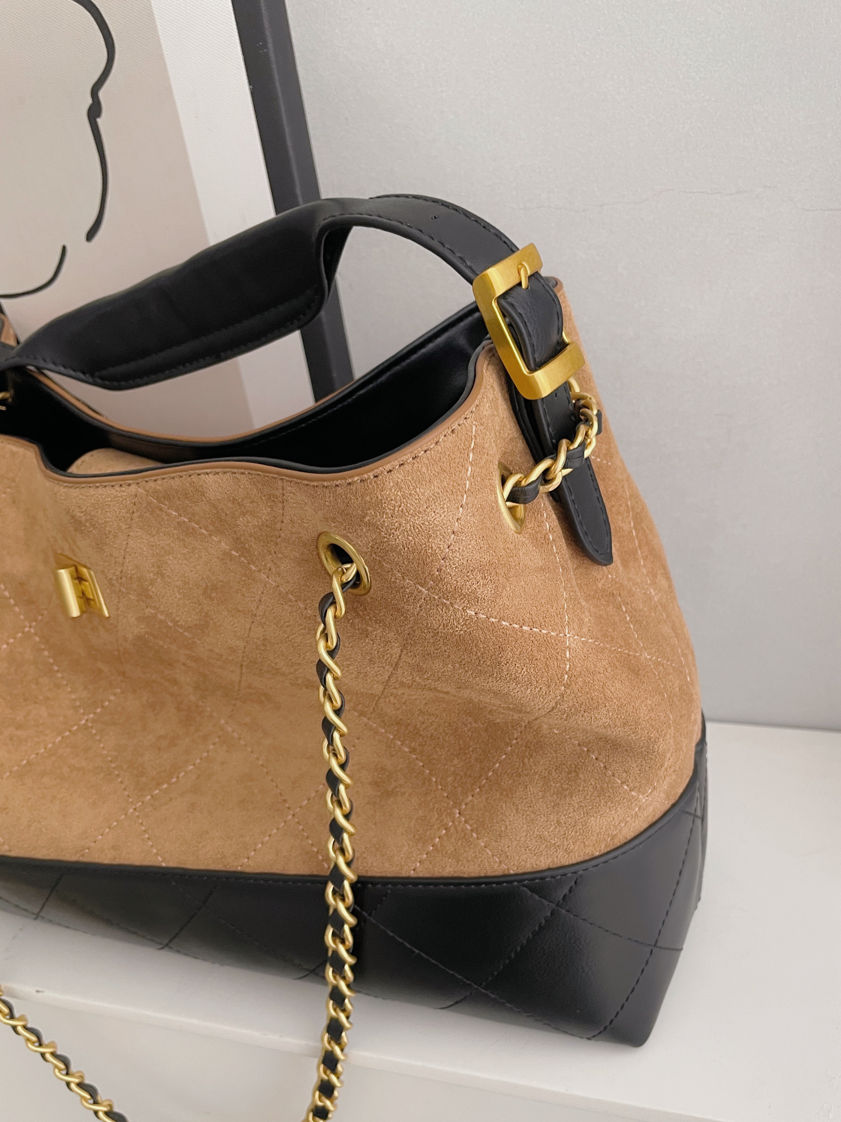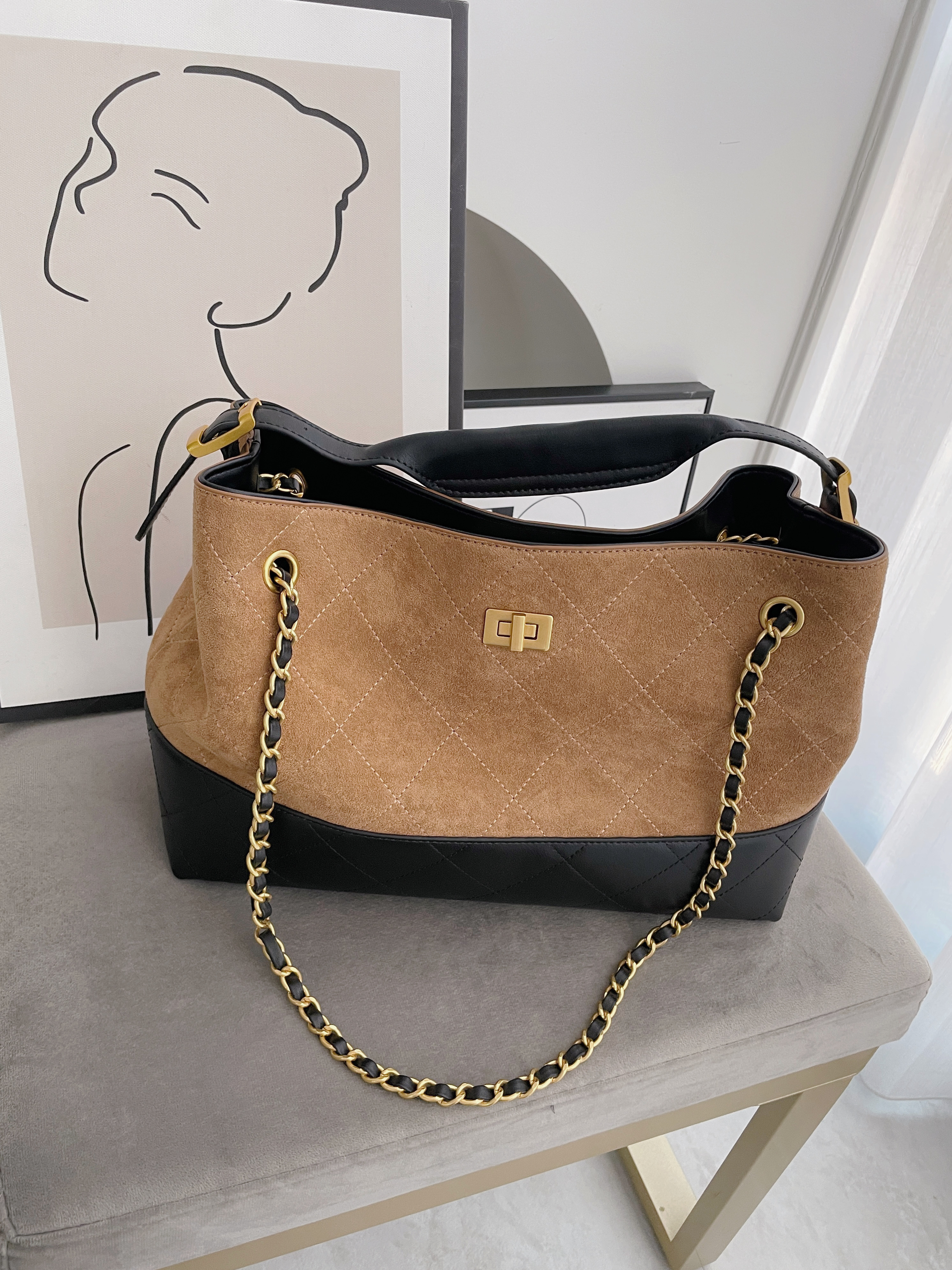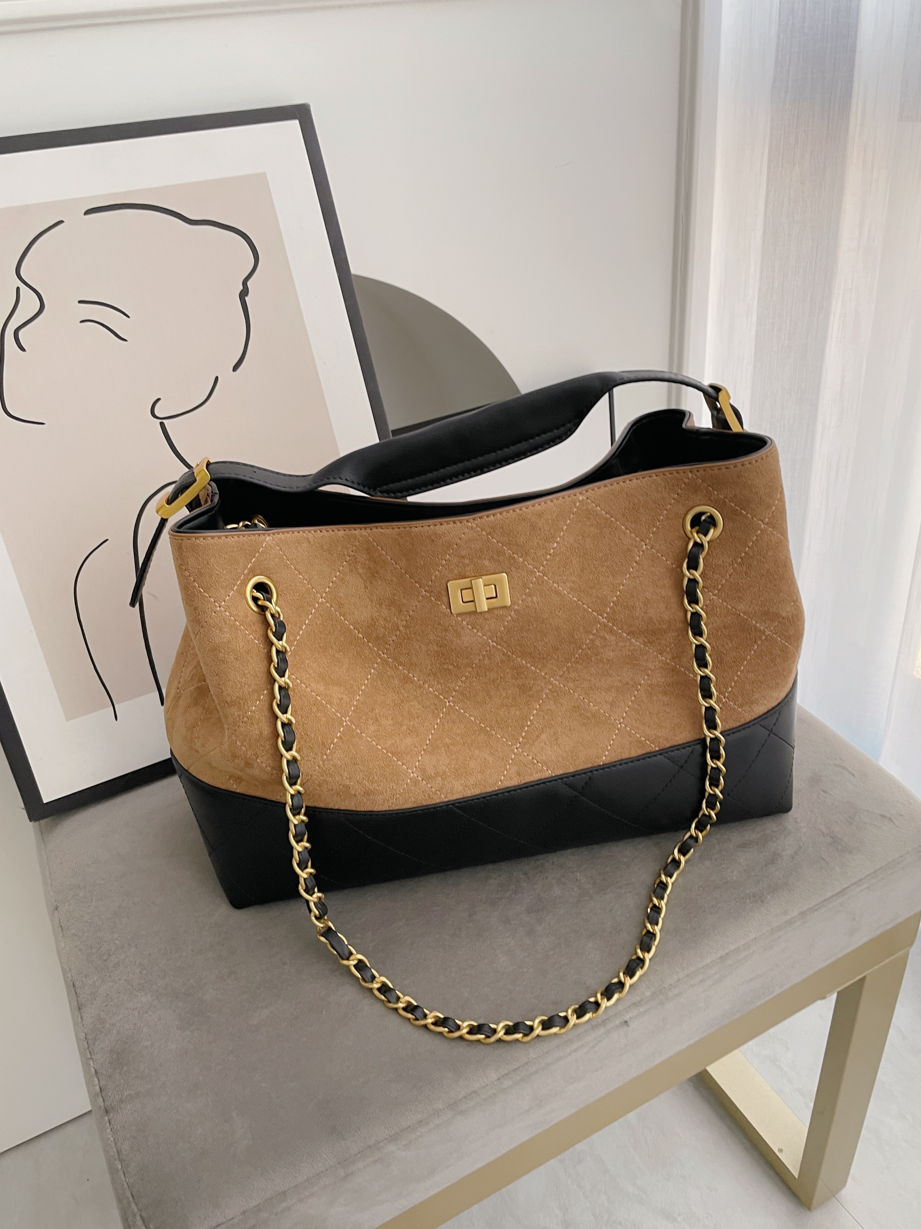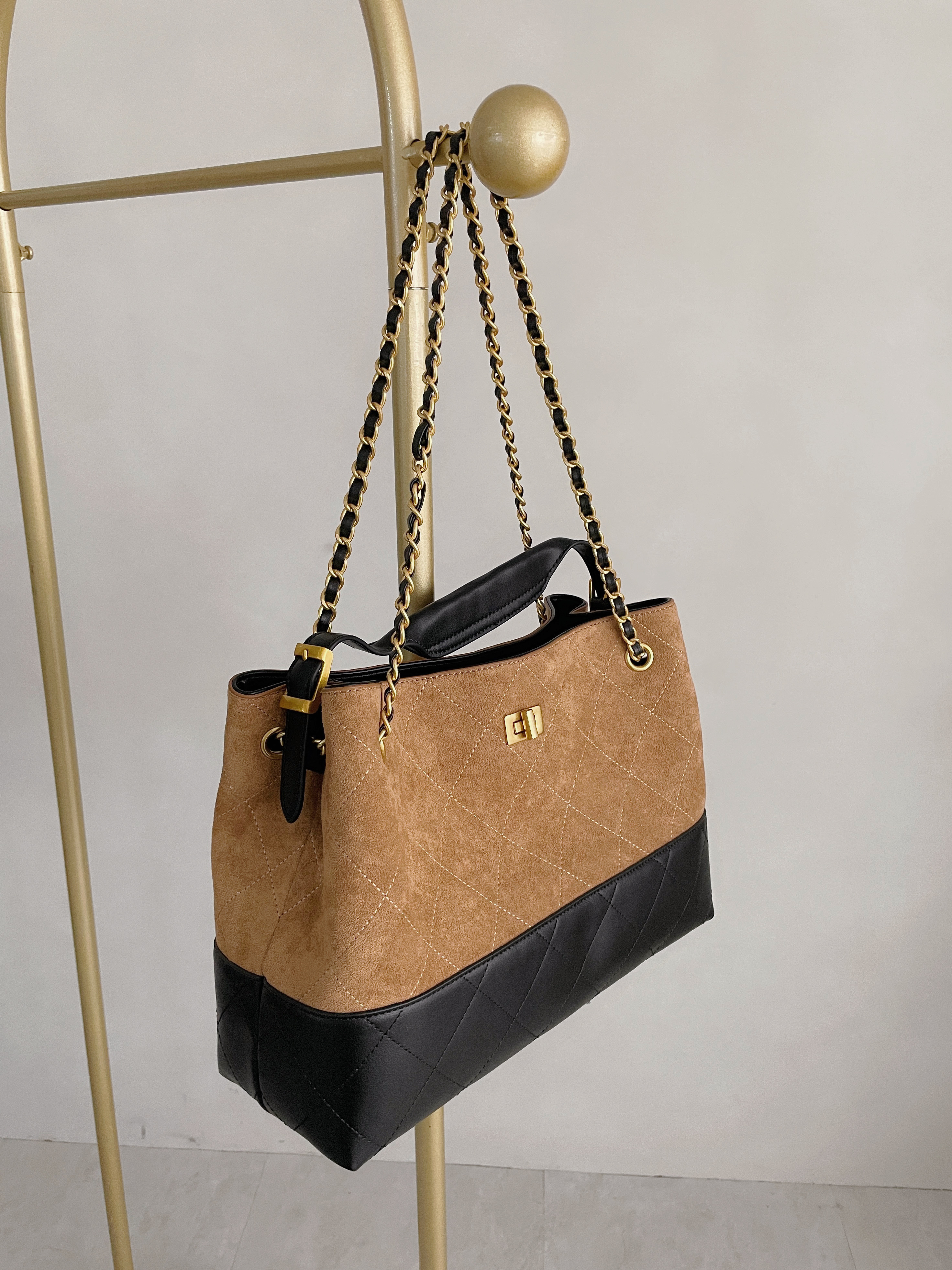 撞色麂皮拼接皮革金鏈包