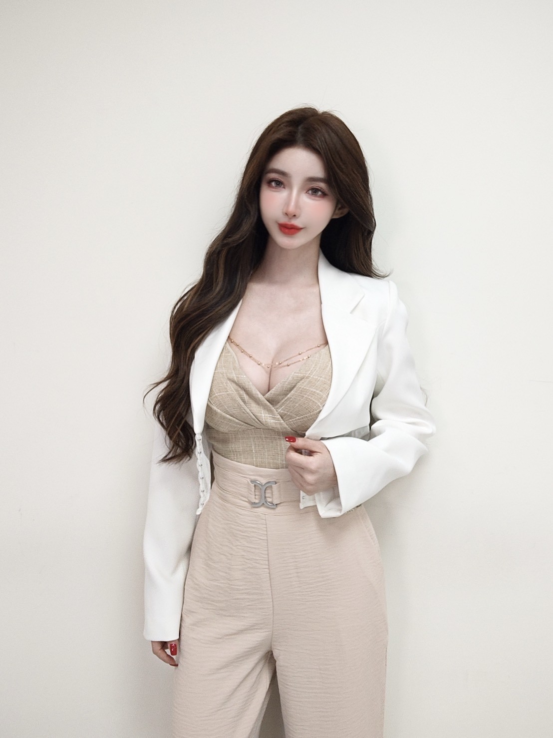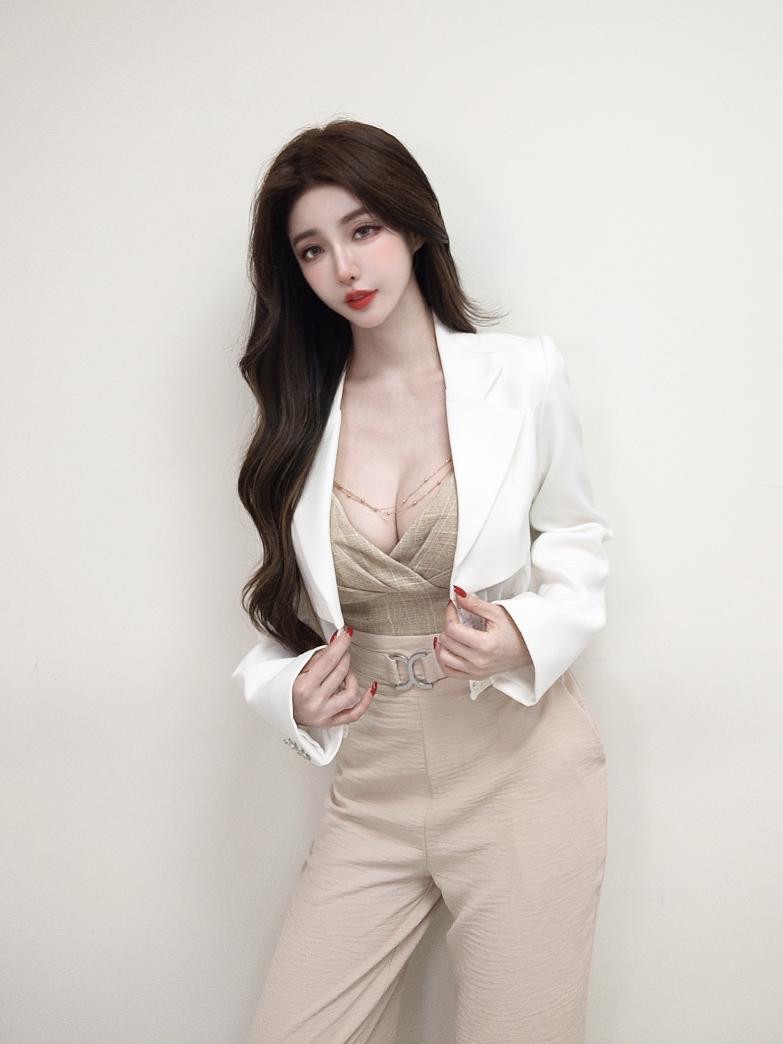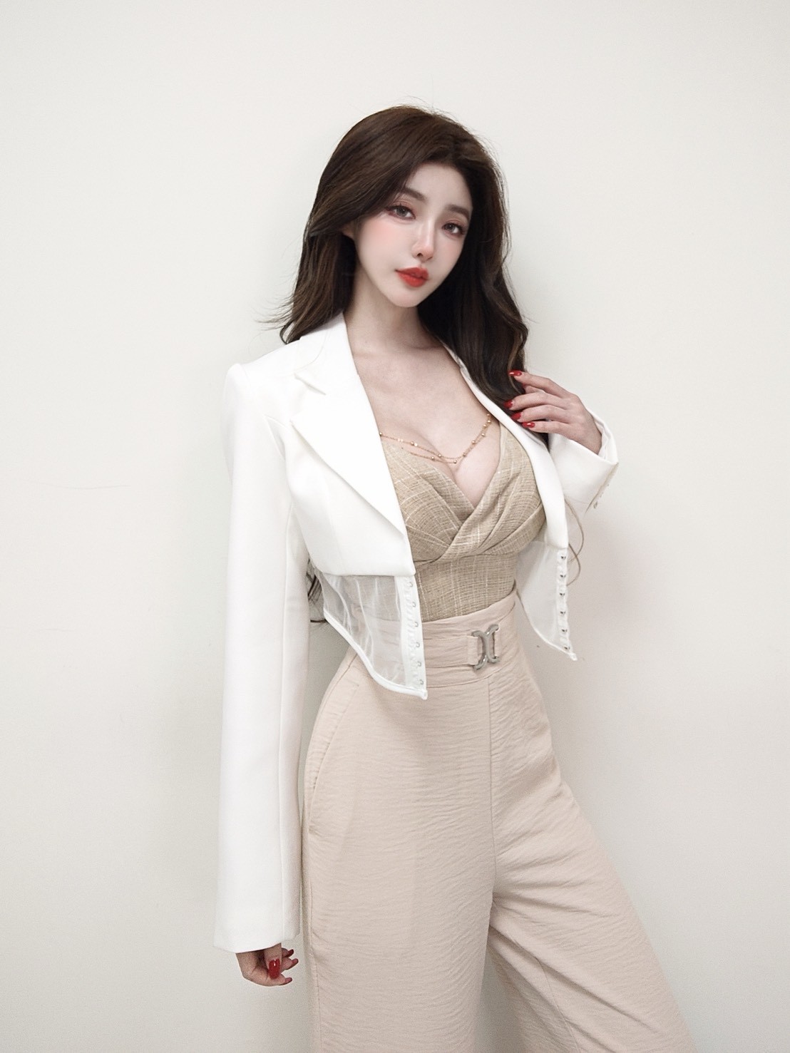 採用經典短版西裝翻領剪裁,正面下襬以弧形透紗結合勾釦細節設計,於俐落線條中增添精緻層次,呈現兼具質感與風格的正式造型。
