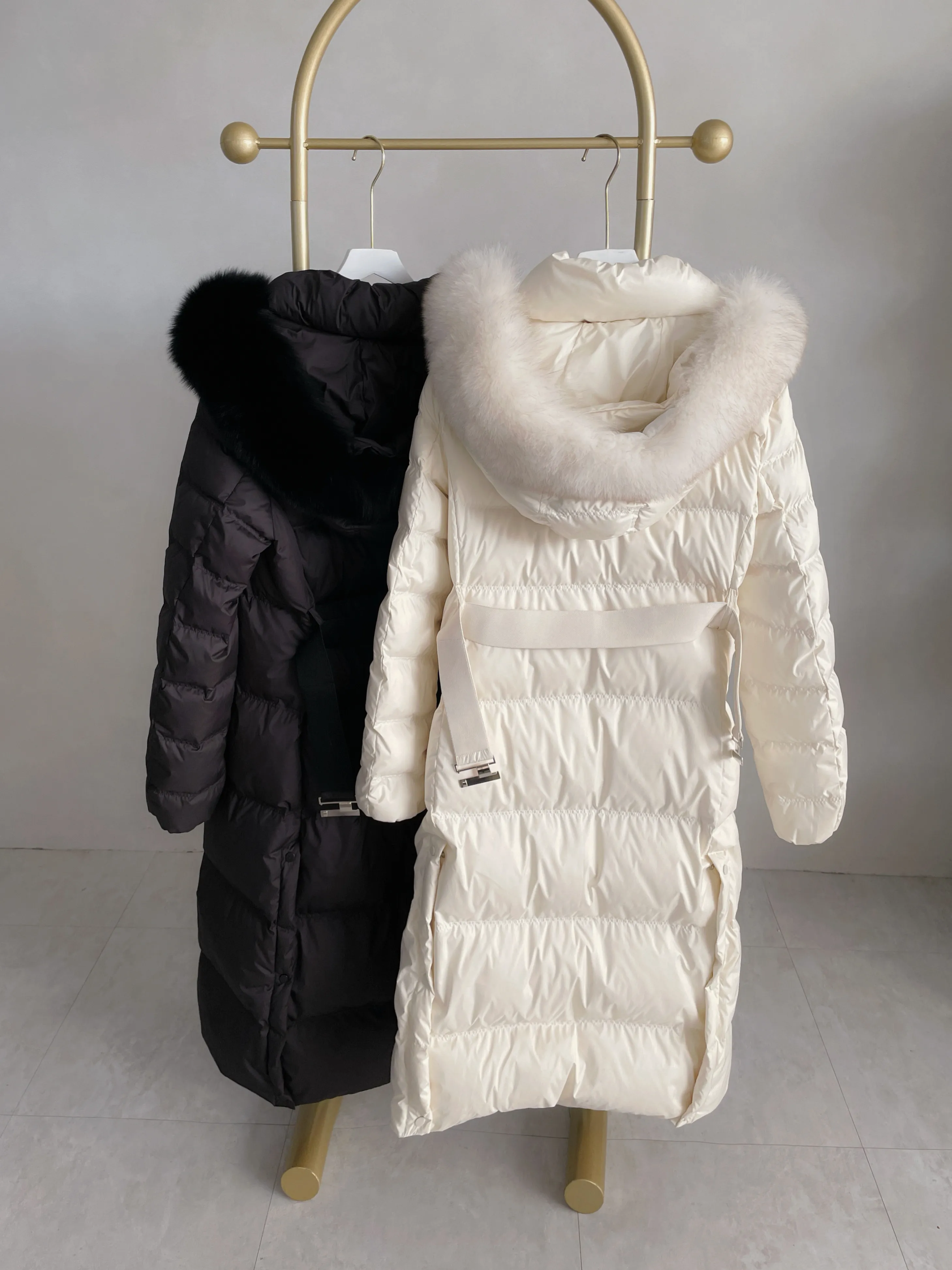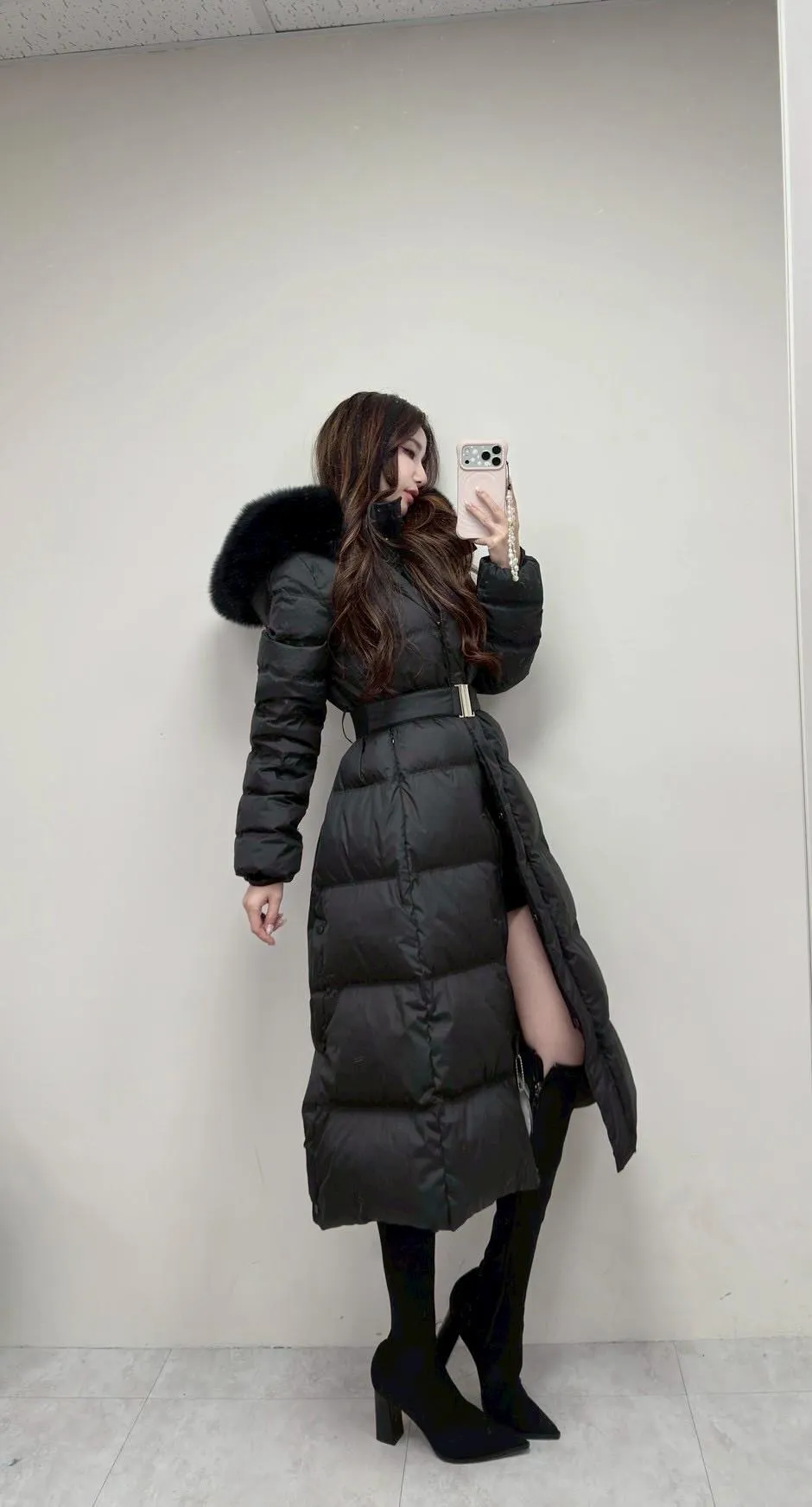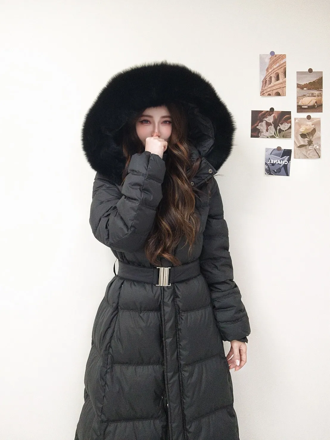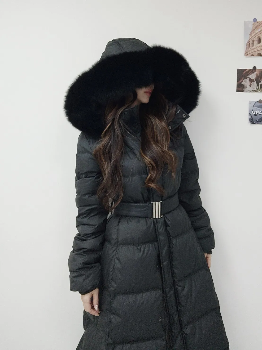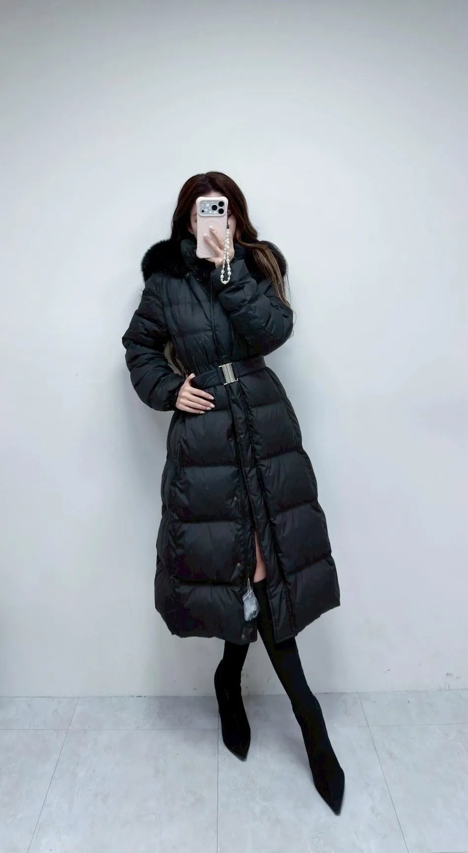 韓國100%鵝絨真狐狸毛長版附腰帶外套
