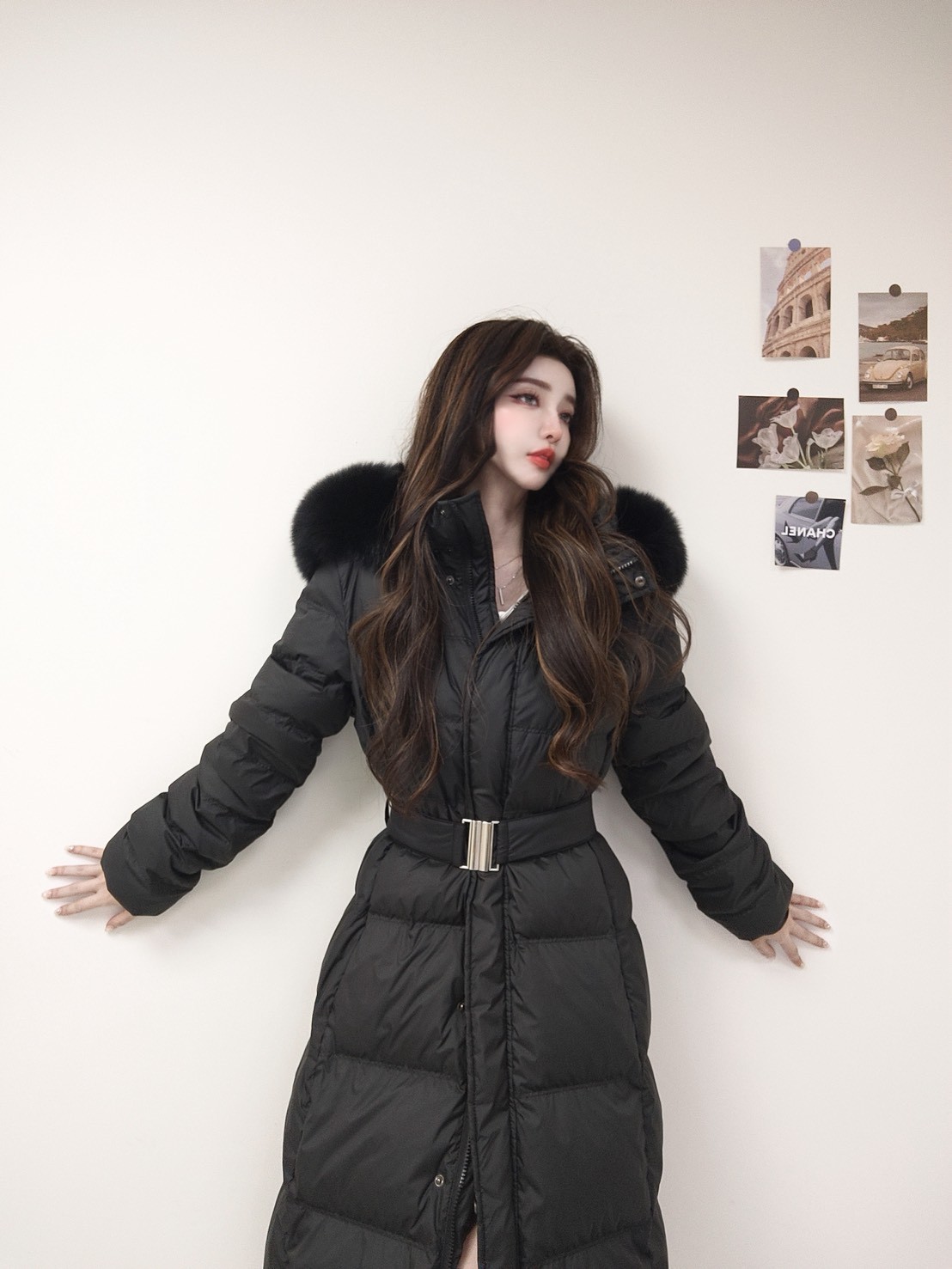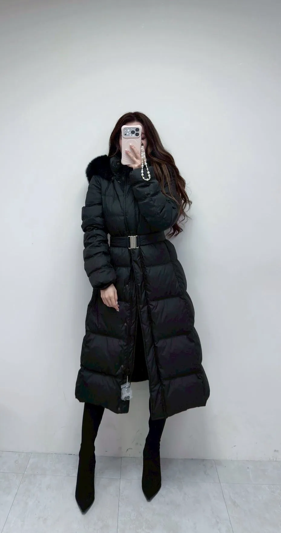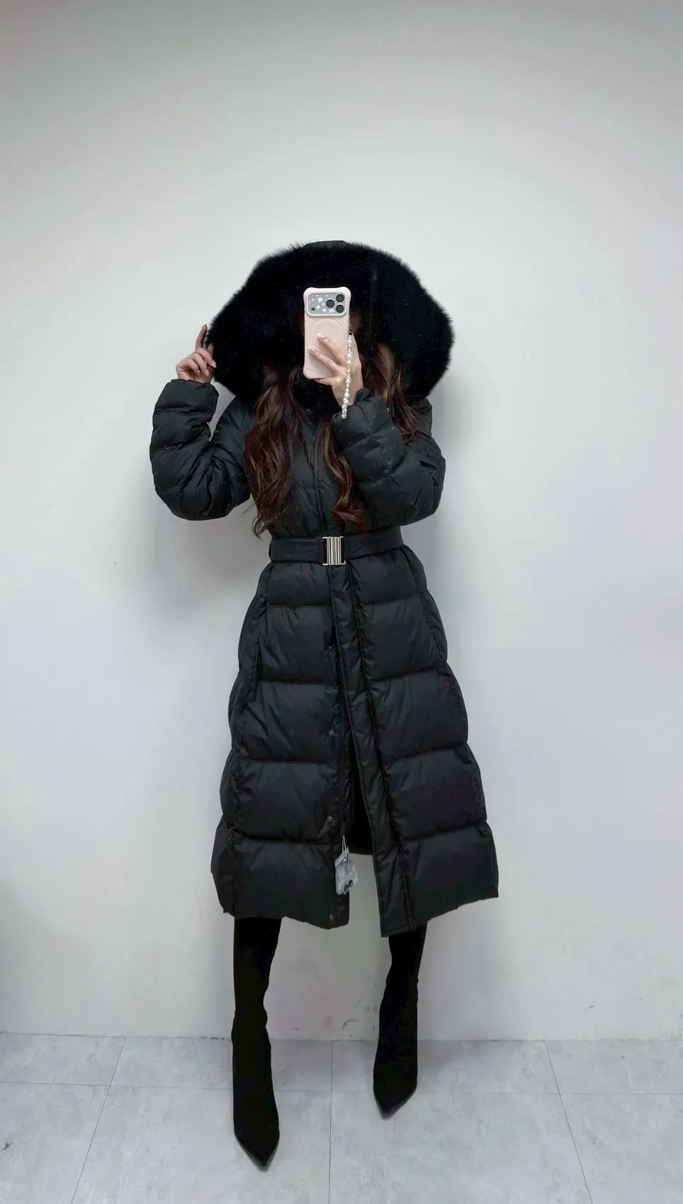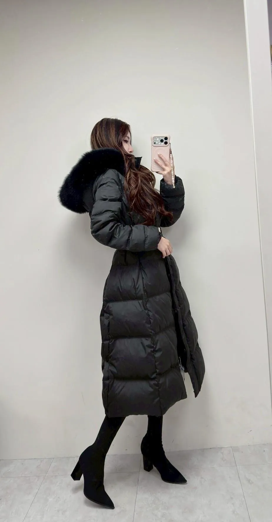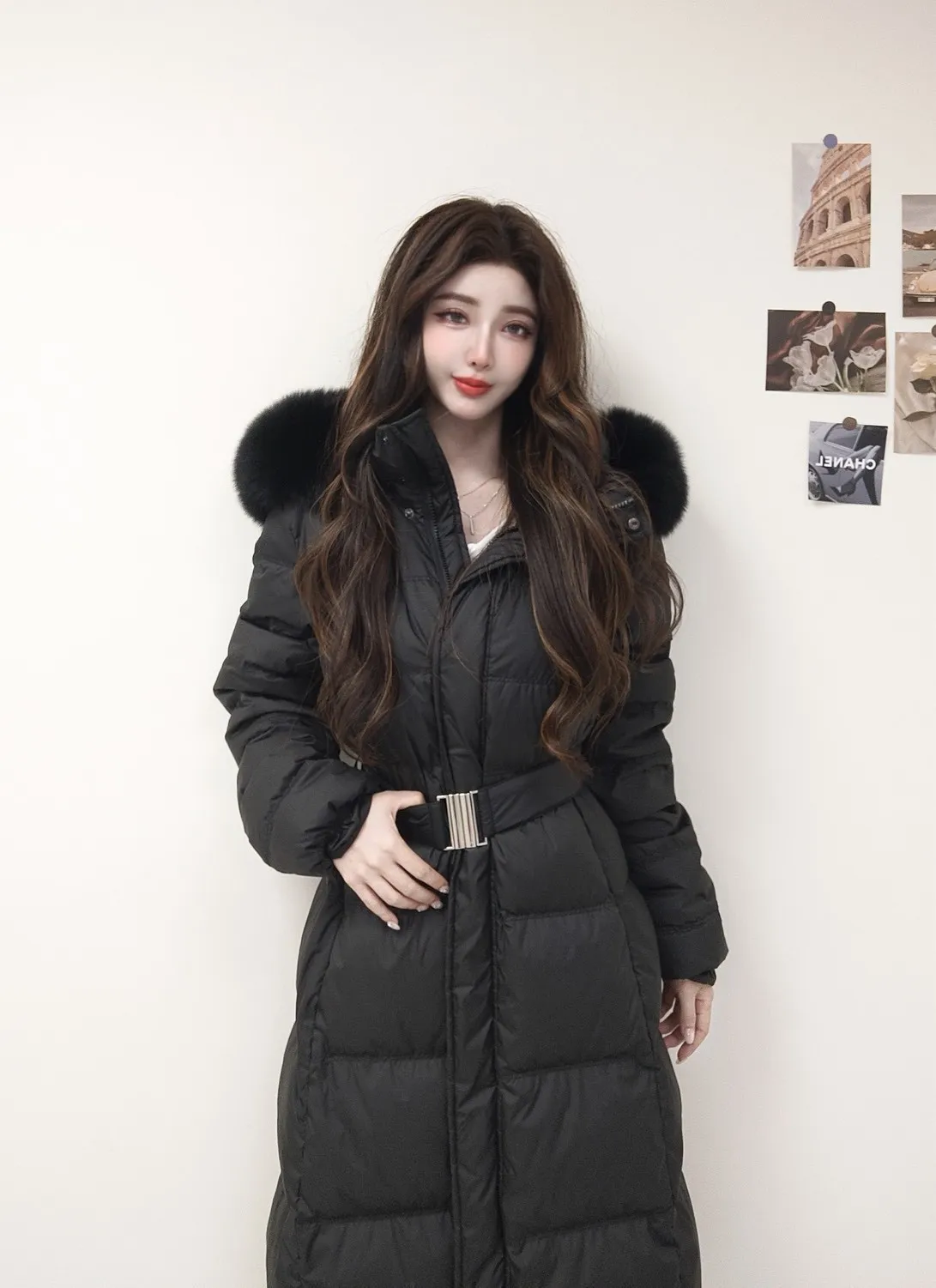 韓國100%鵝絨真狐狸毛長版附腰帶外套
