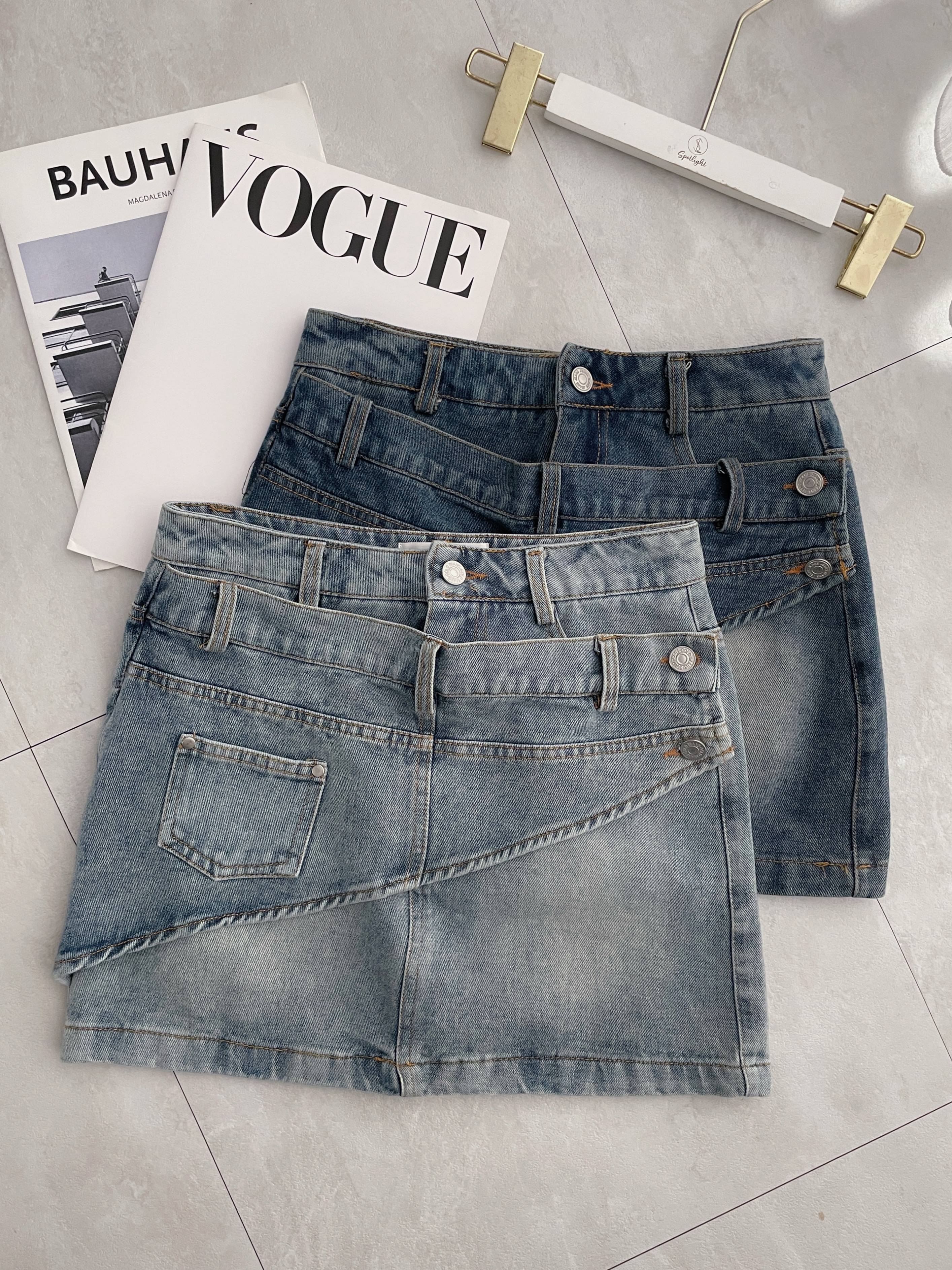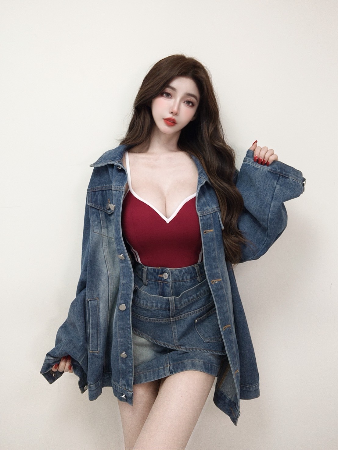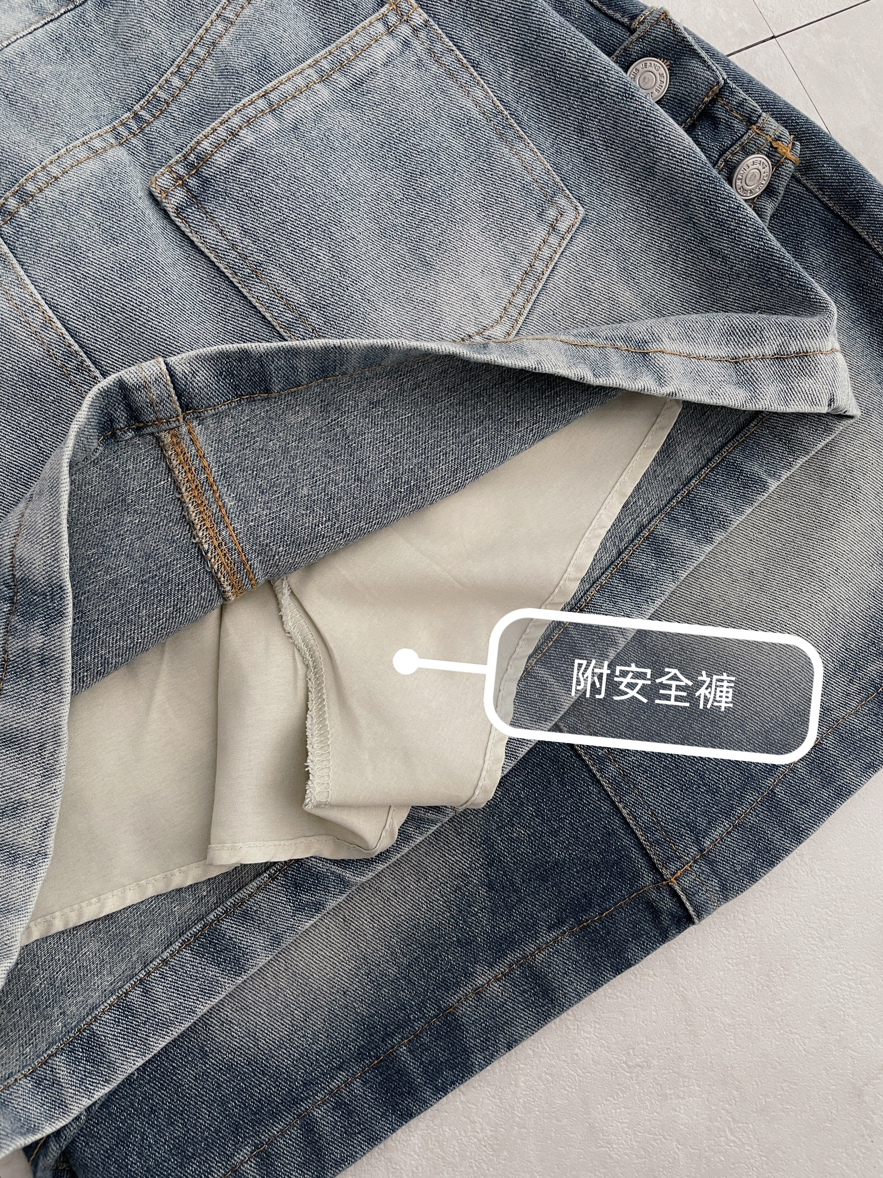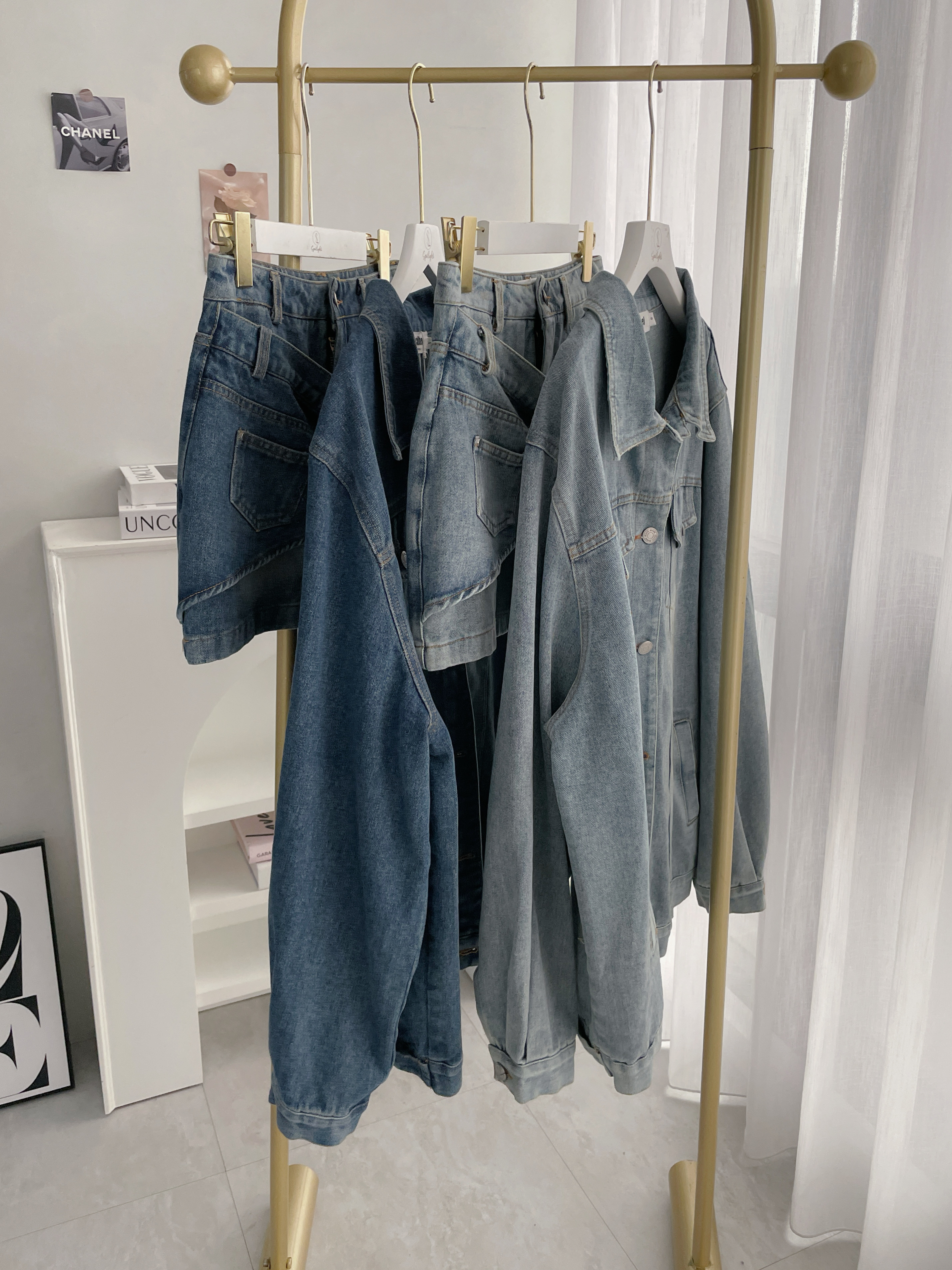 【SET】丹寧系列 韓國雙口袋牛仔長版外套+假兩件短裙