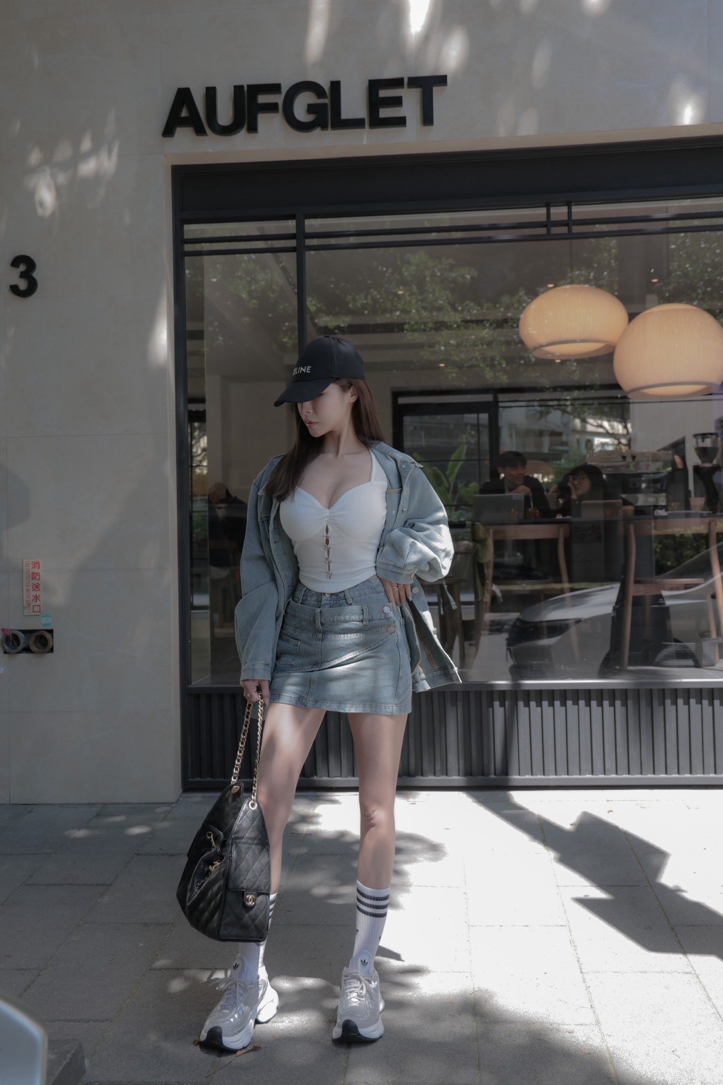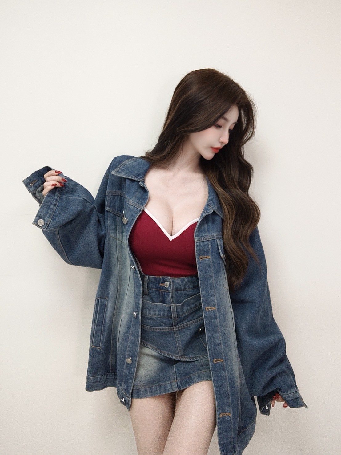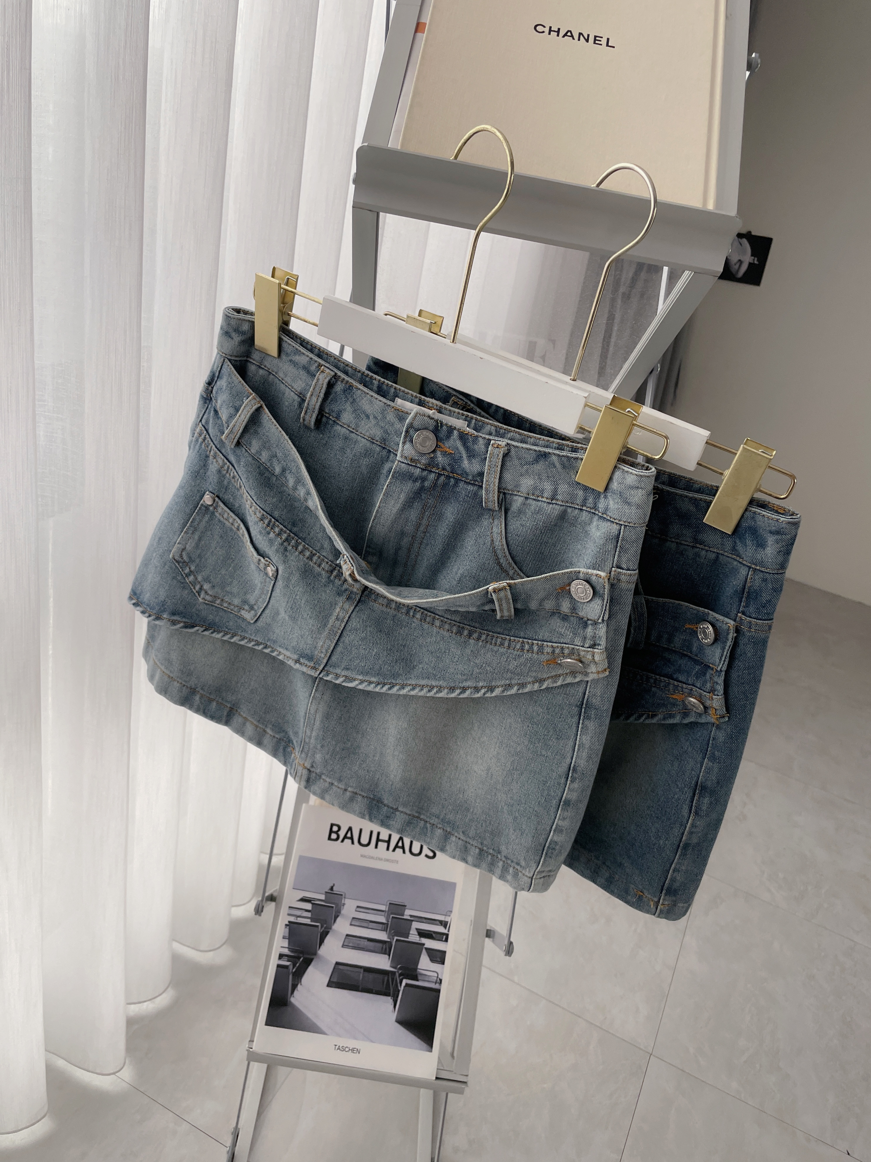 【SET】丹寧系列 韓國雙口袋牛仔長版外套+假兩件短裙