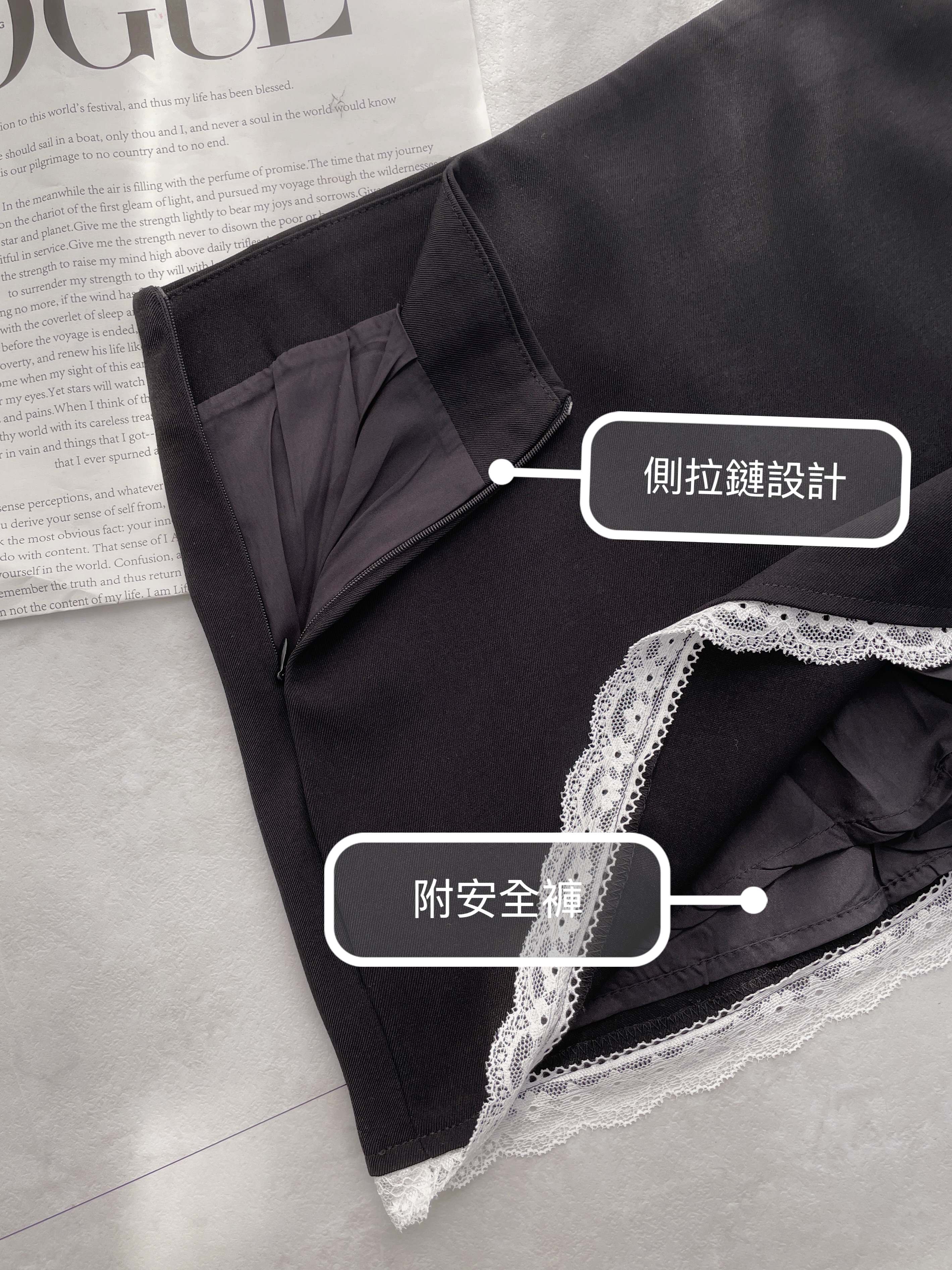 - 側邊隱形拉鍊,方便穿脫