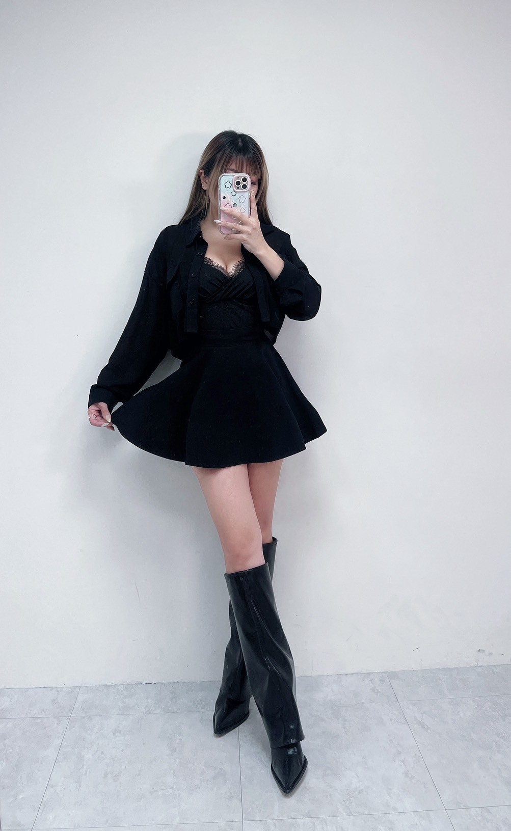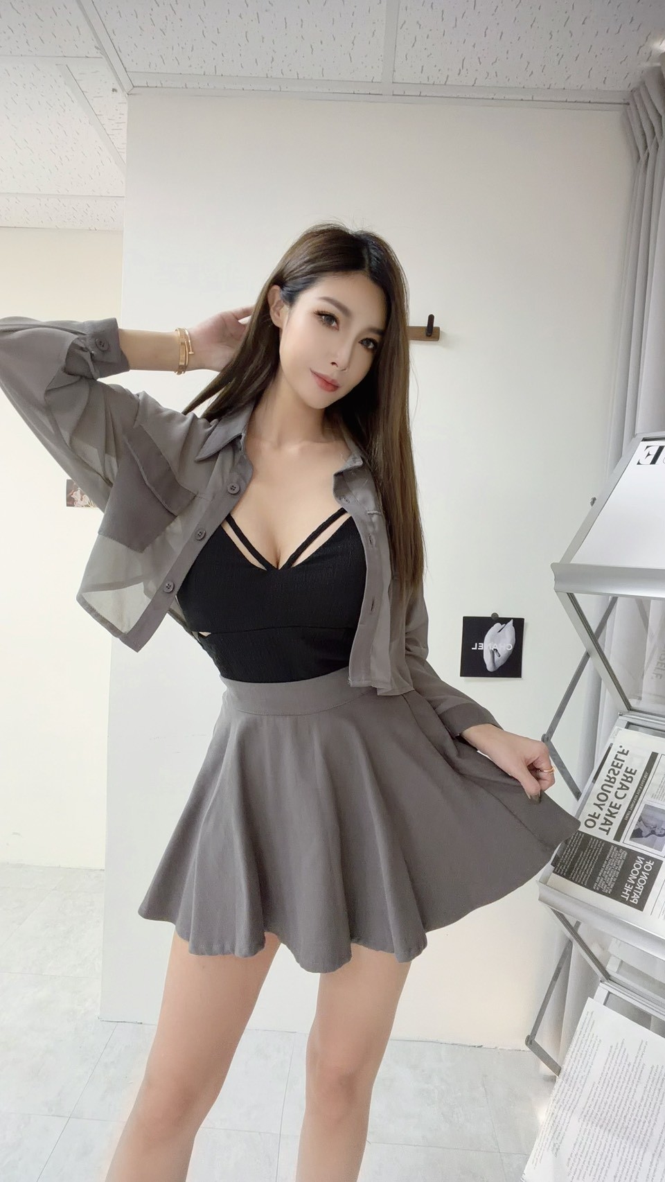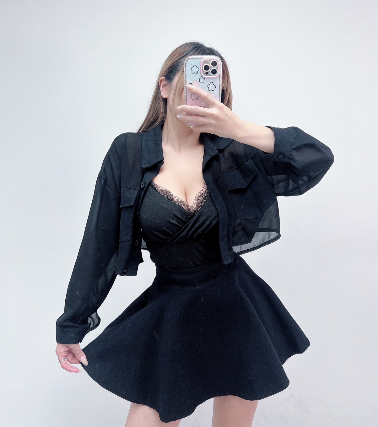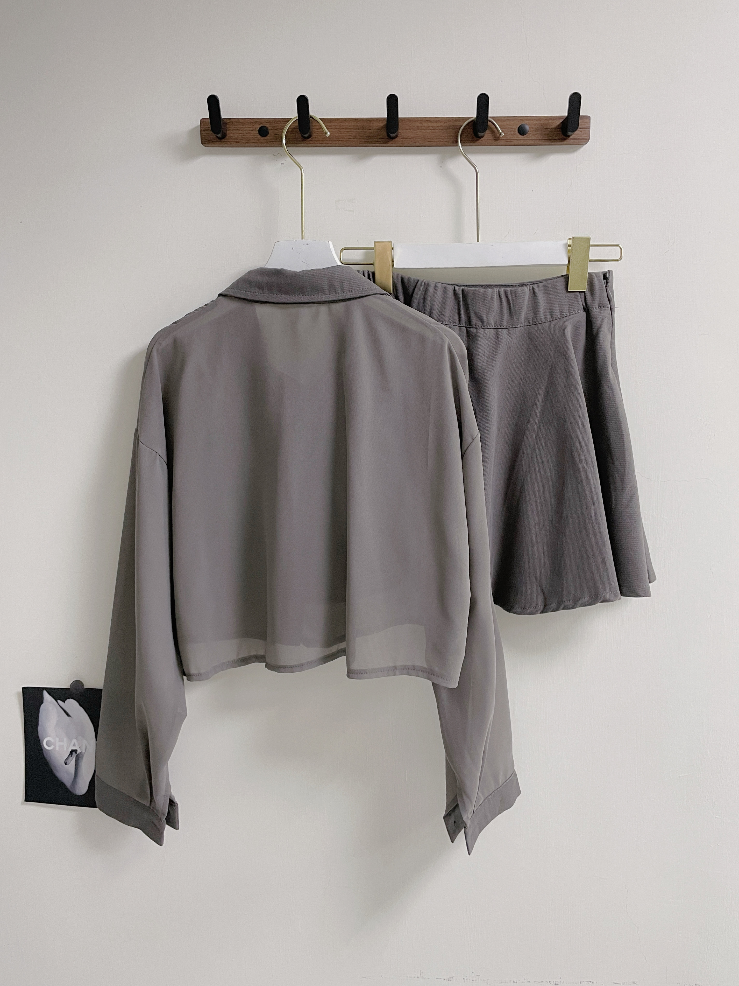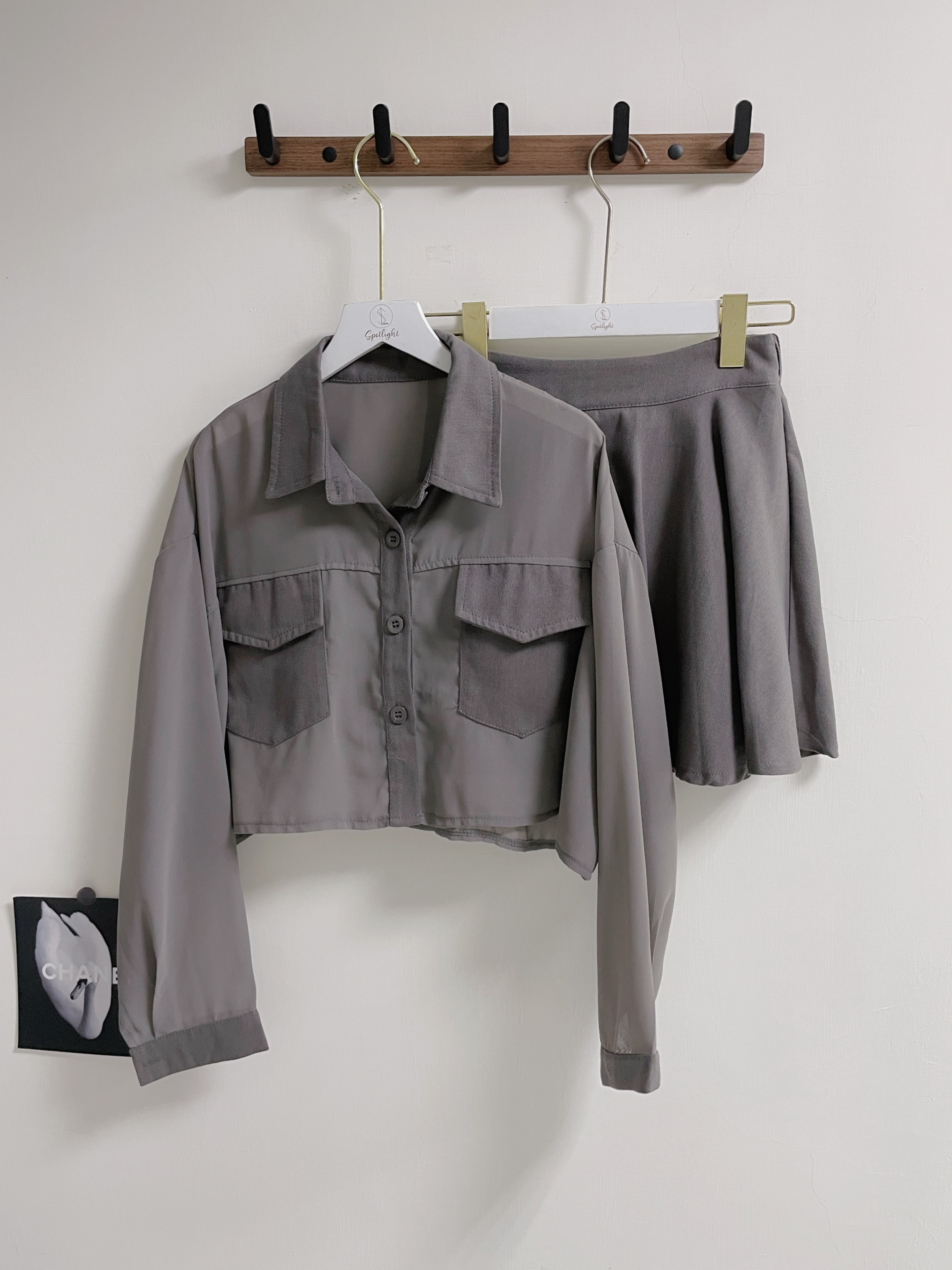 【SET】雙口袋排釦雪紡上衣+傘裙