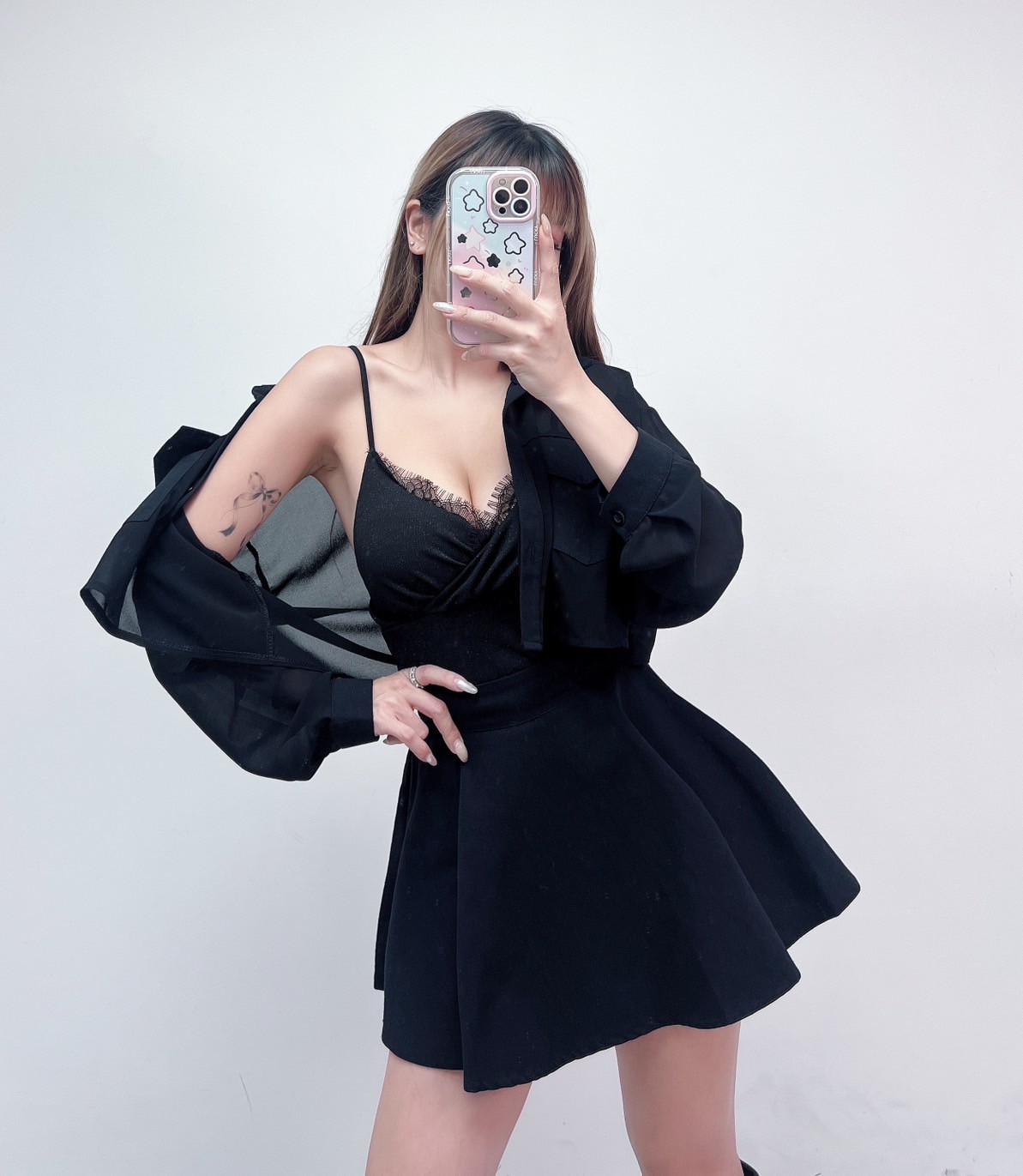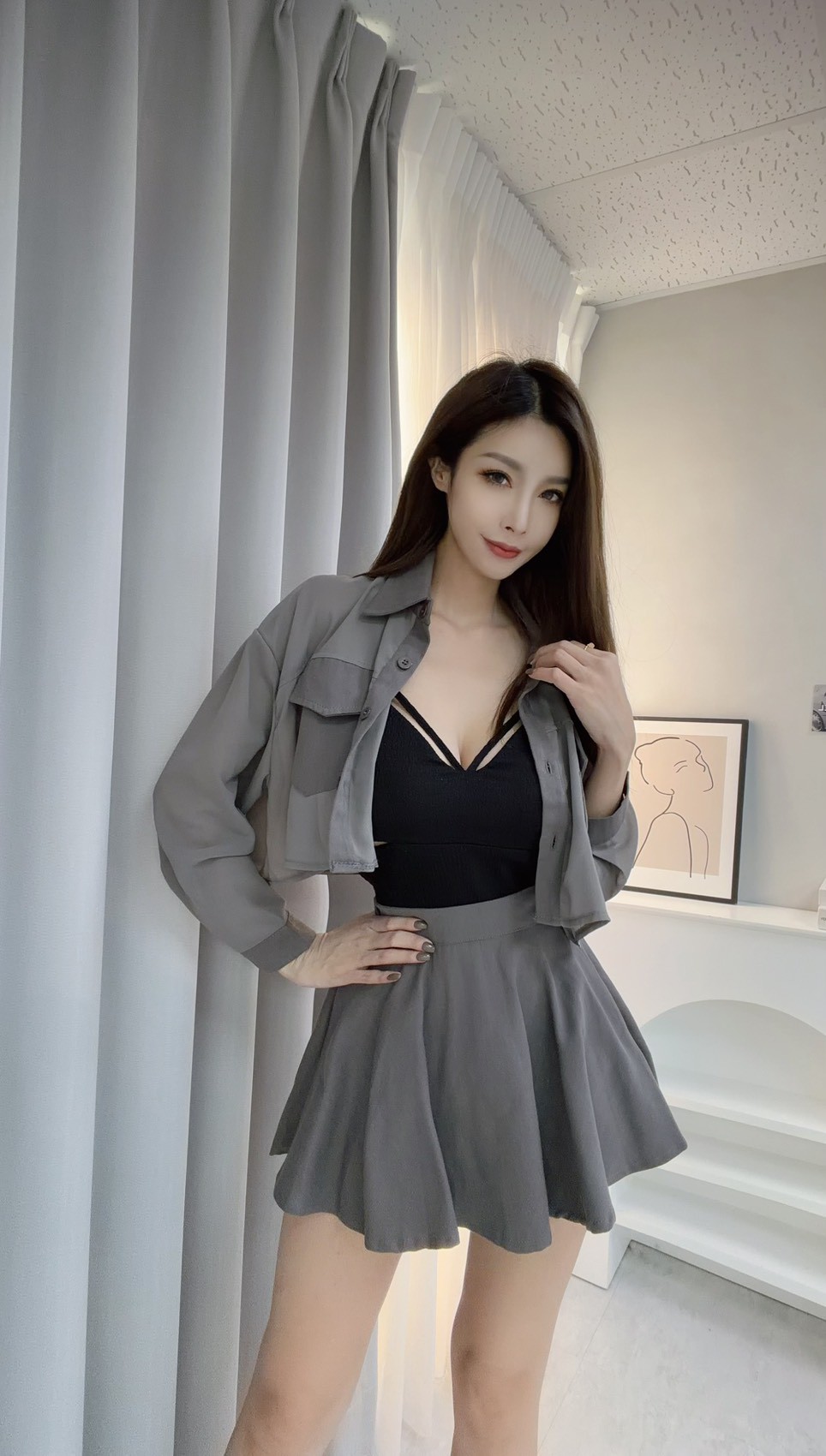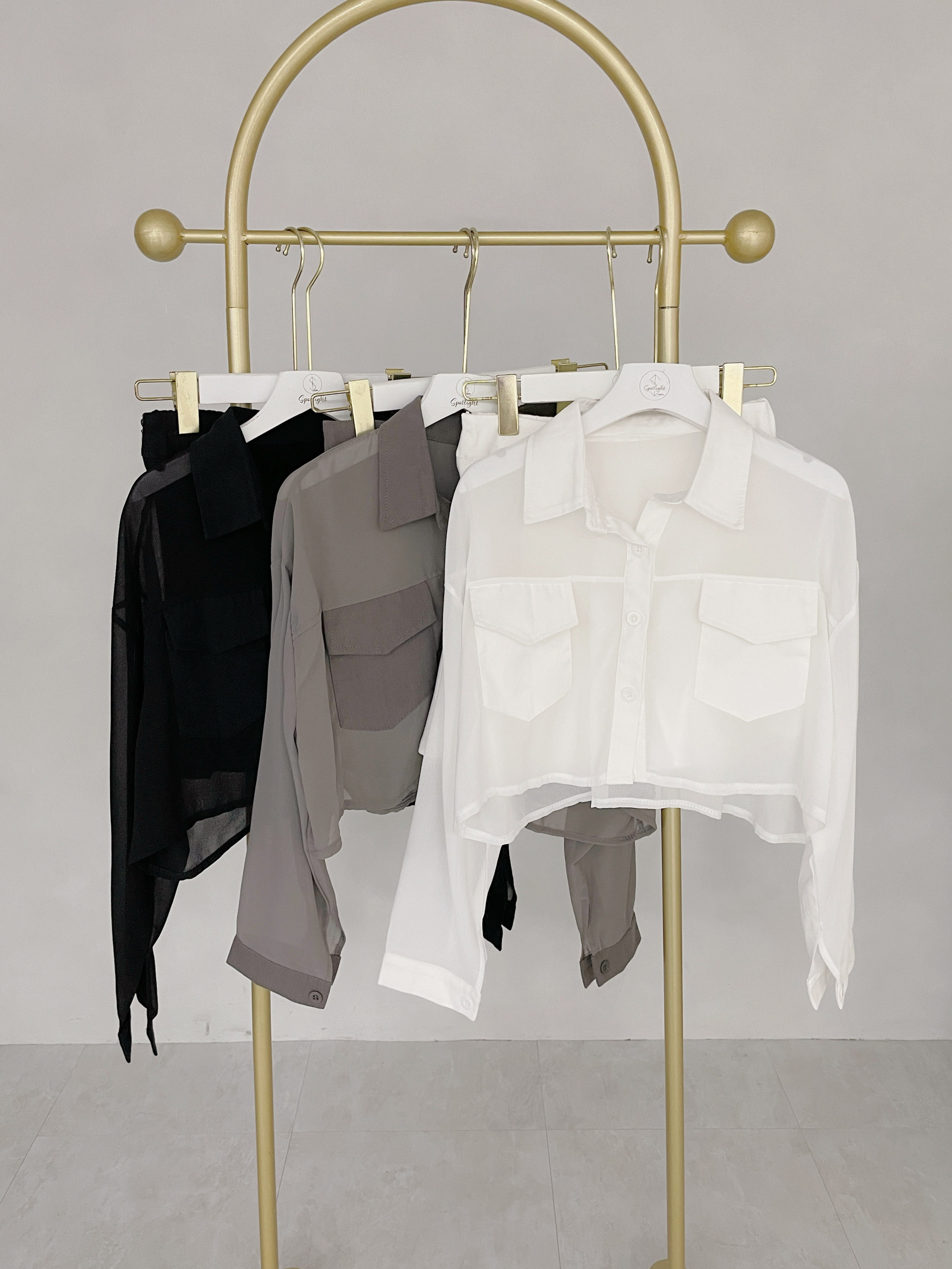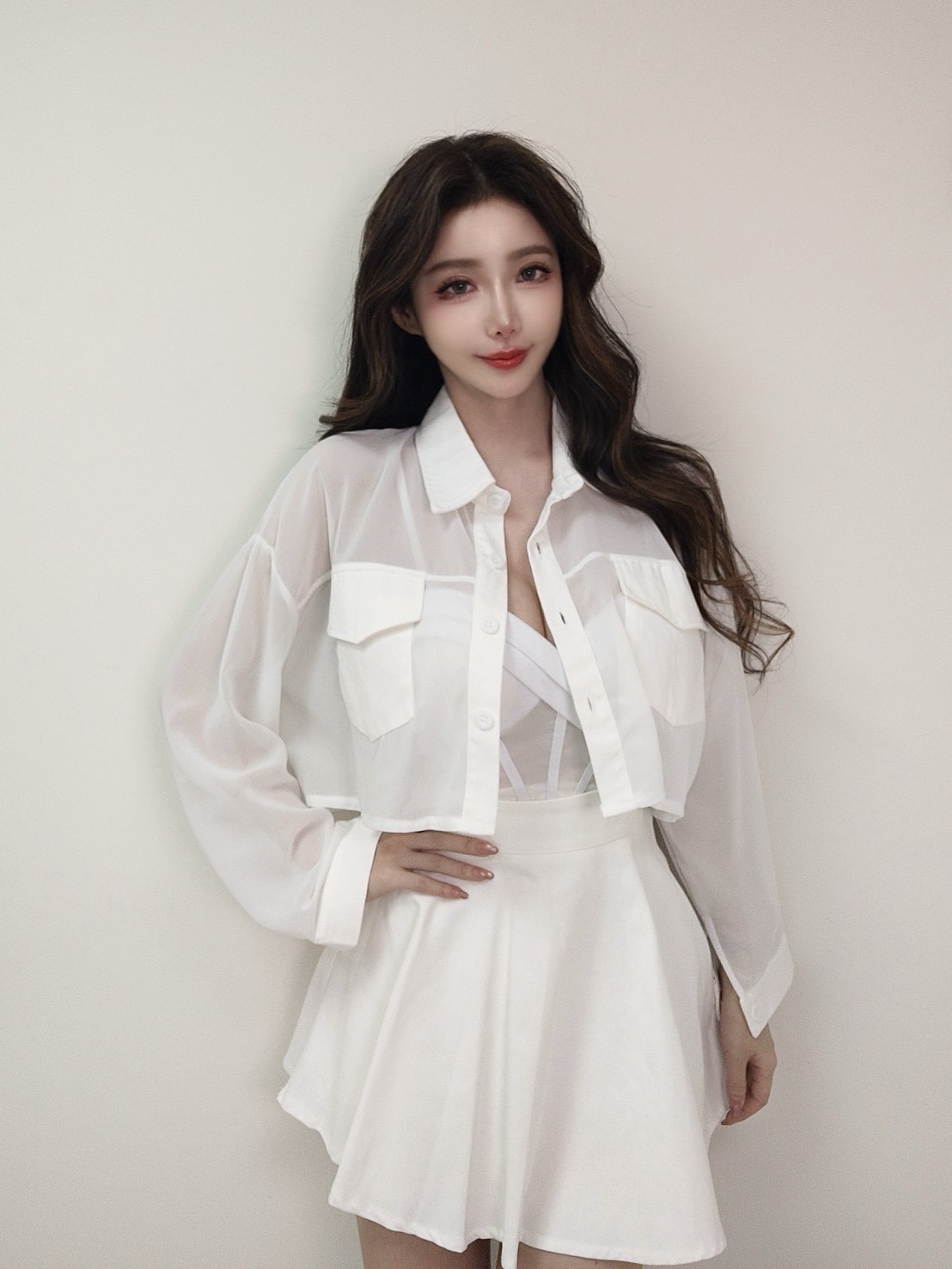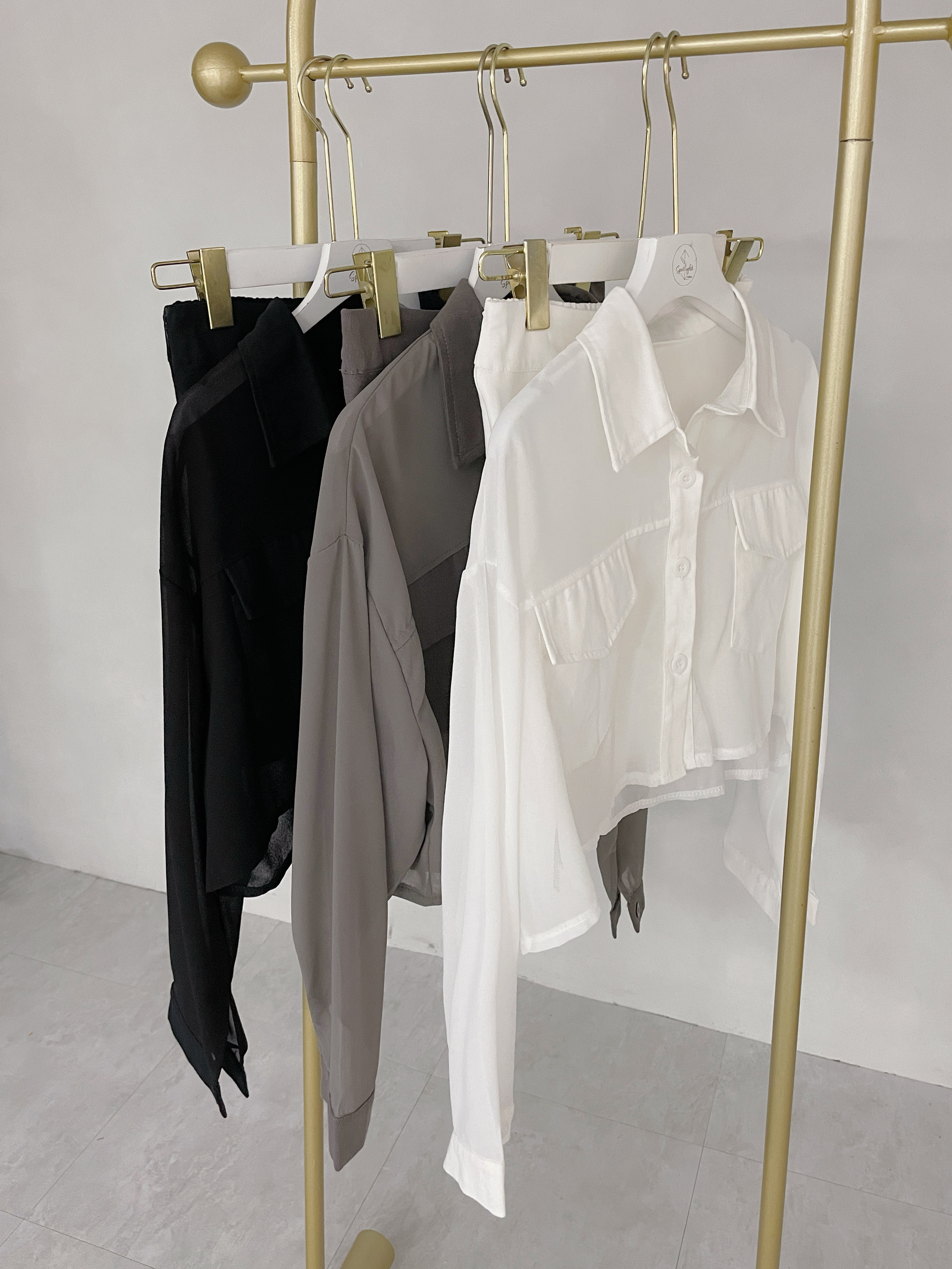【SET】雙口袋排釦雪紡上衣+傘裙