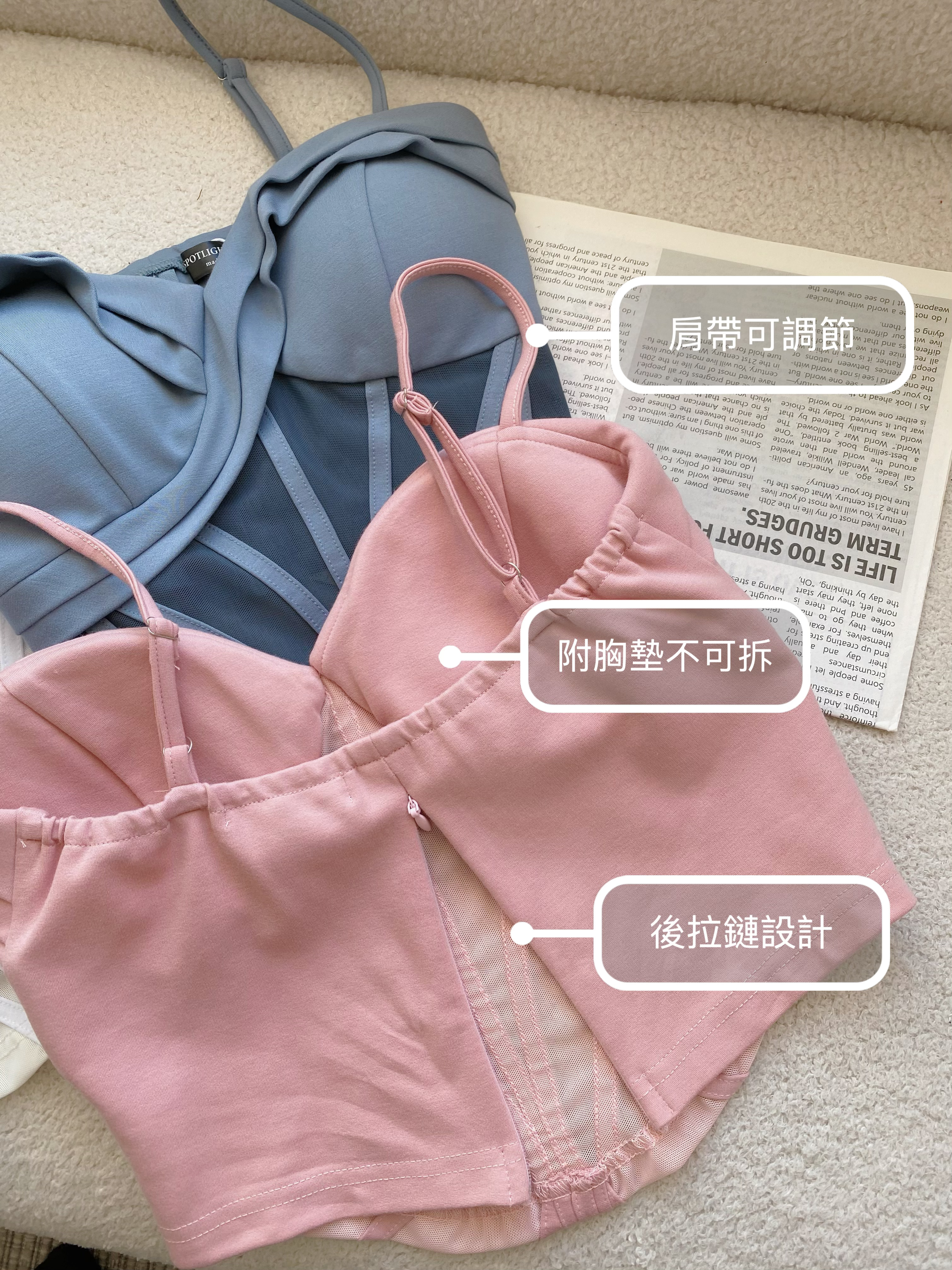 肩帶可調,附胸墊,後拉鍊設計,方便穿脫。