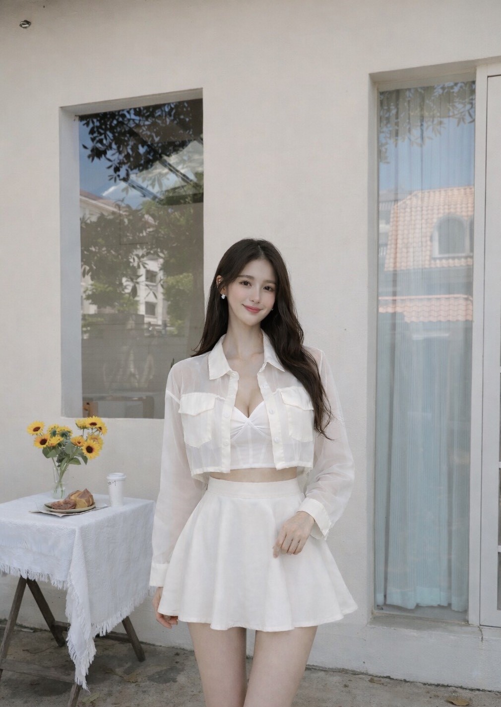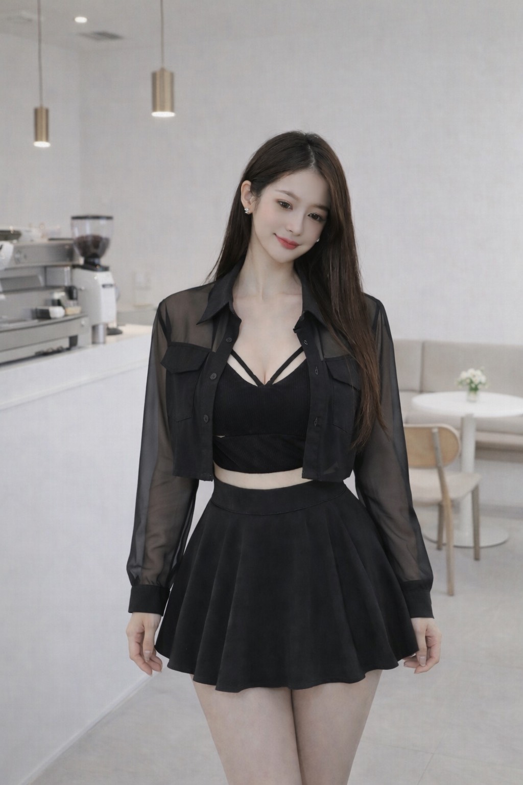 【SET】雙口袋排釦雪紡上衣+傘裙