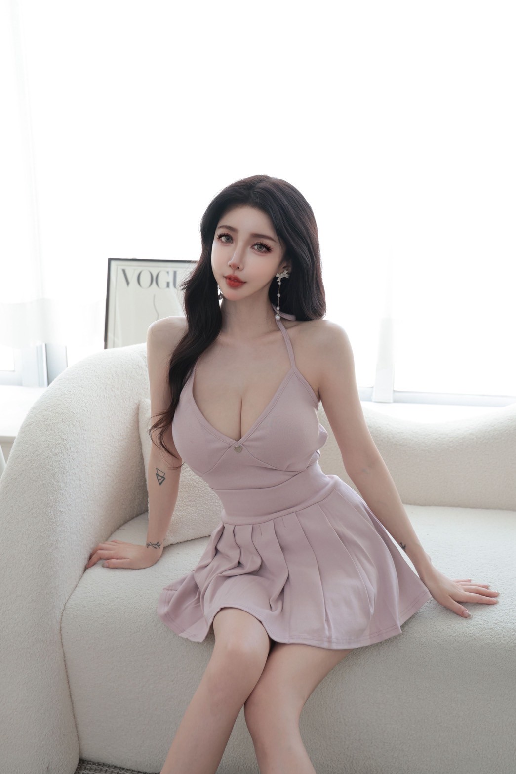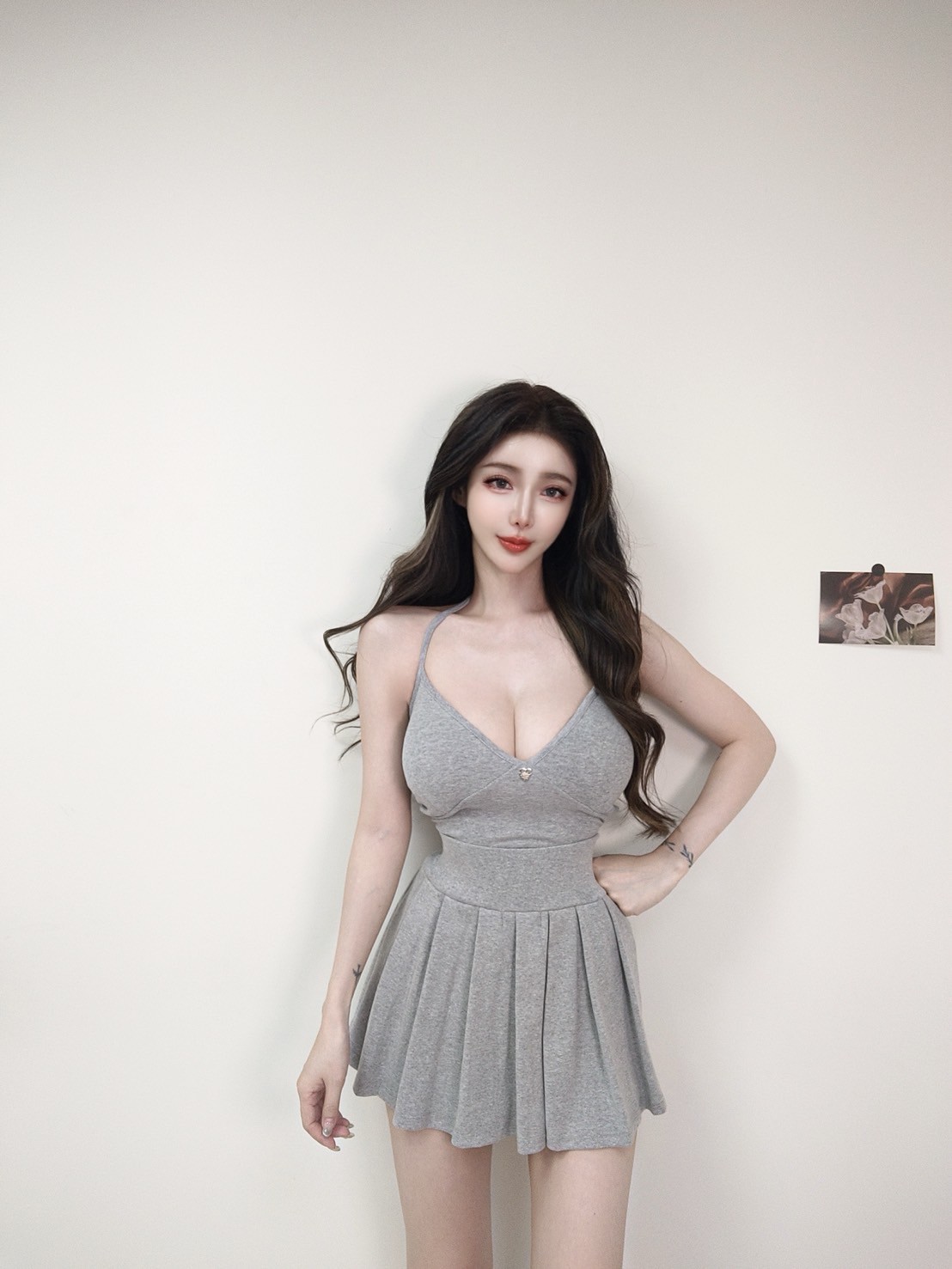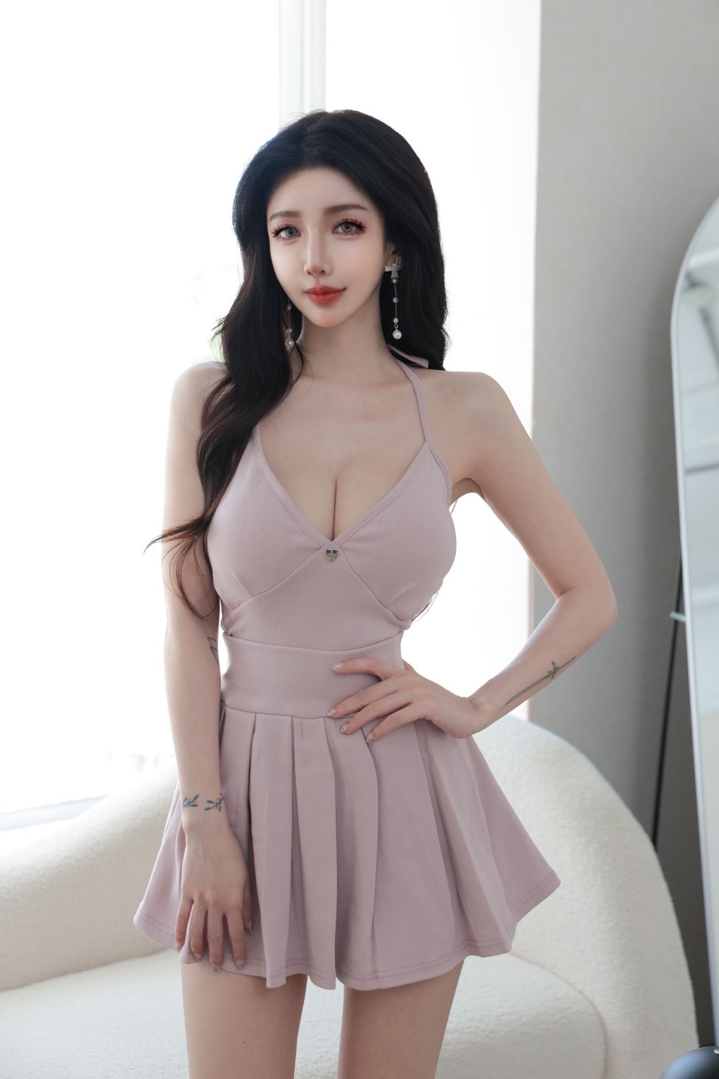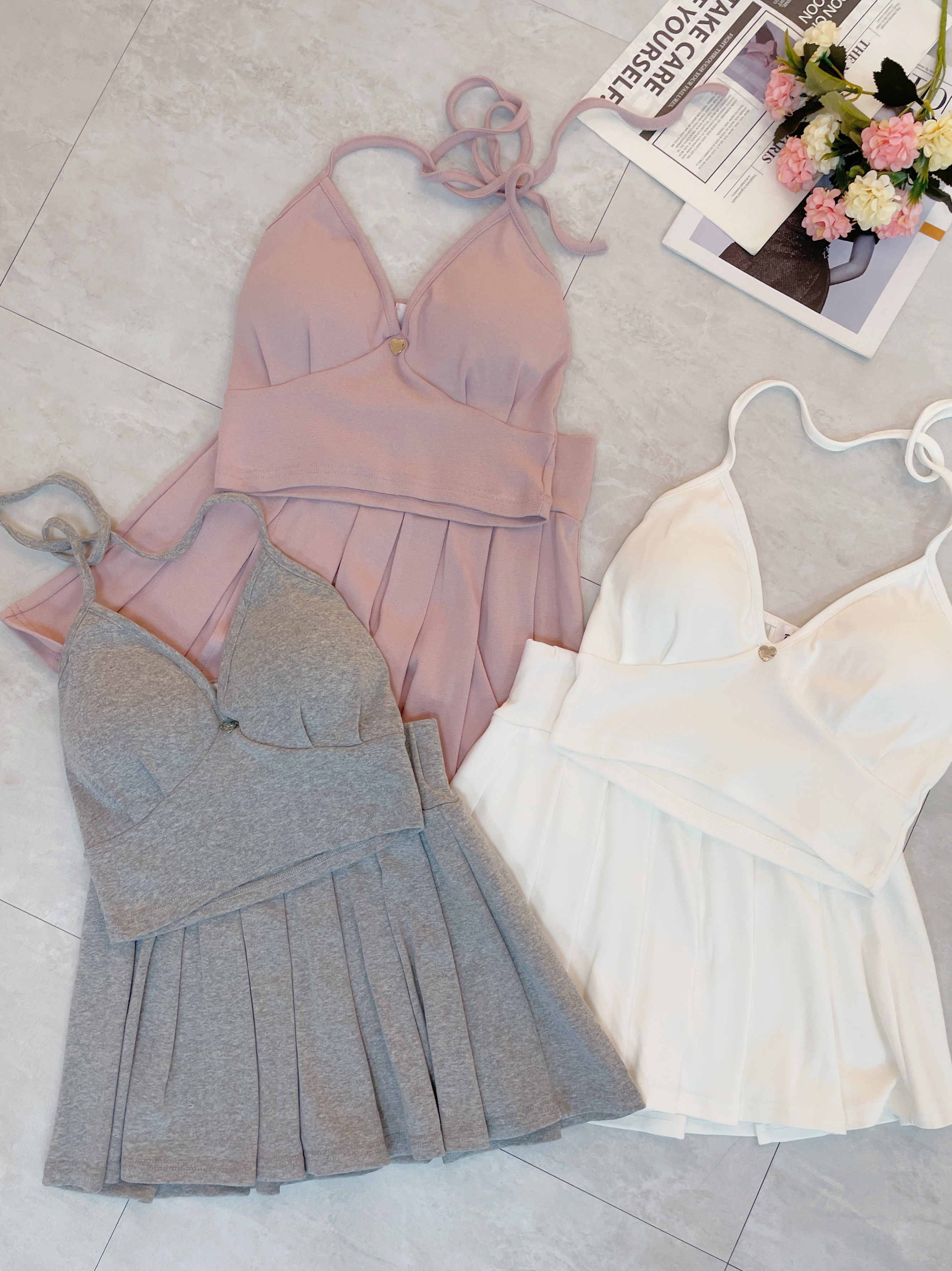 【SET】韓國細肩綁帶愛心鐵牌上衣+百褶裙