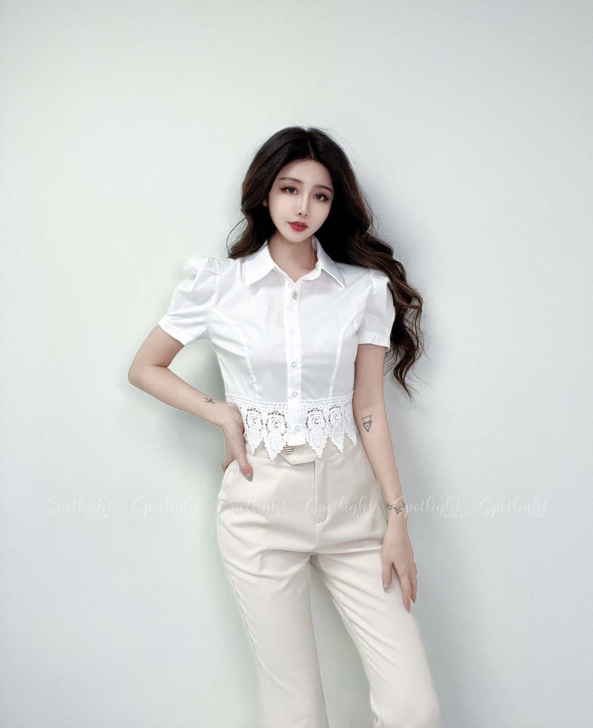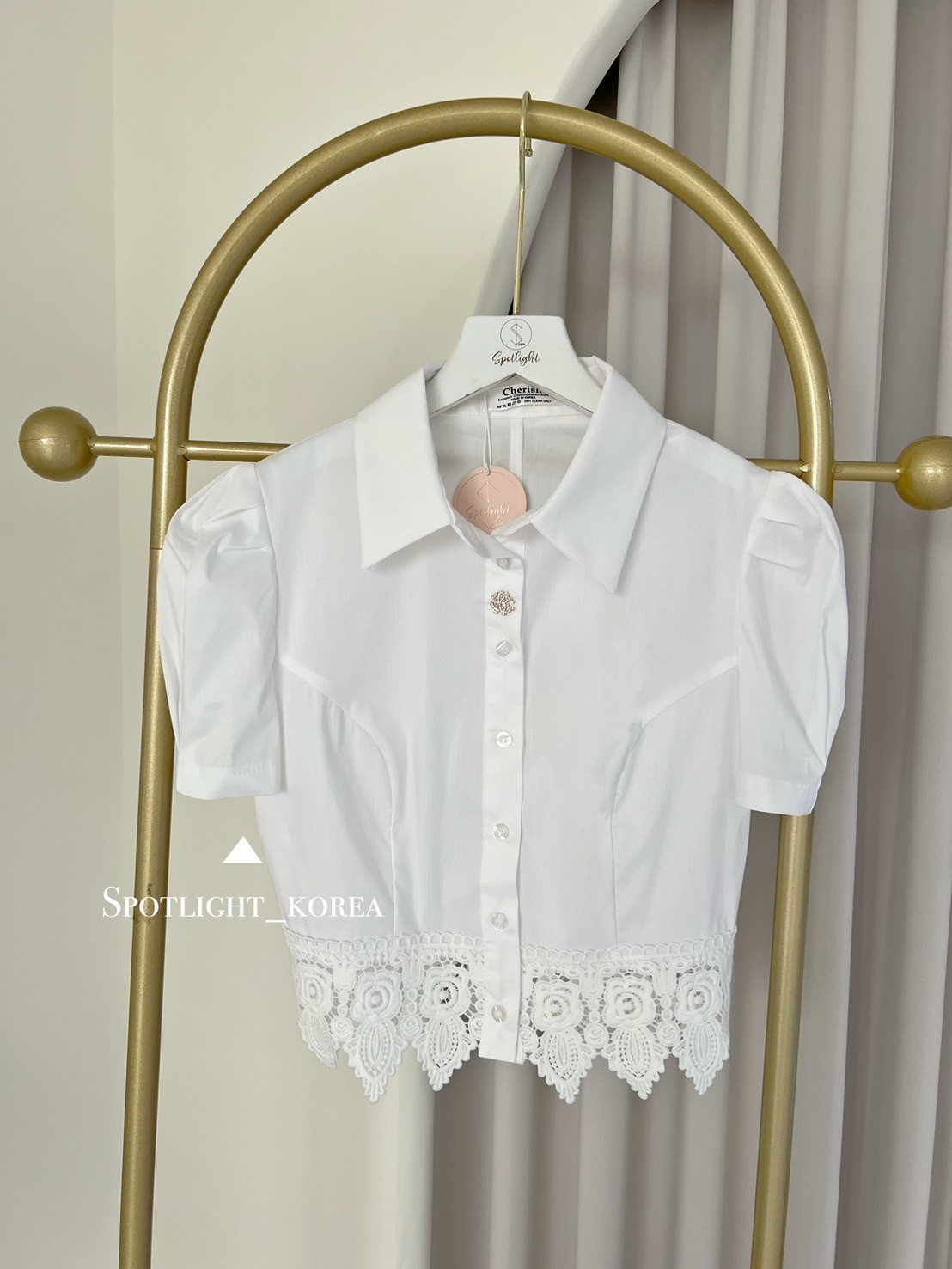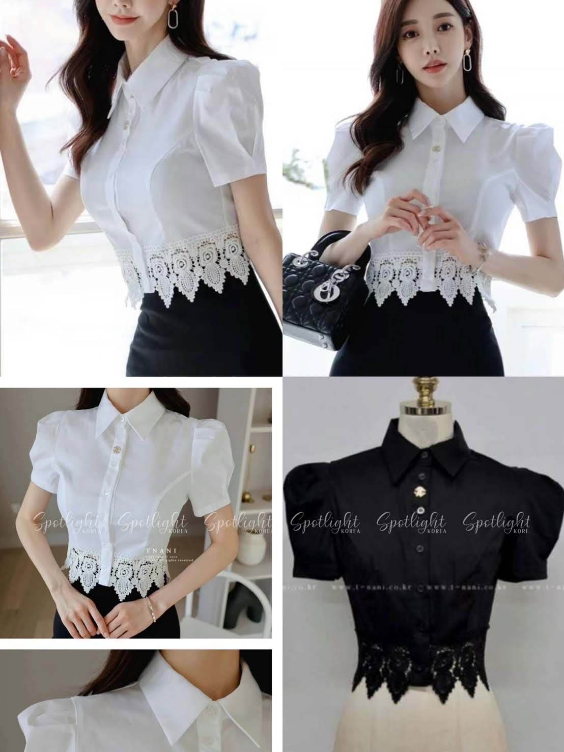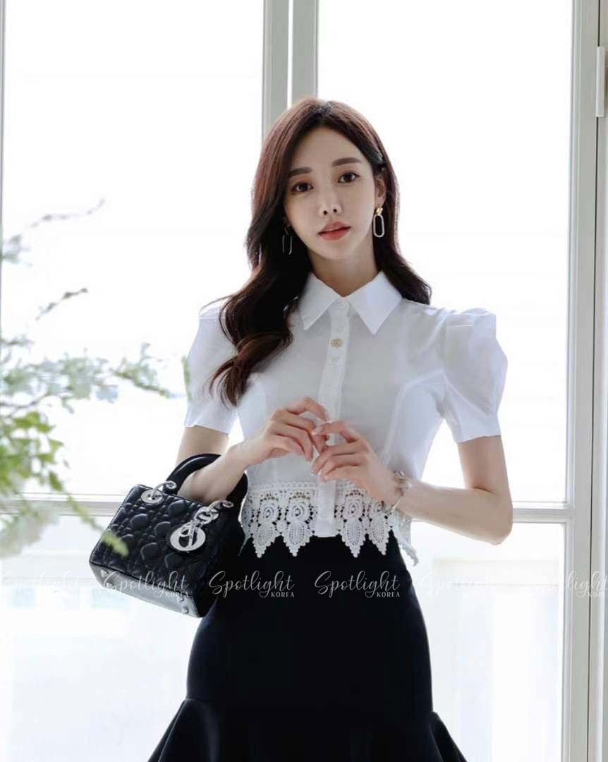 韓國公主袖拼接緹花短版襯衫