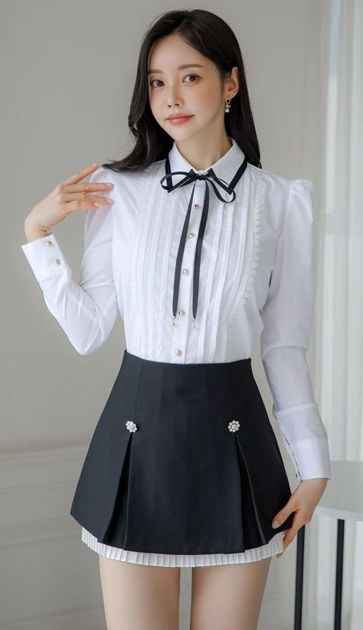 撞色花邊 韓國質感壓褶蝴蝶結襯衫