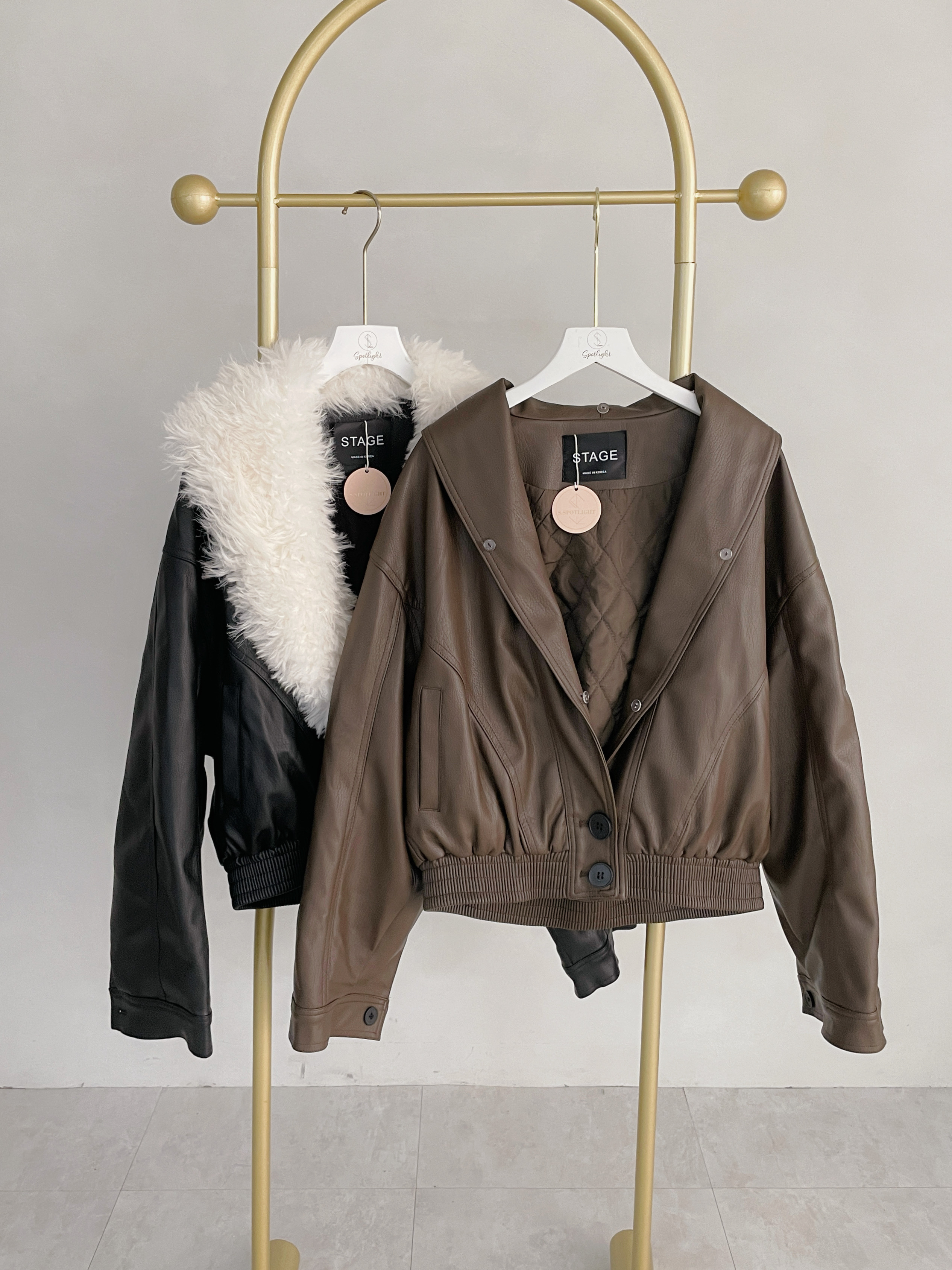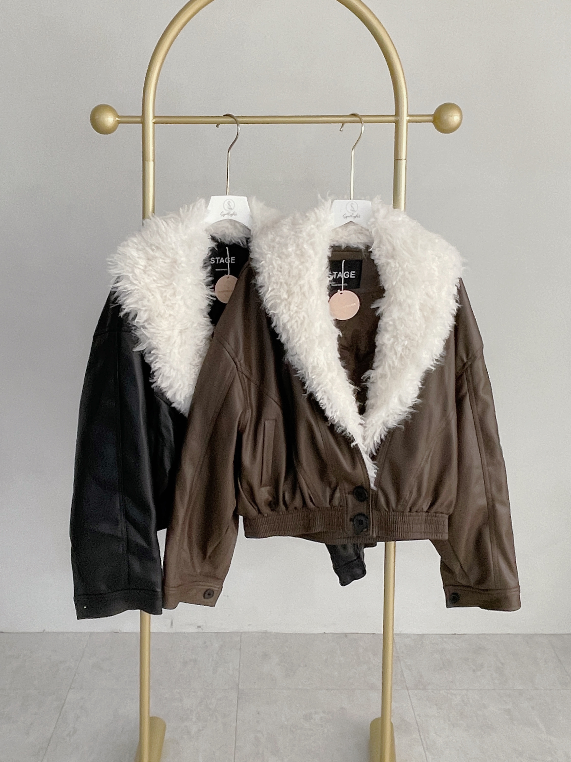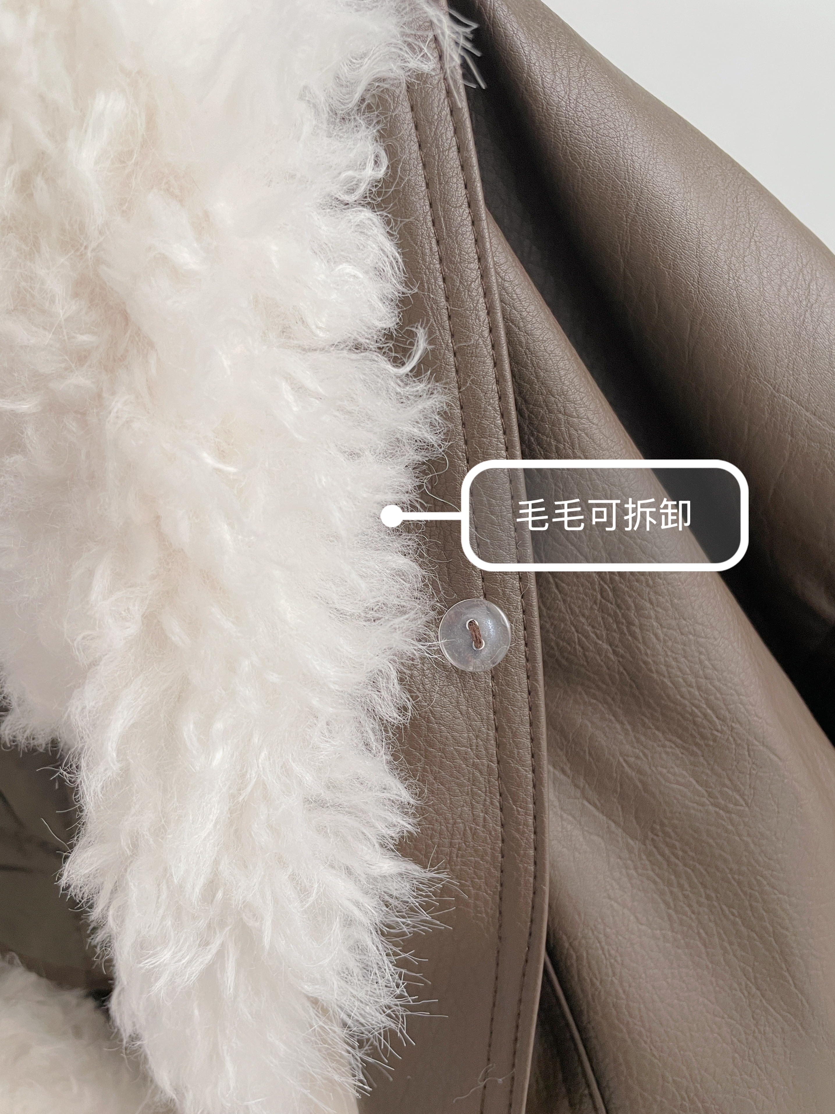 質感荔枝紋皮革結合柔軟毛毛拼接,打造高級氛圍。毛毛領可拆設計,依造型自由變換。