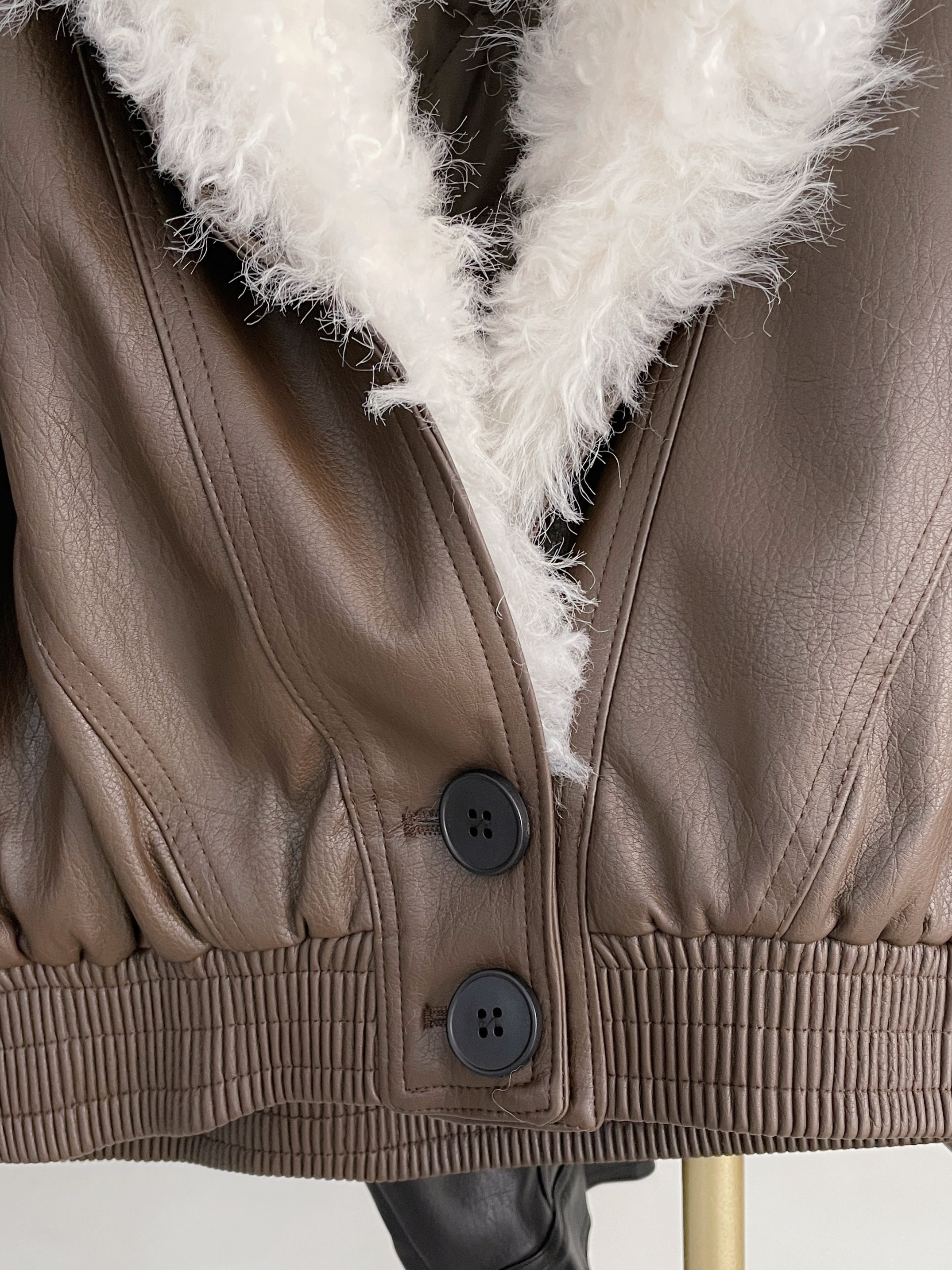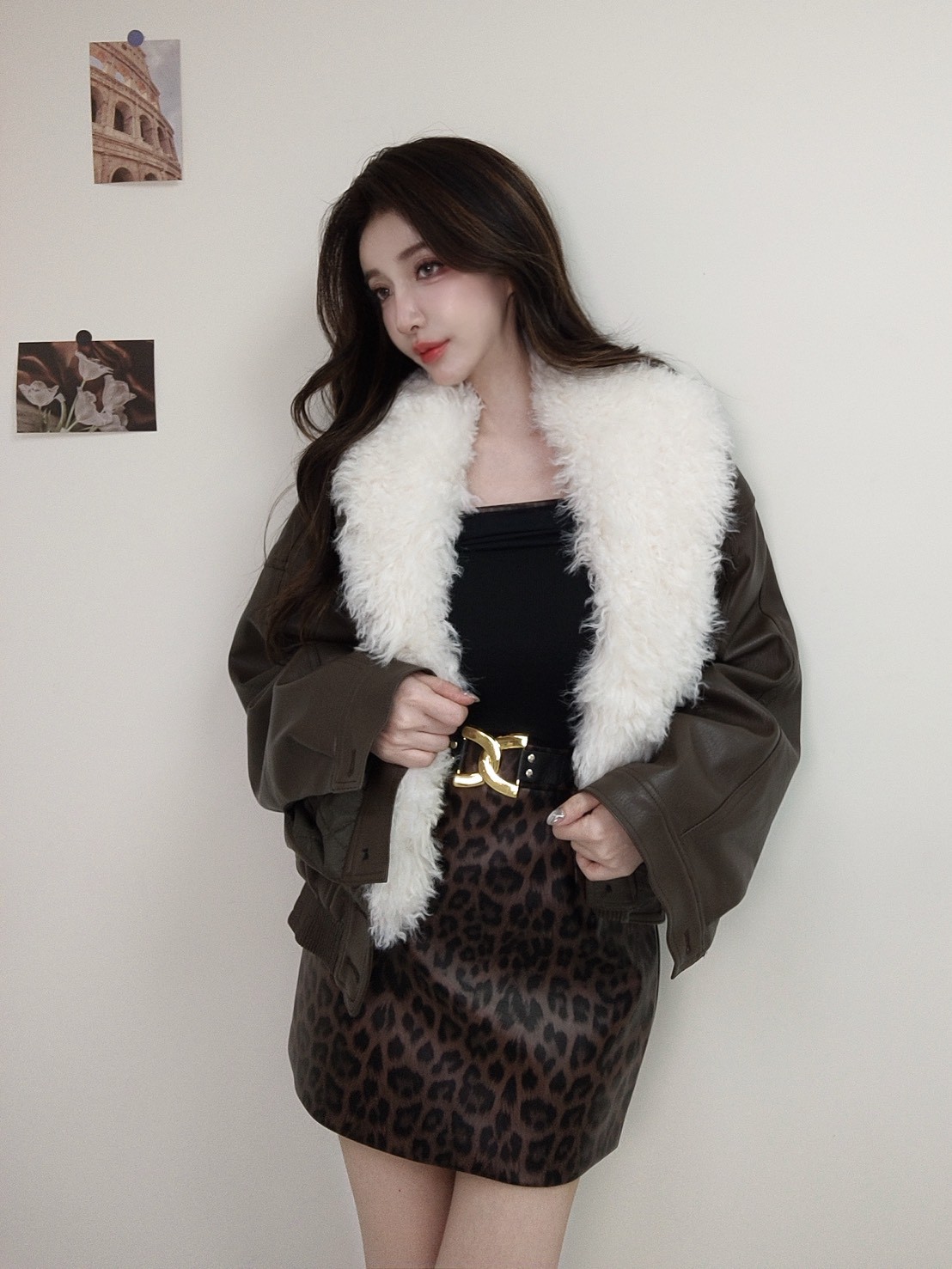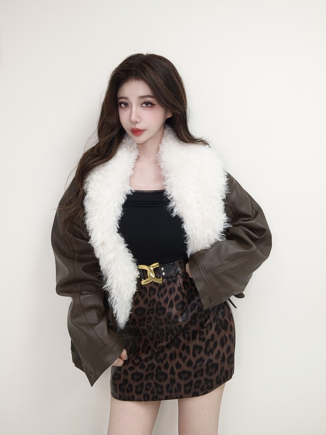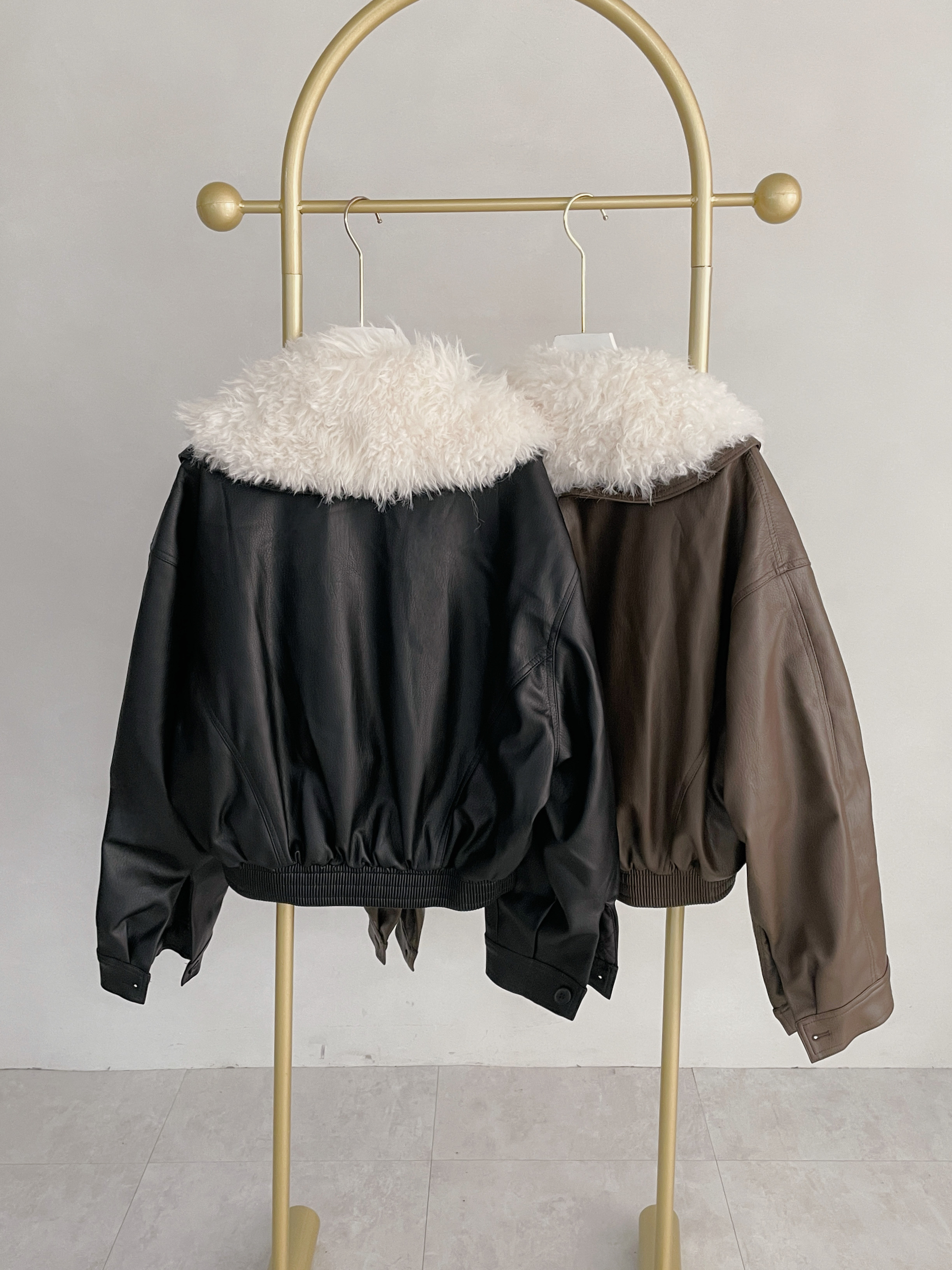 質感荔枝紋皮革結合柔軟毛毛拼接,打造高級氛圍。毛毛領可拆設計,依造型自由變換。