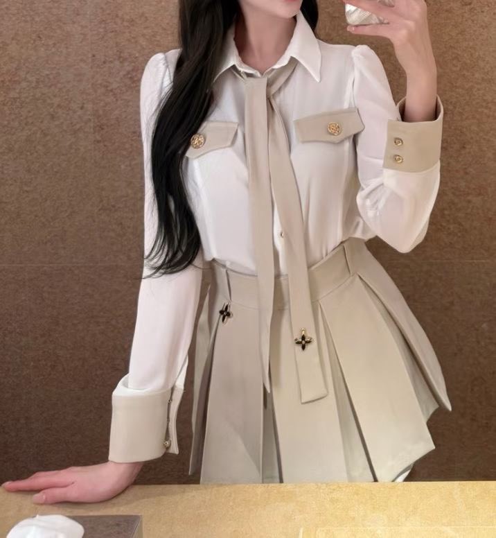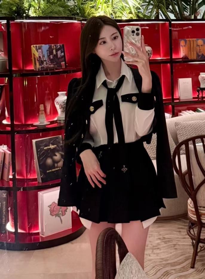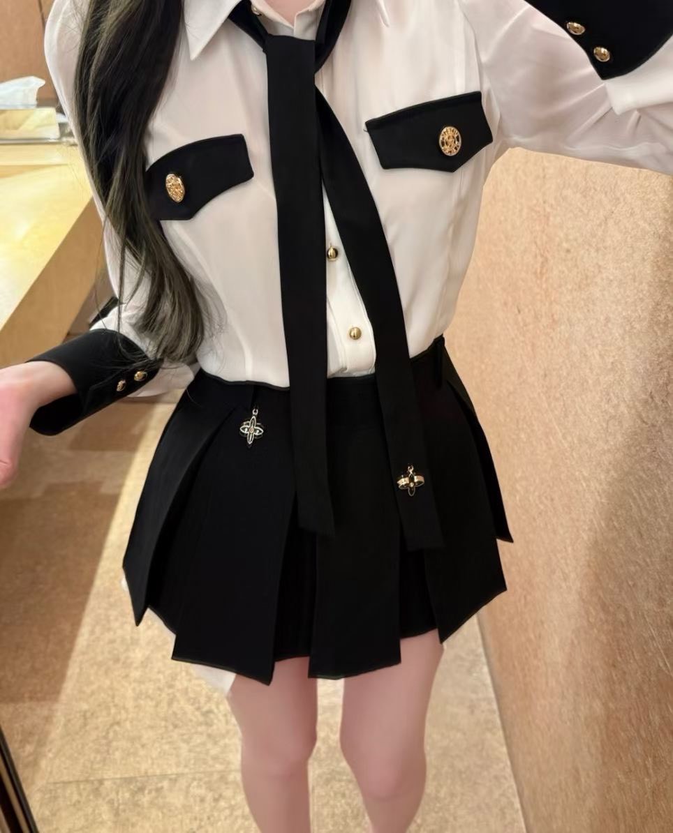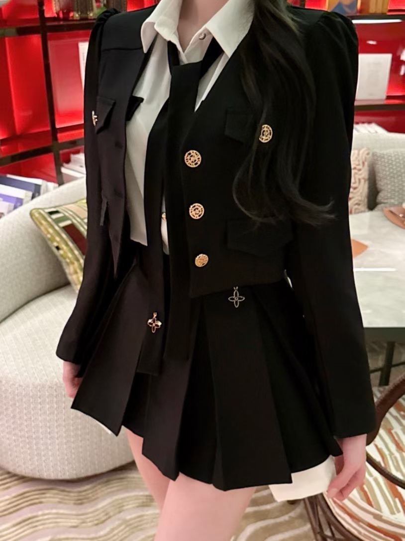 韓國學院風 撞色十字金屬襯衫+外套+百褶裙