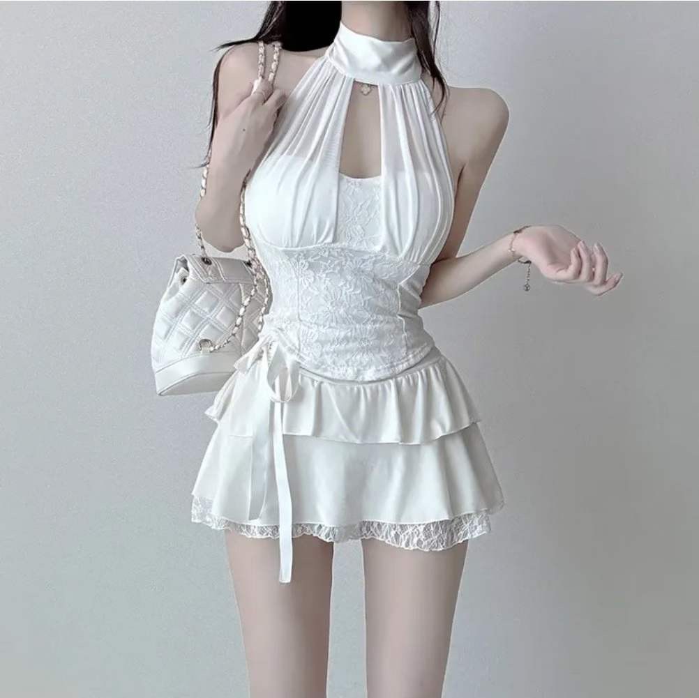平口鏤空網紗繞脖綁帶蕾絲背心