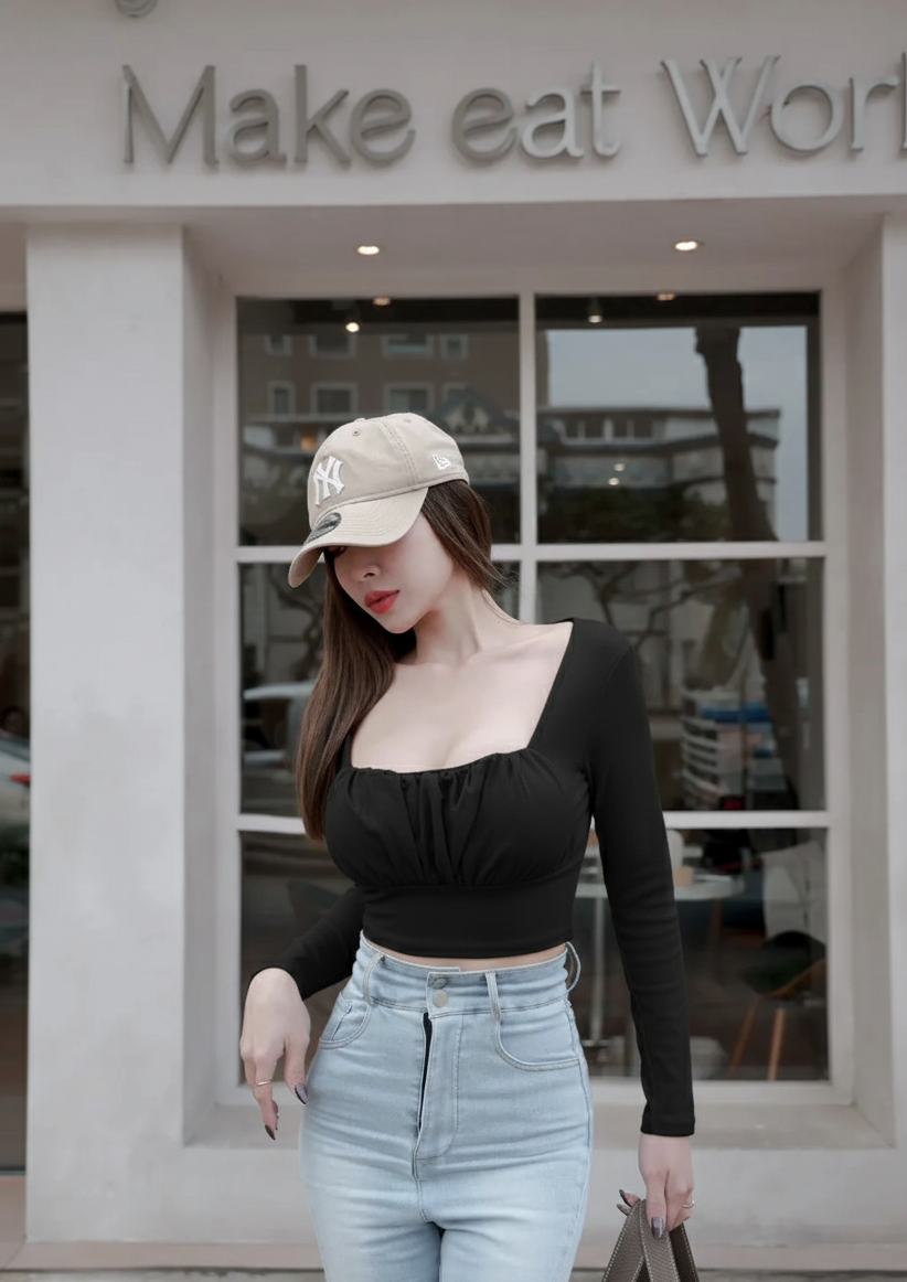 方領胸抓皺棉質長袖上衣