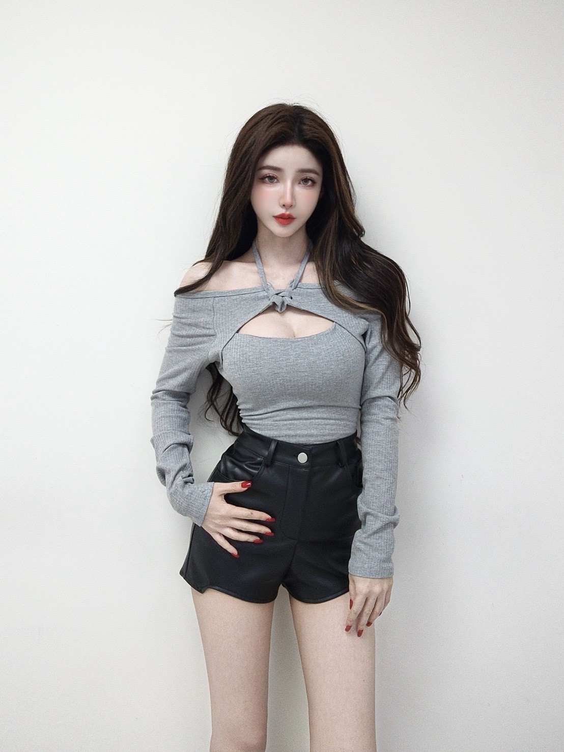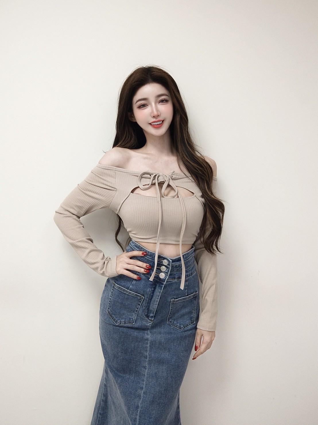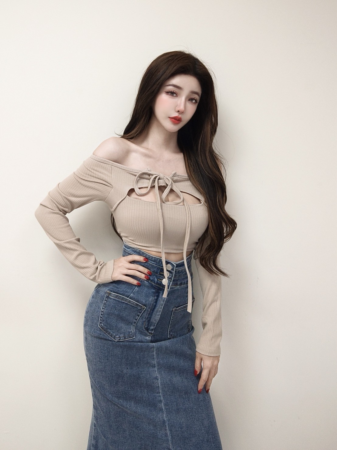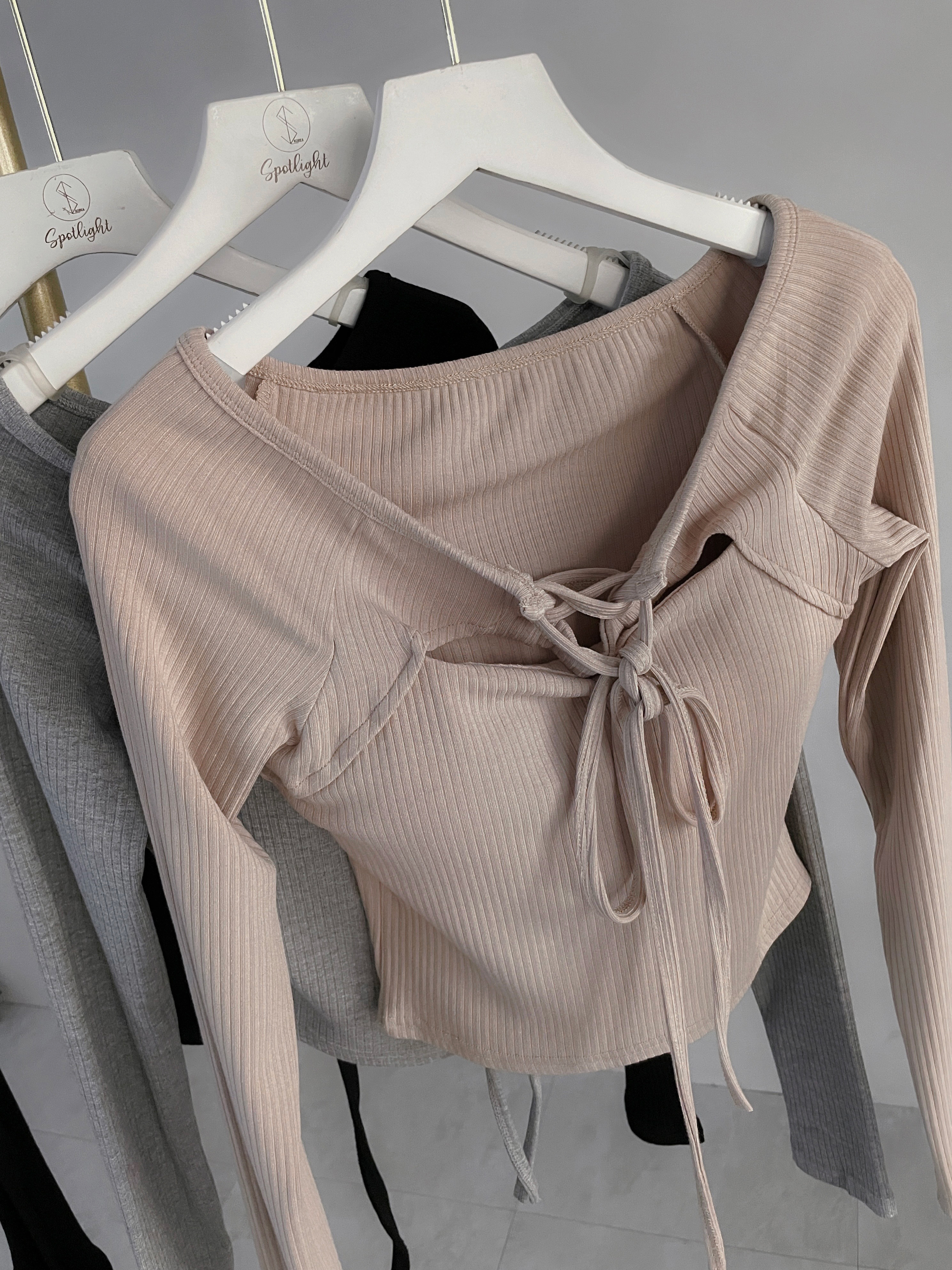 柔織合身 坑條一字綁帶挖胸長袖上衣