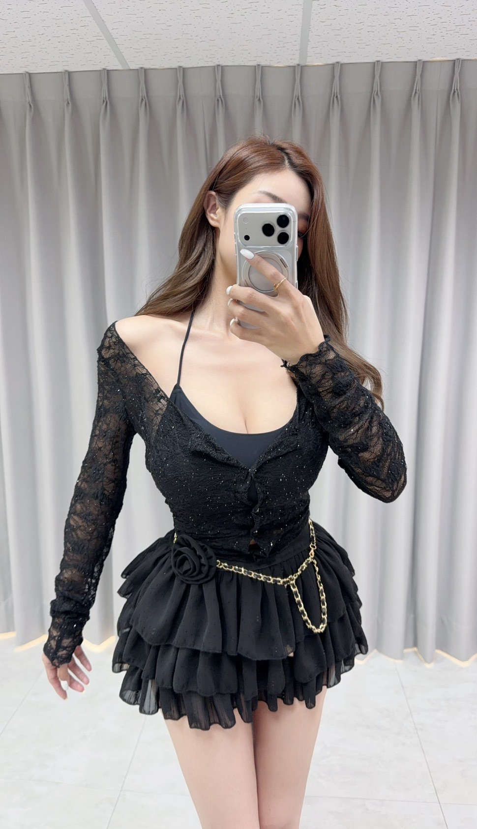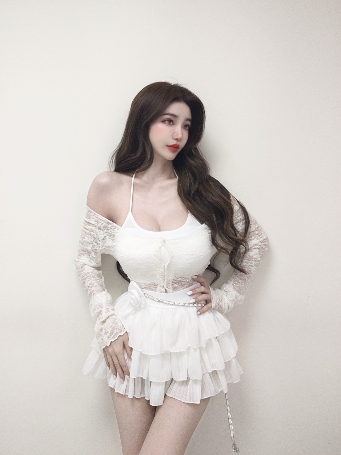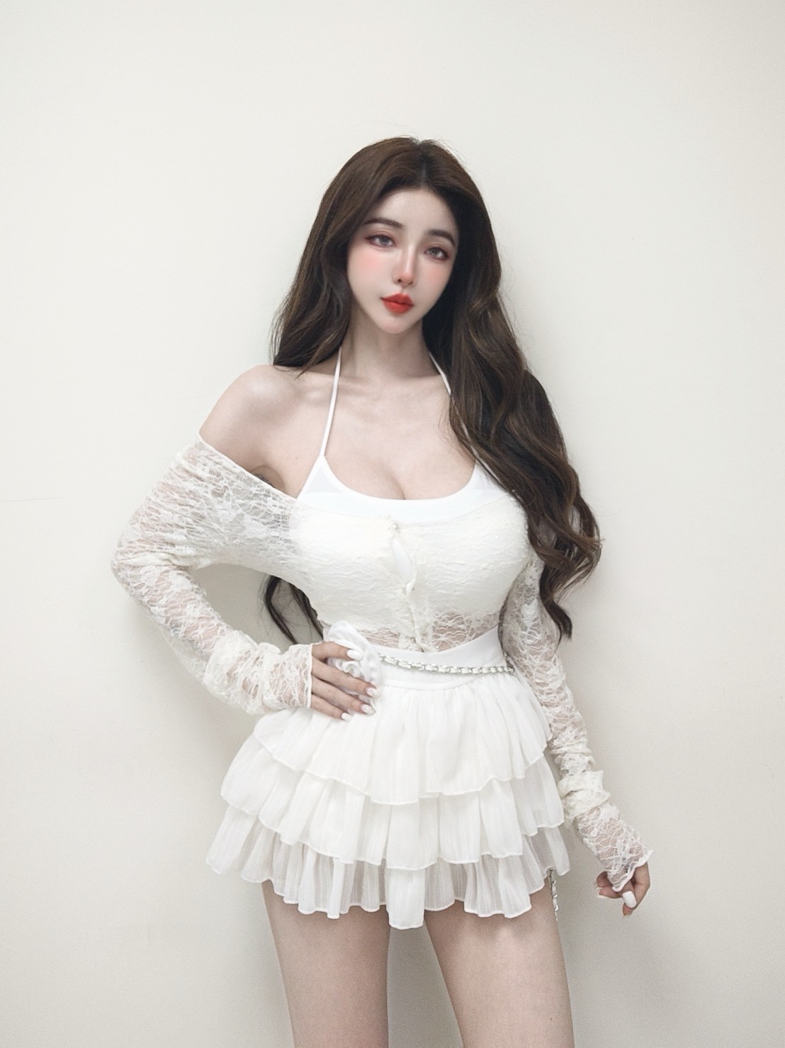【SET】優雅蕾絲珍珠鑽釦罩衫+繞脖交叉美背背心
