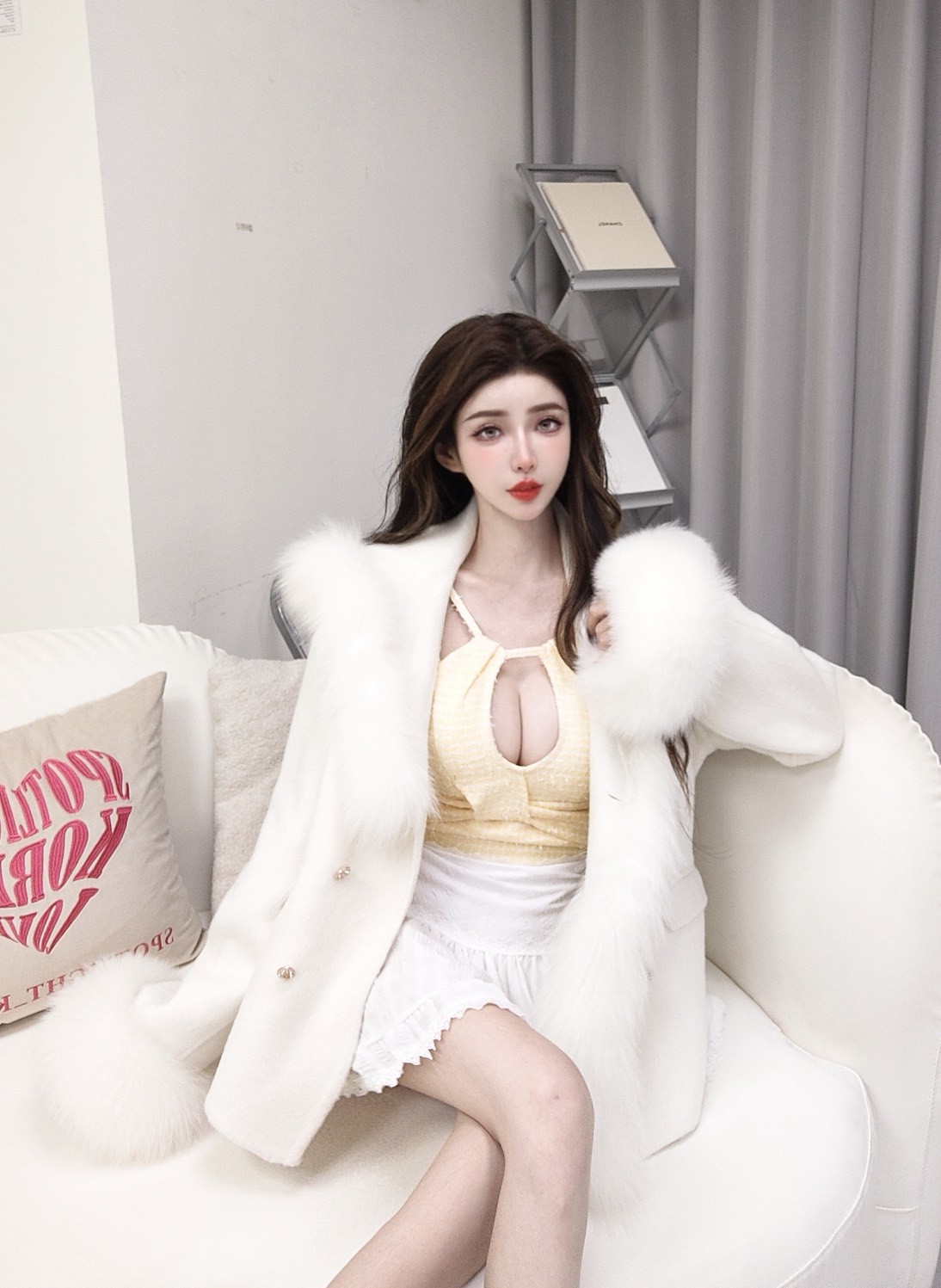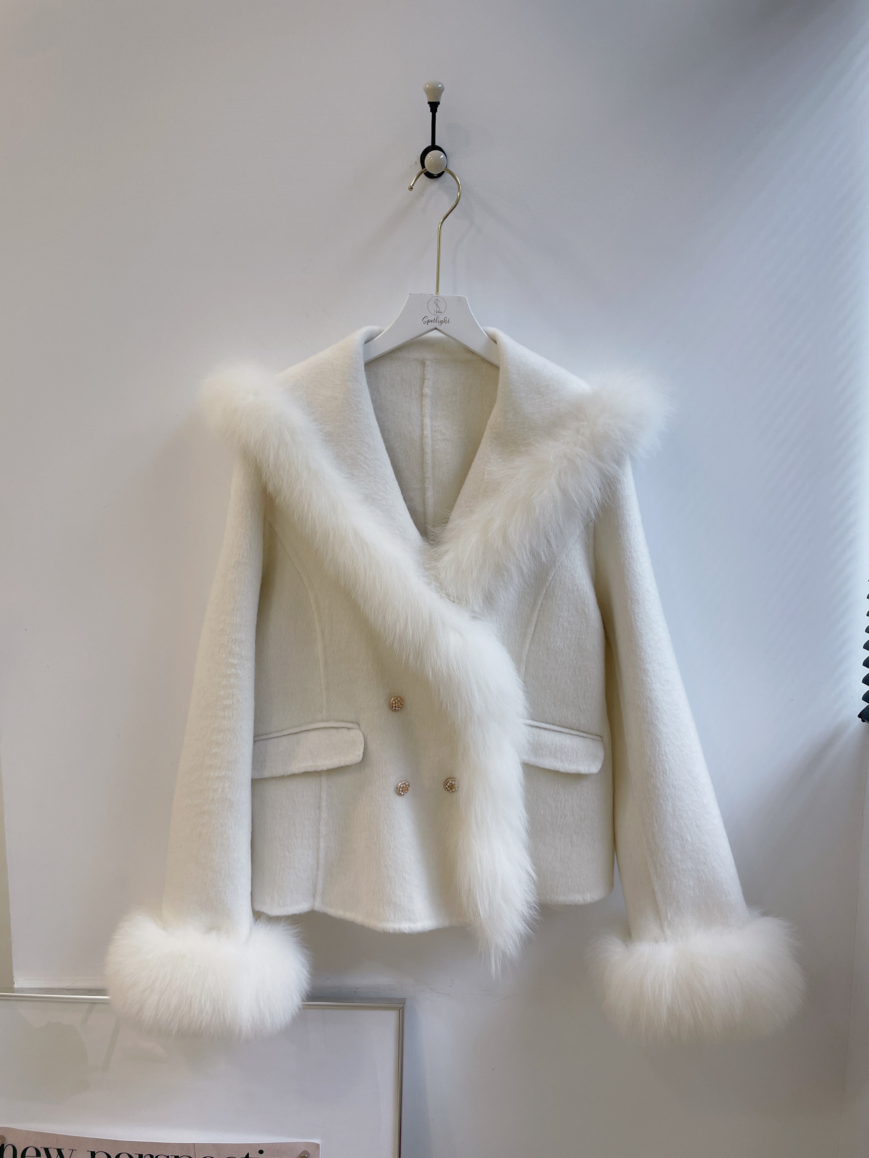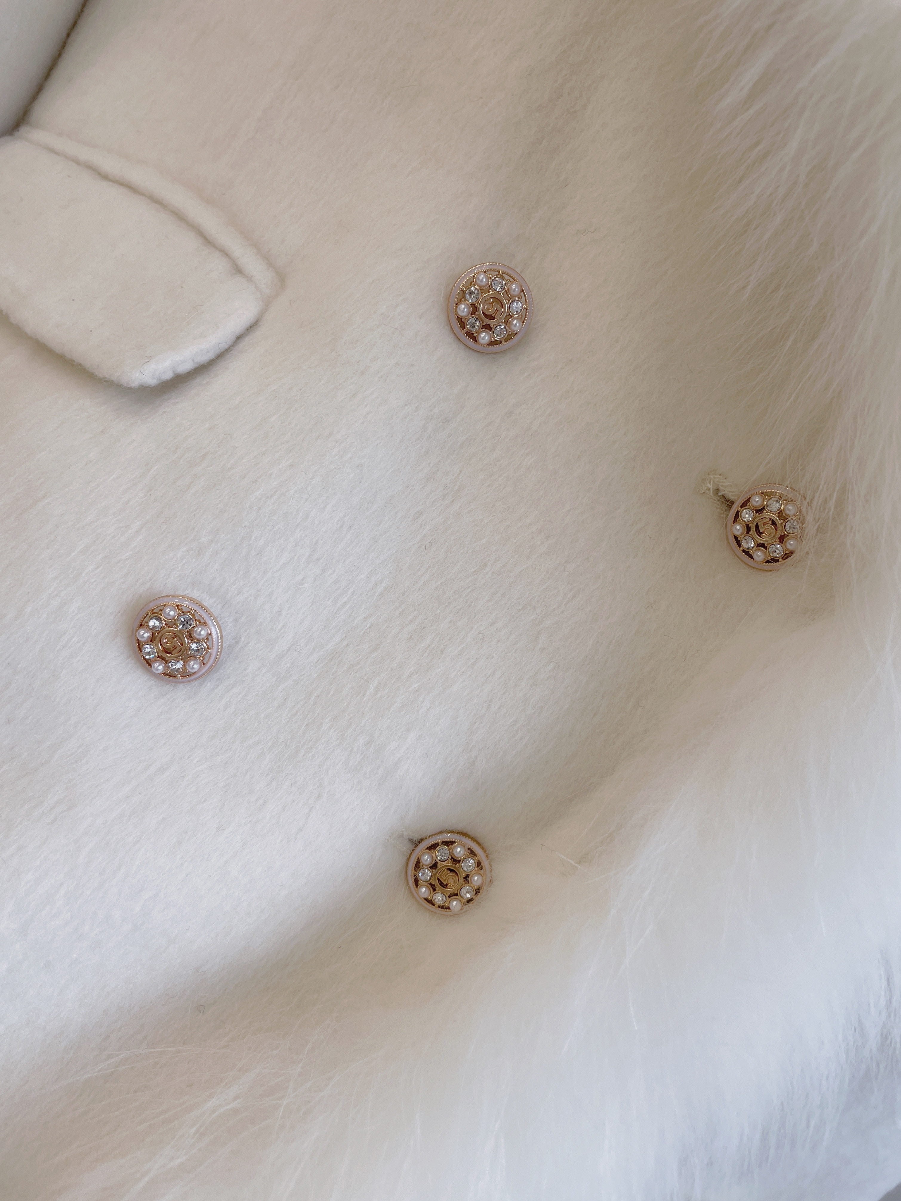 韓國100%狐狸毛拼羊絨珍珠排釦外套