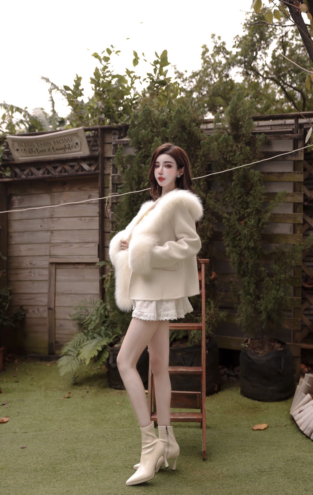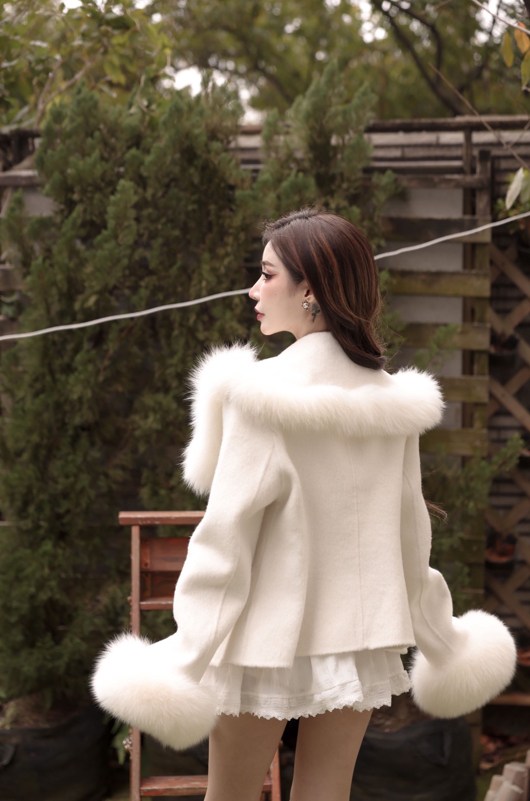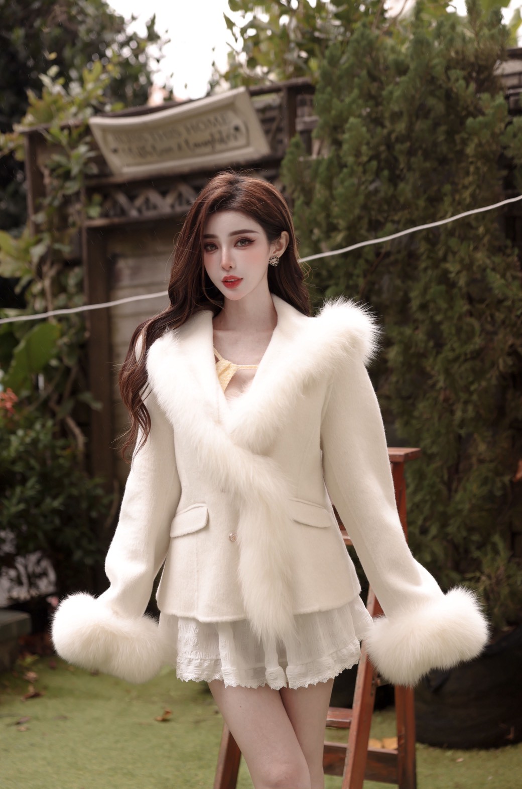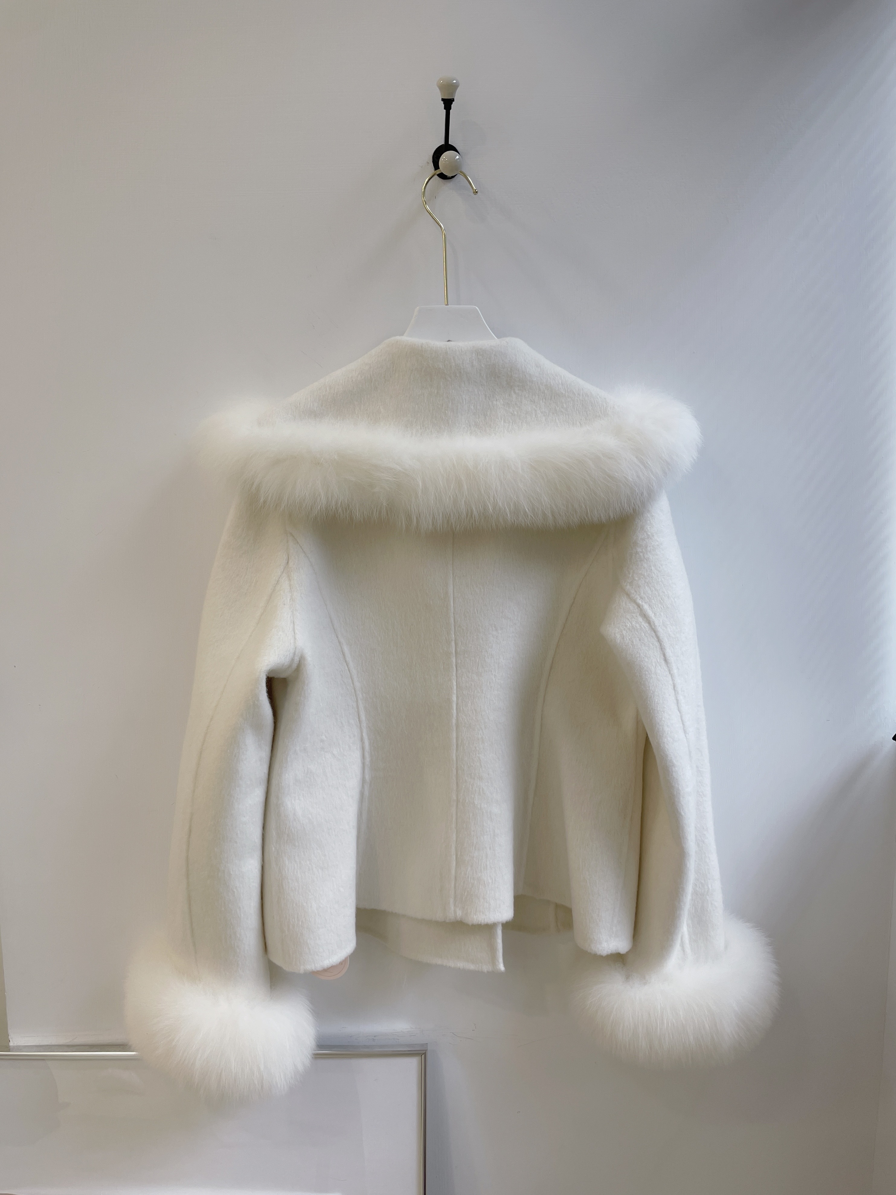 韓國100%狐狸毛拼羊絨珍珠排釦外套