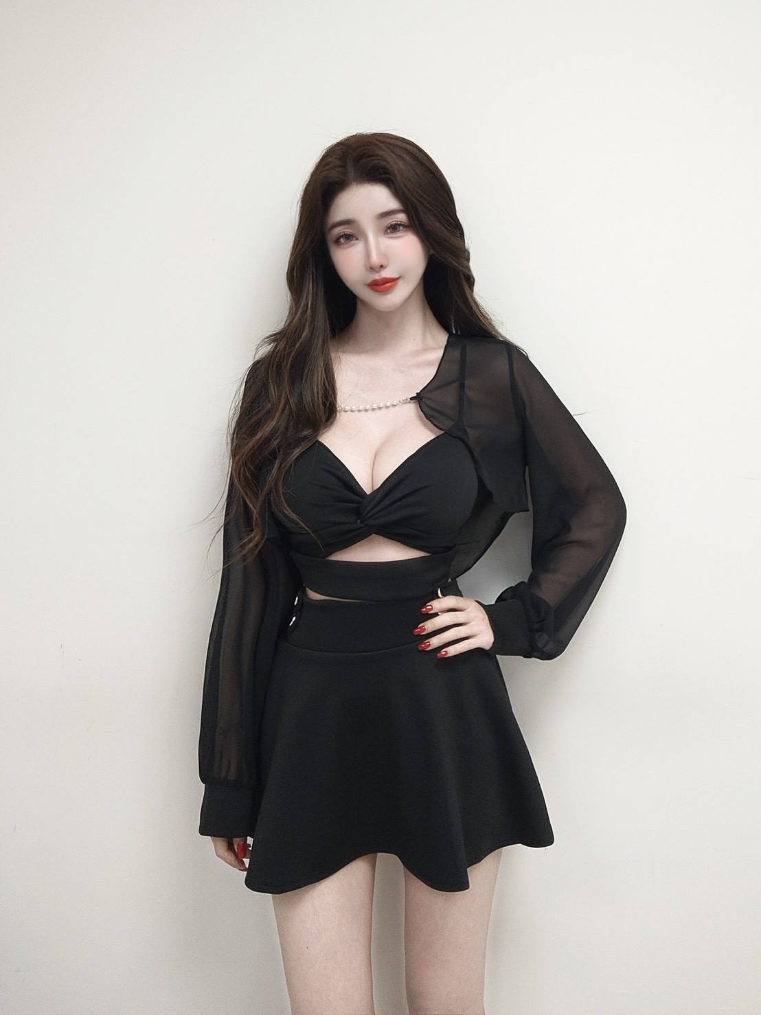【SET】紐結挖腰馬甲+珍珠鏈罩衫