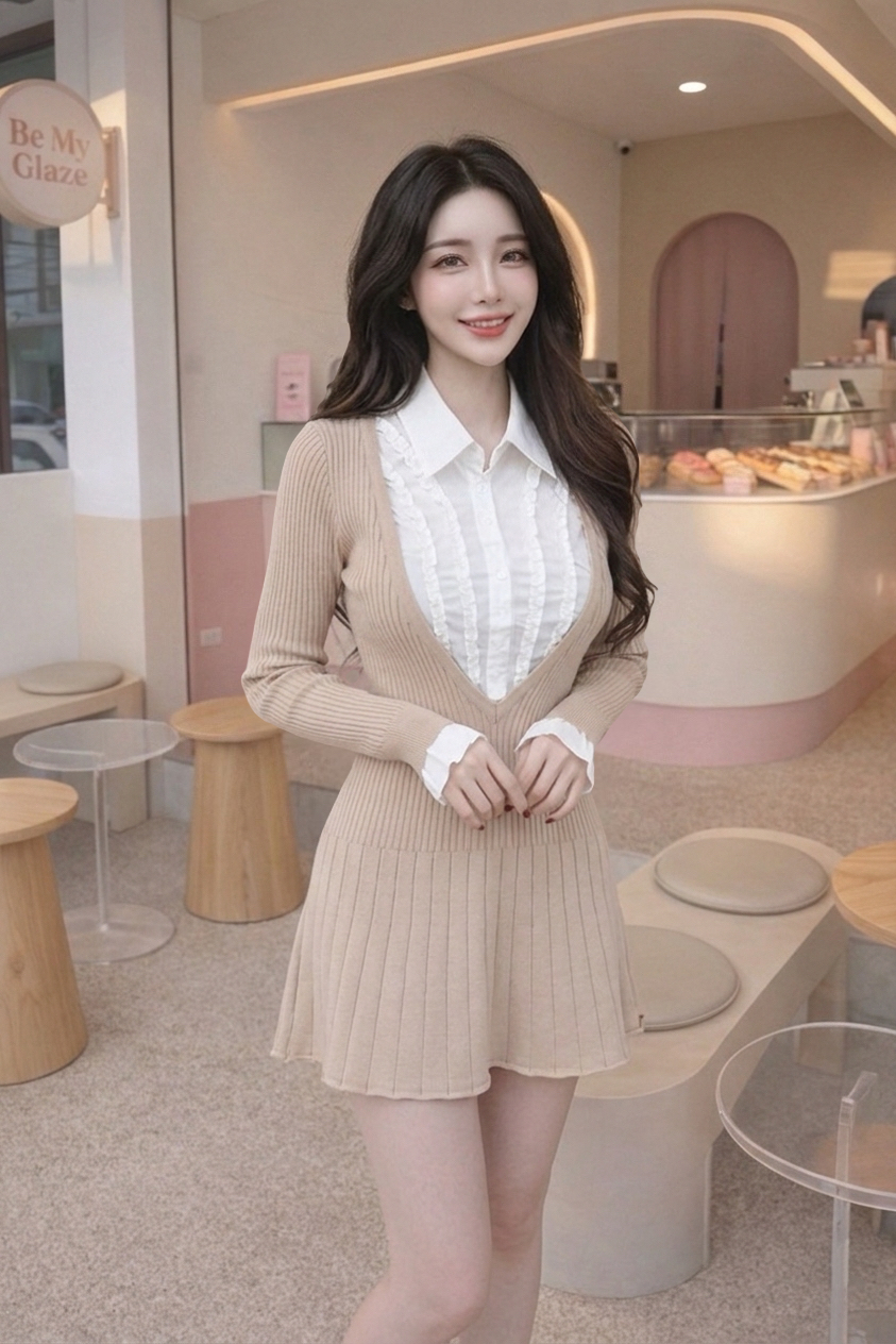 奶泡甜心 假兩件襯衫坑條傘洋