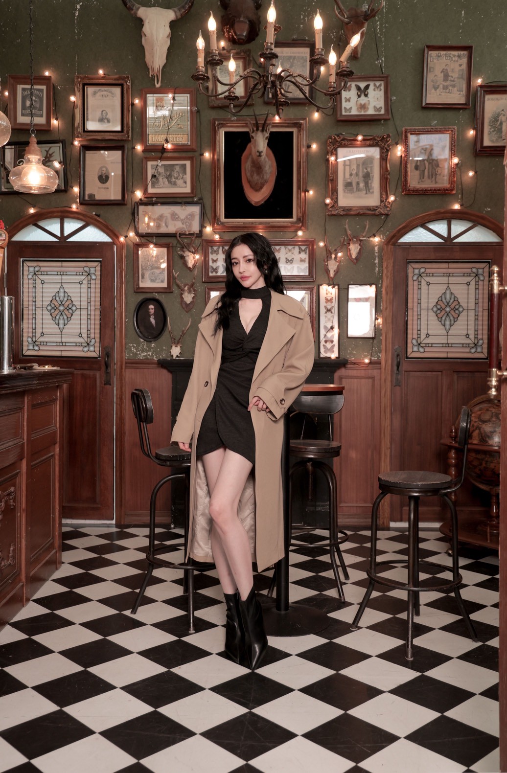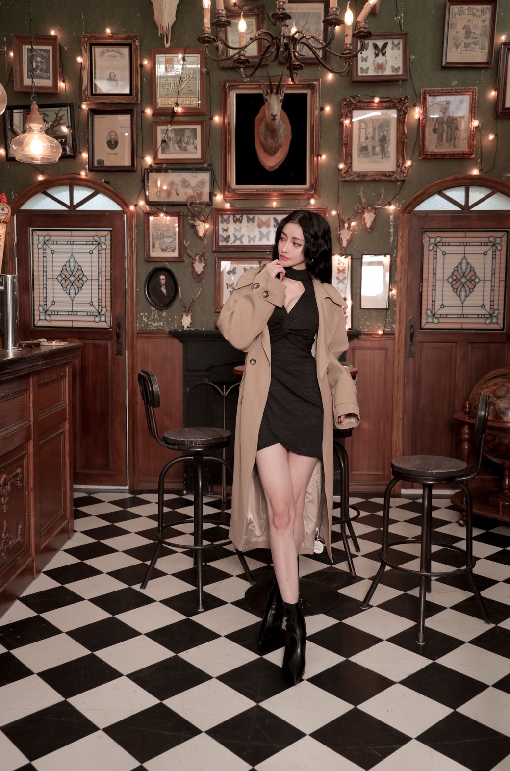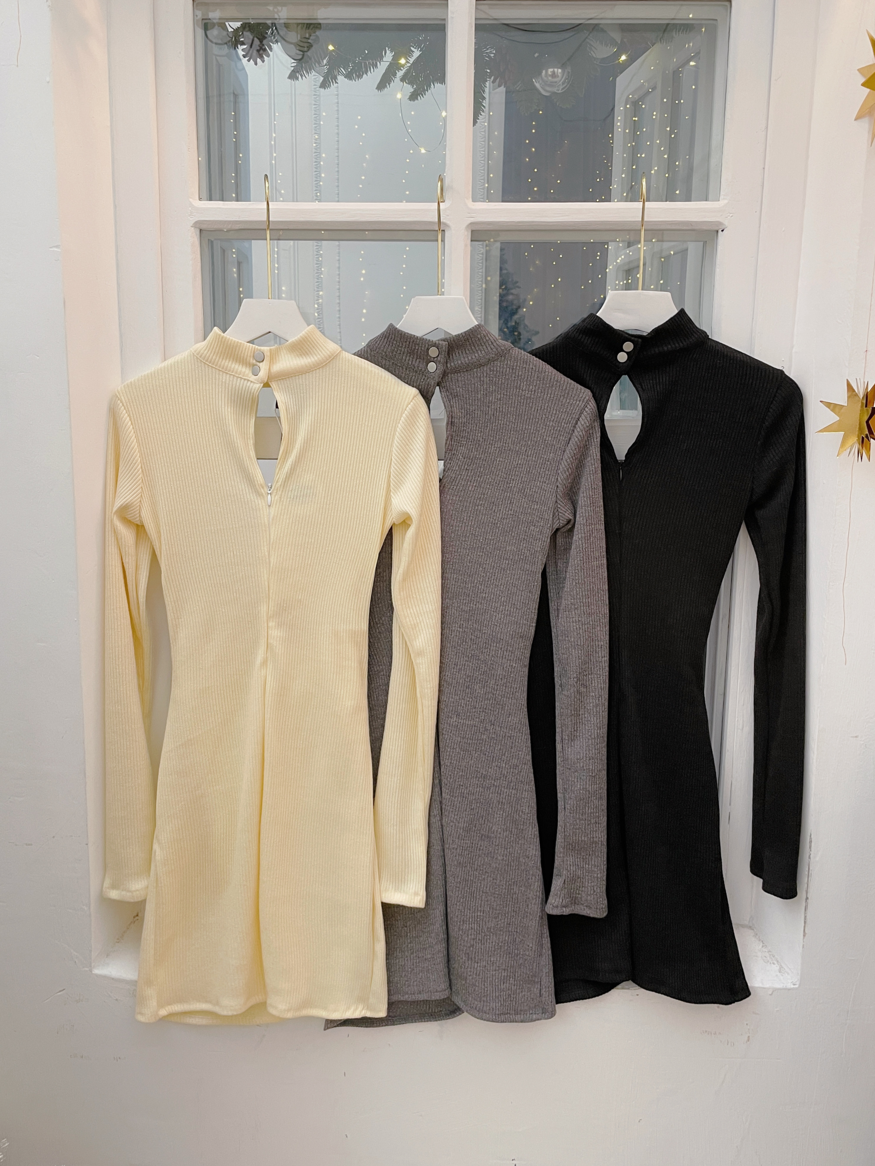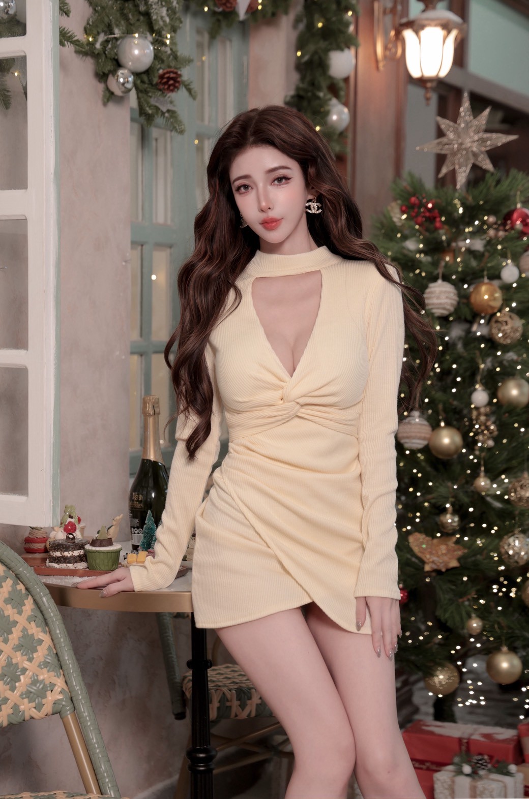 立領繞脖+後壓釦、隱形拉鍊,穿脫穩定又快速;超深V胸紐結剪裁,自然托住胸型並拉出迷人線條,內附胸墊讓穿著更安心。