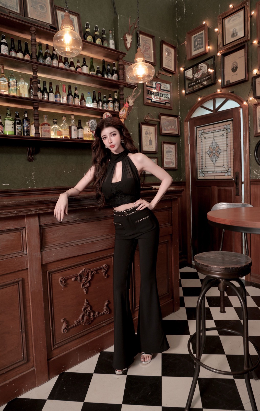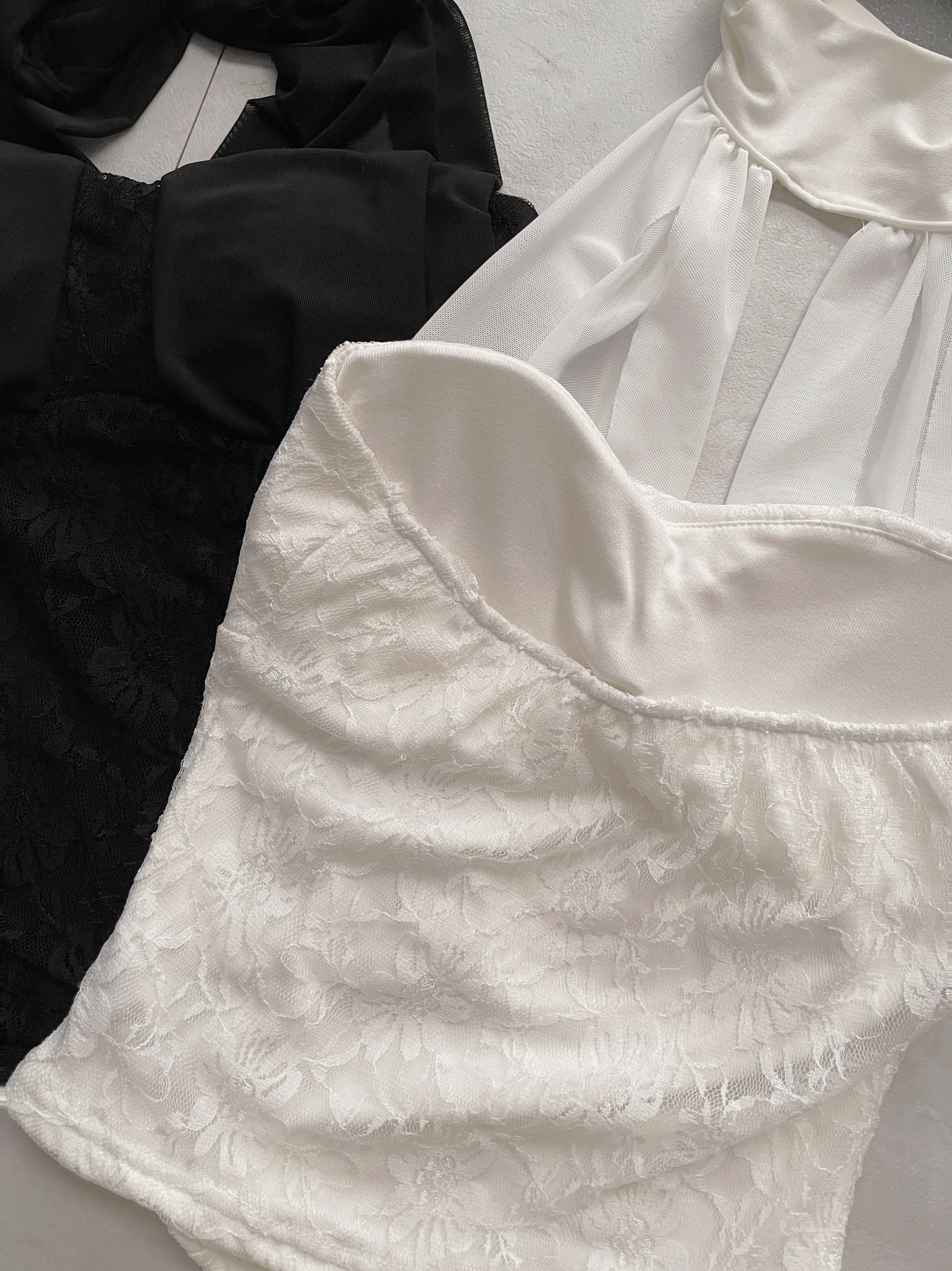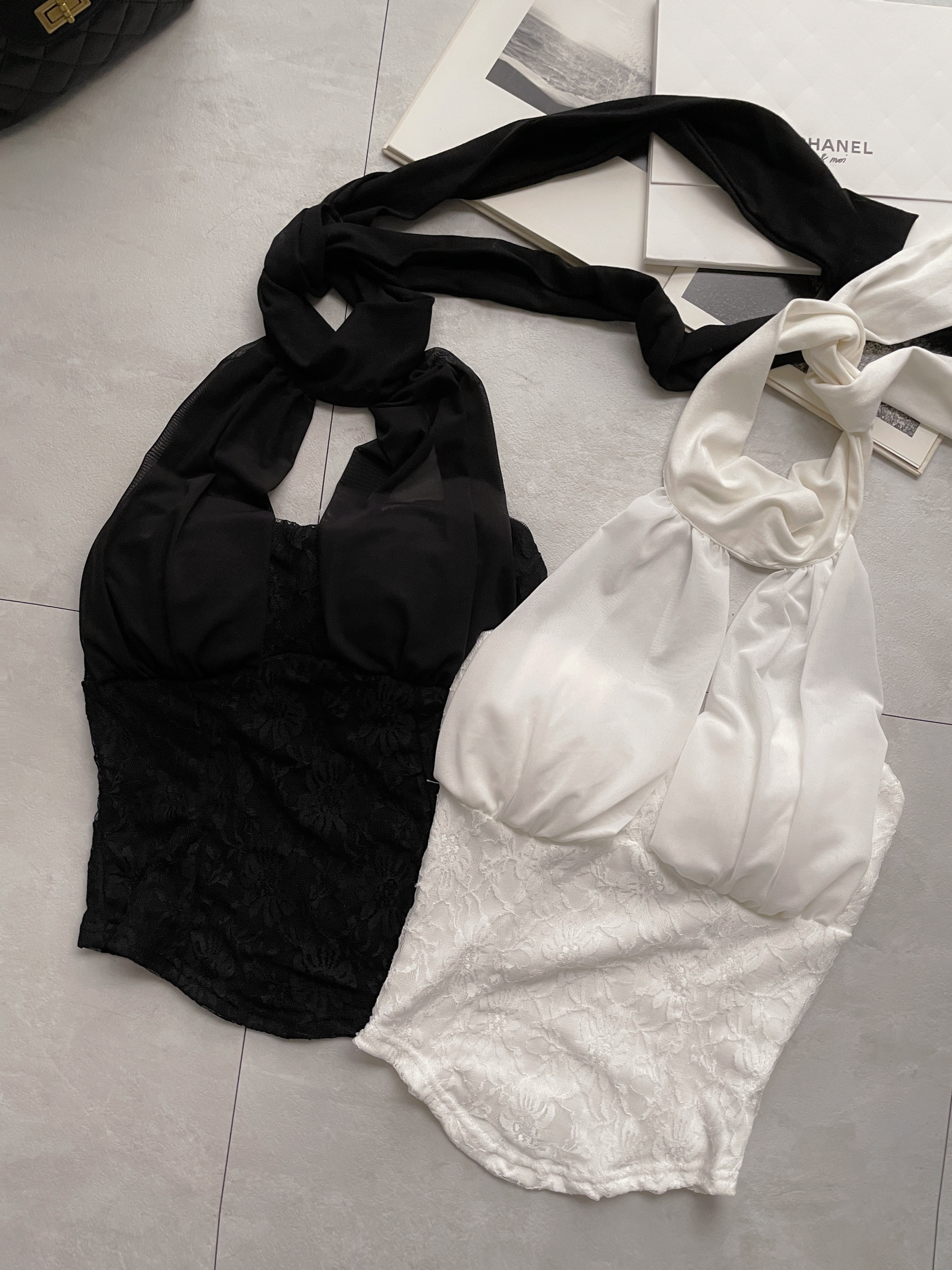 平口鏤空網紗繞脖綁帶蕾絲背心