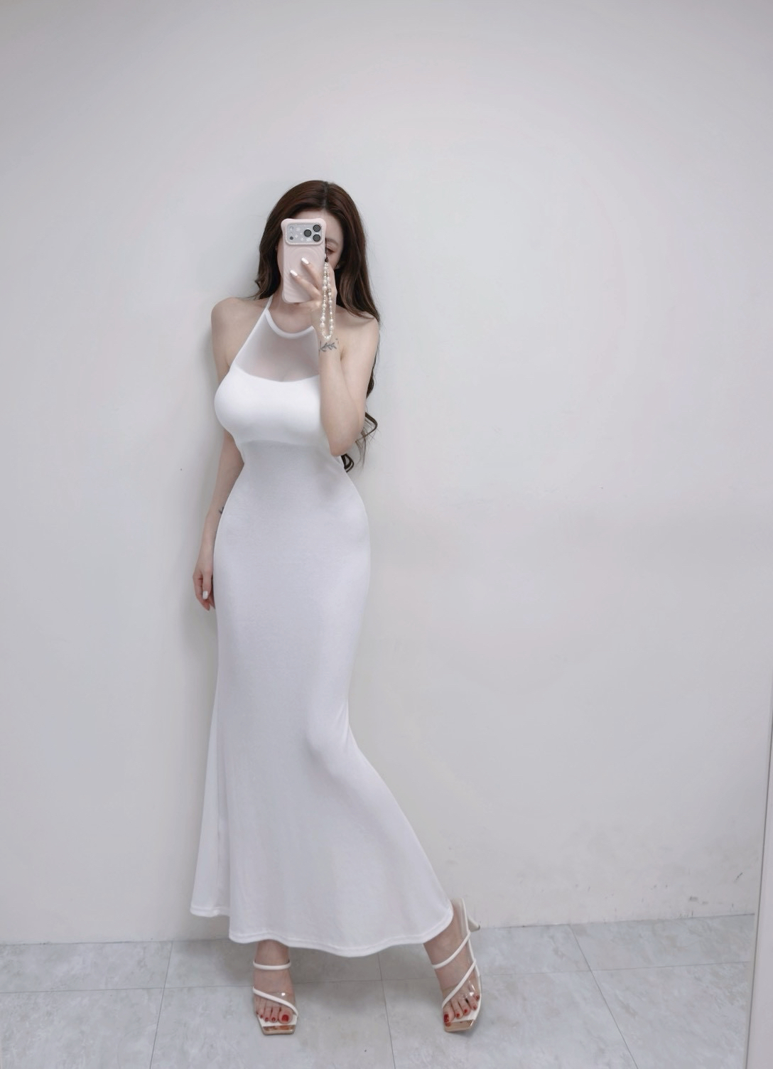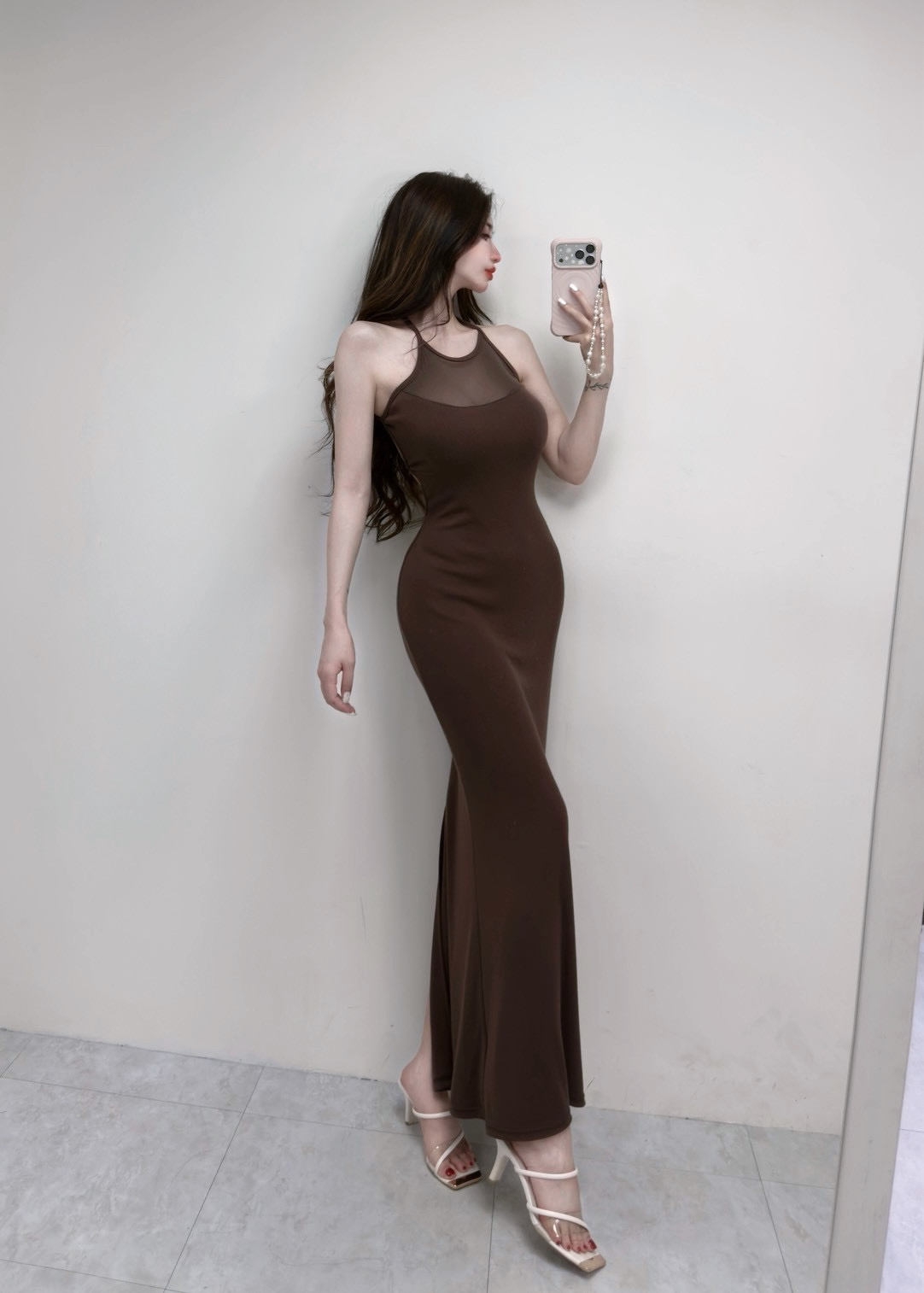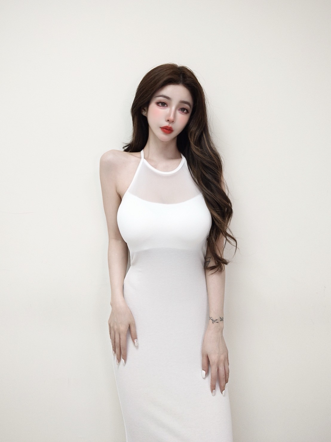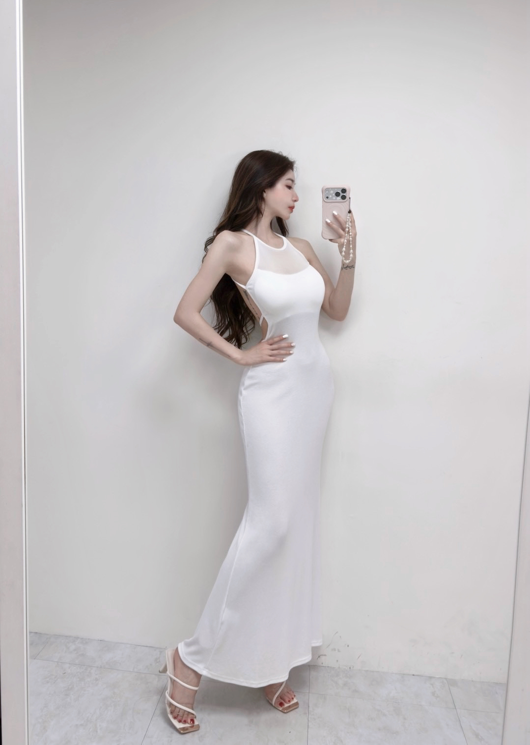 韓國削肩美背羅紋透紗開衩長洋裝