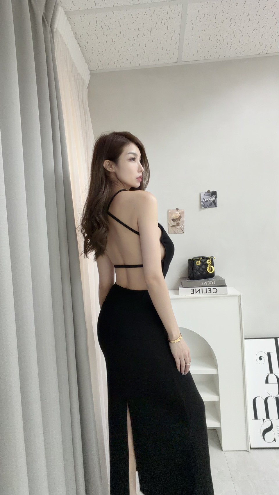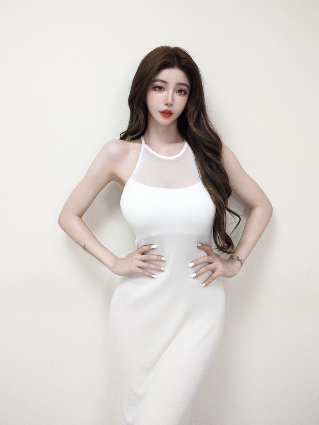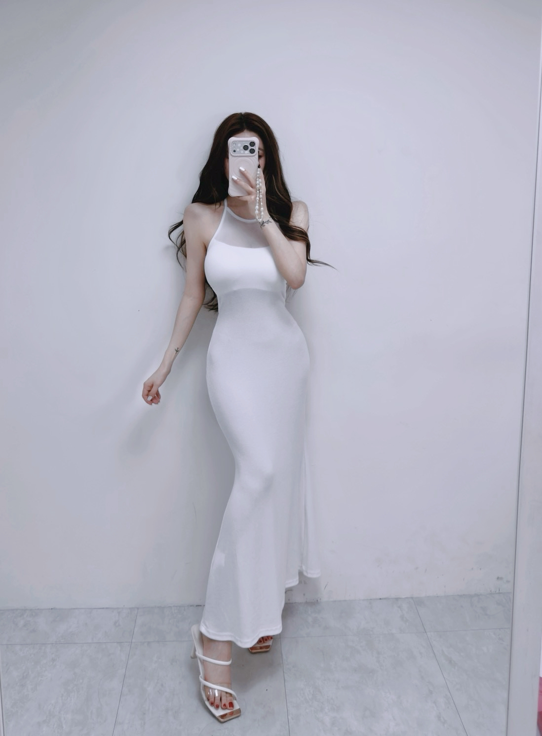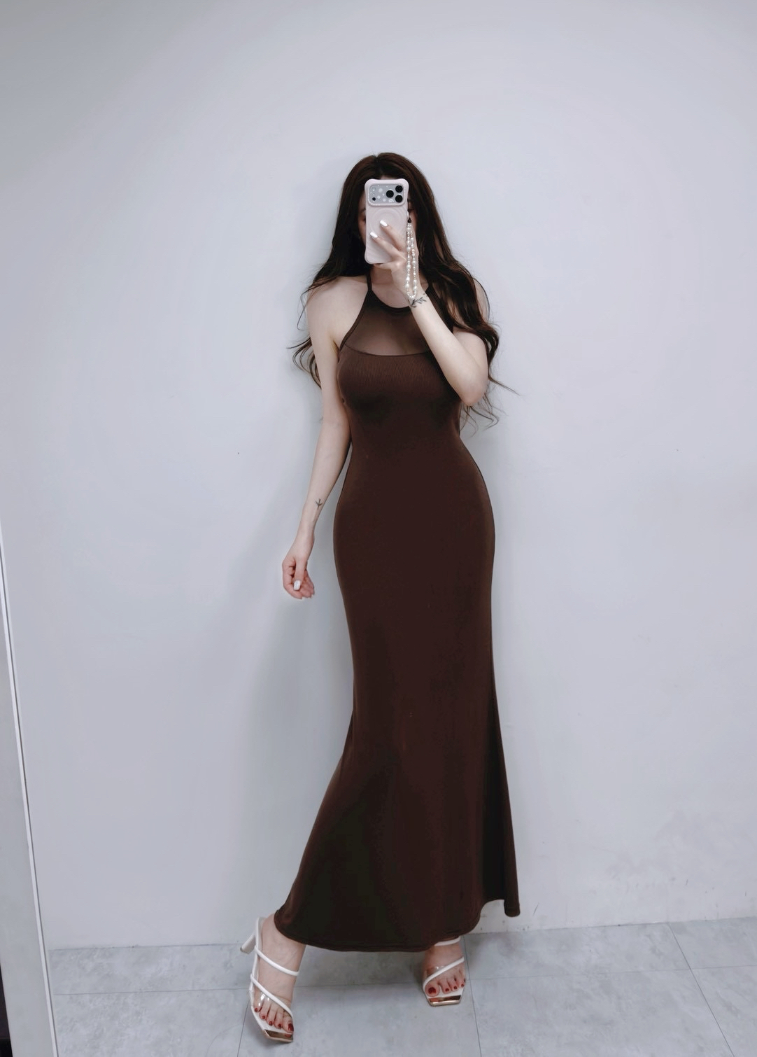 韓國削肩美背羅紋透紗開衩長洋裝
