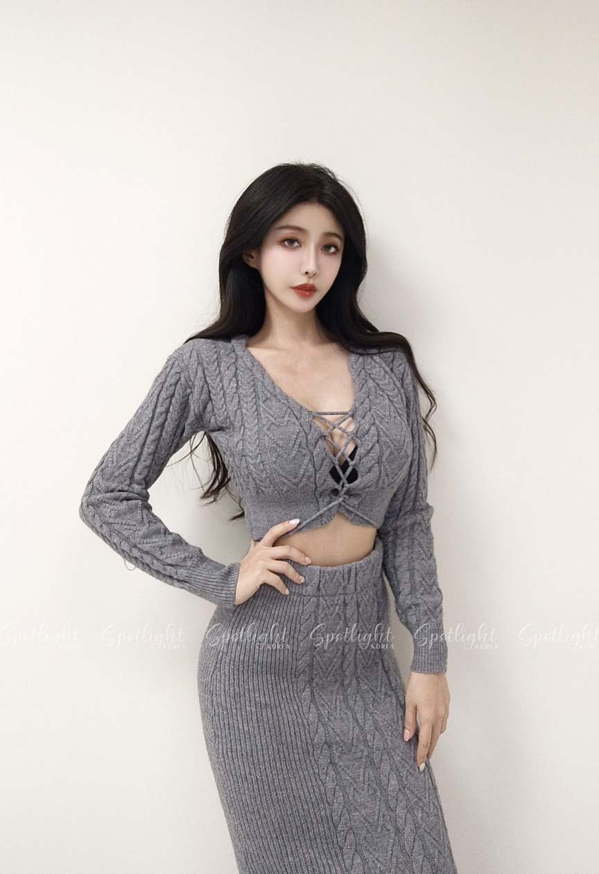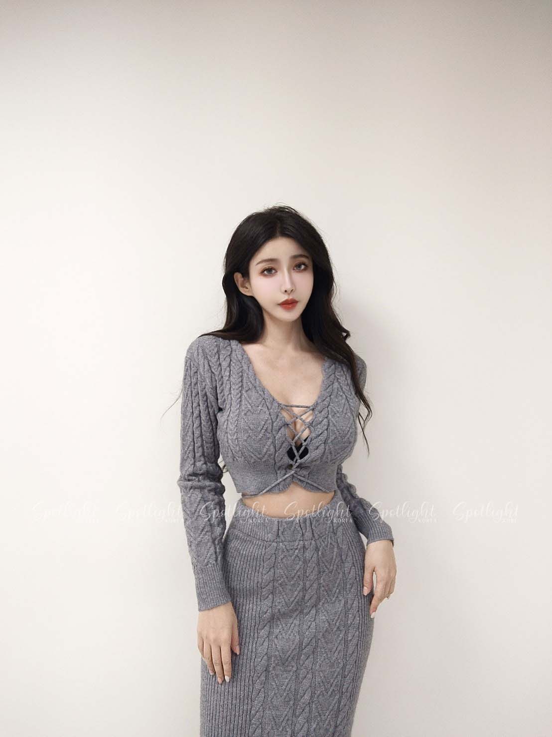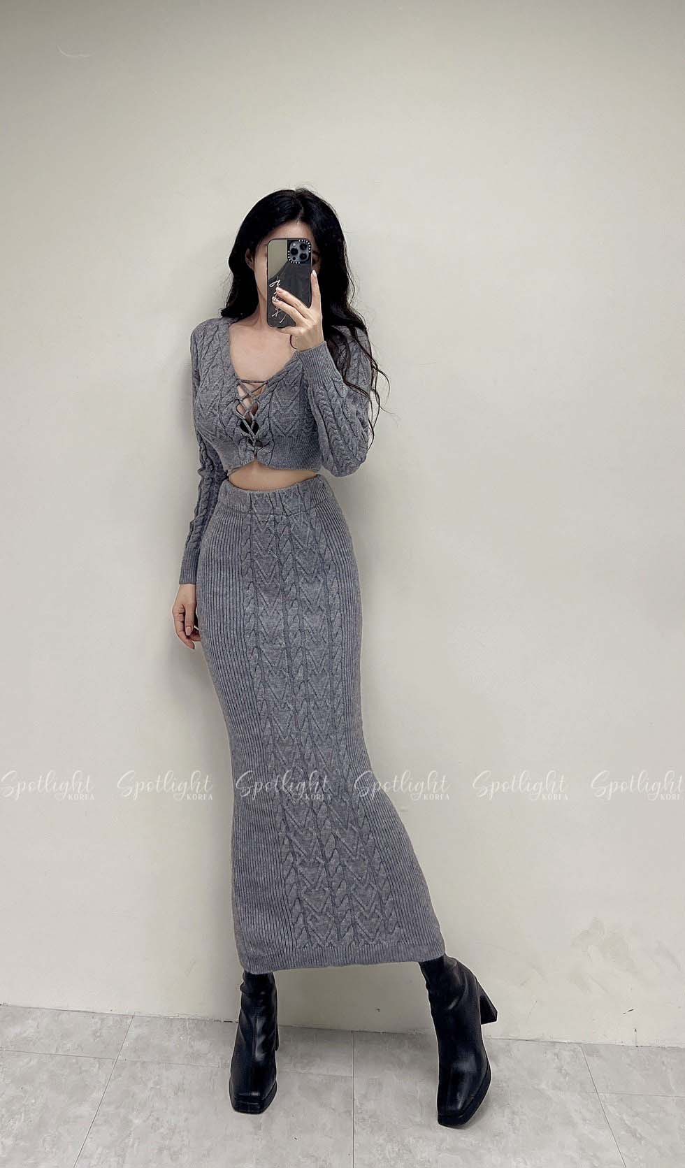 【SET】性感暖呼呼 麻花針織穿繩上衣+後開衩長裙