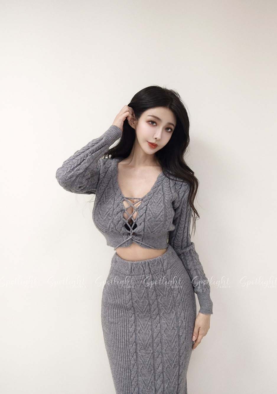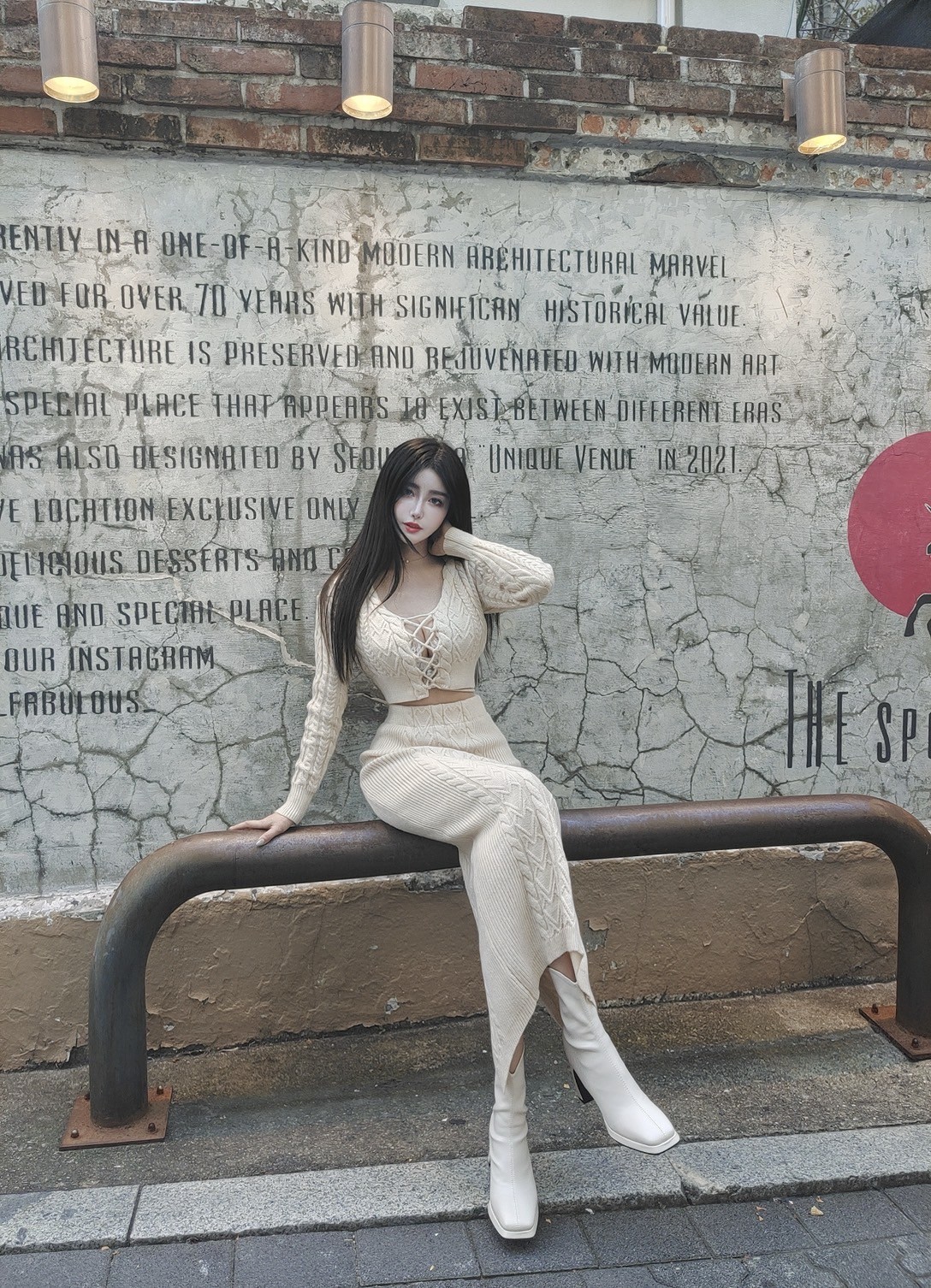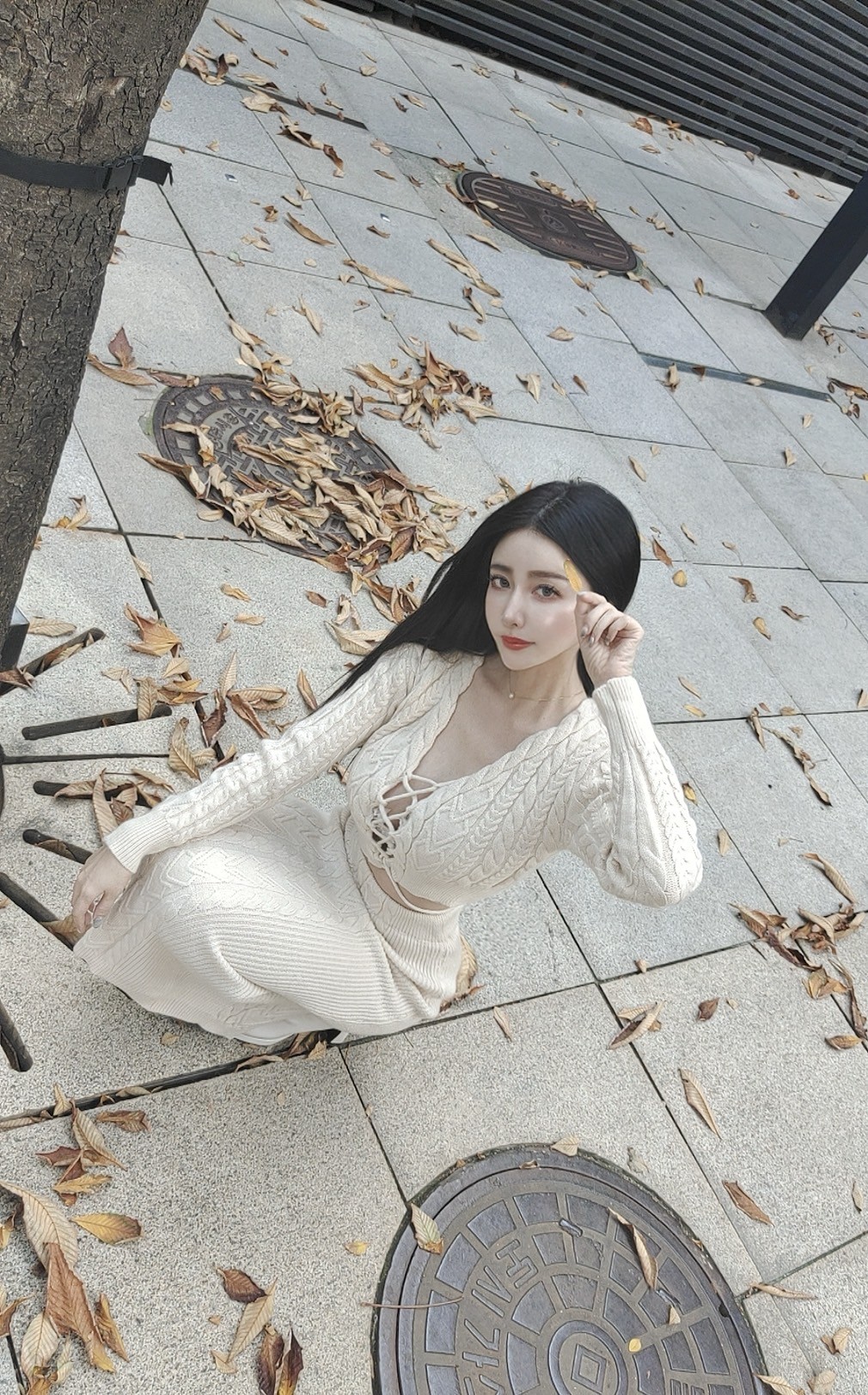 【SET】性感暖呼呼 麻花針織穿繩上衣+後開衩長裙