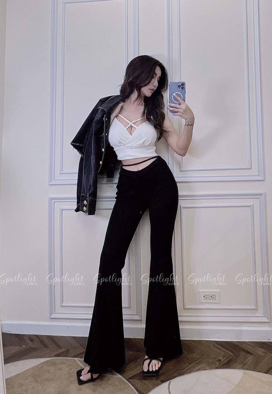 絕對激瘦款 韓國露腰線條重磅喇叭褲