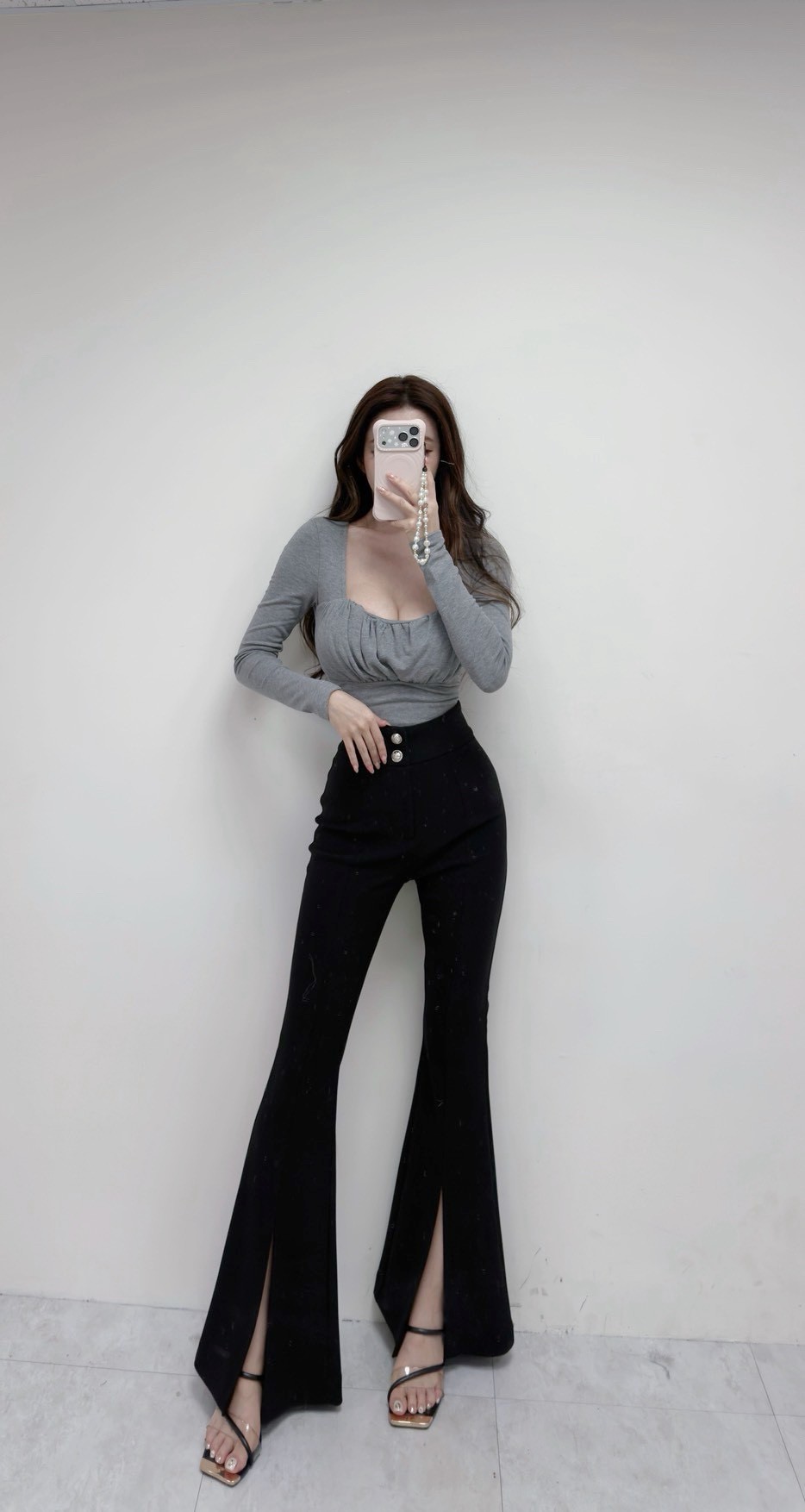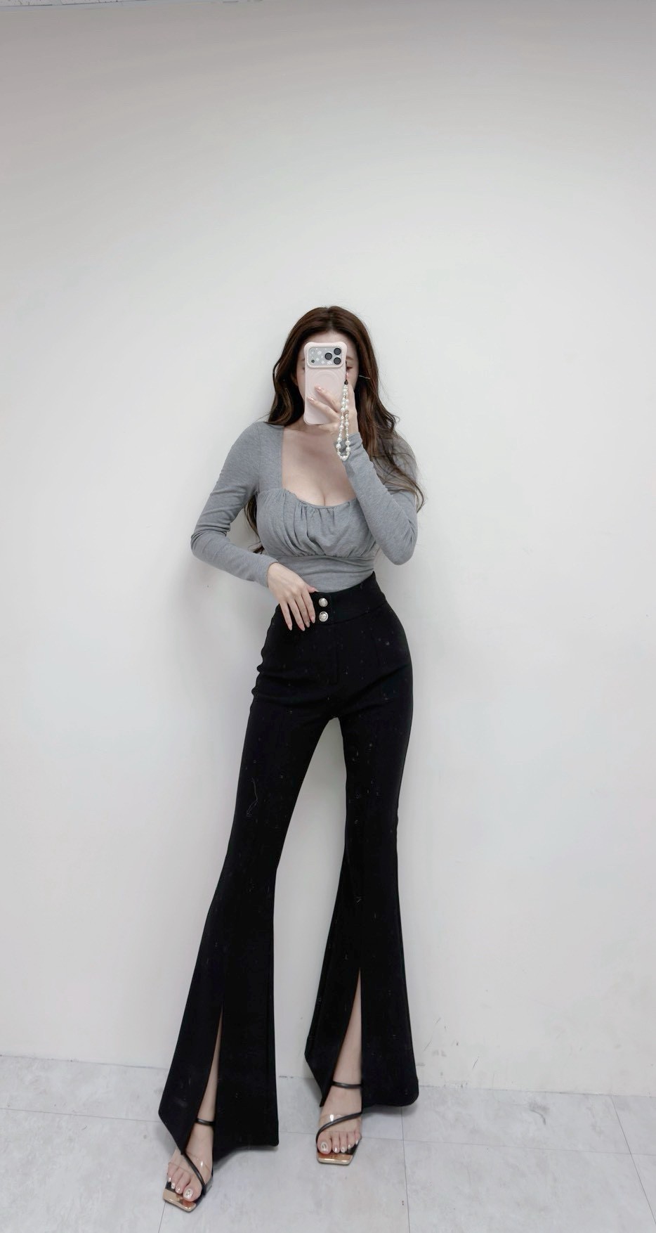 喇叭褲版型自然修飾大腿與小腿線條,下襬開衩設計,走動間延伸腿部視覺,顯瘦不厚重。