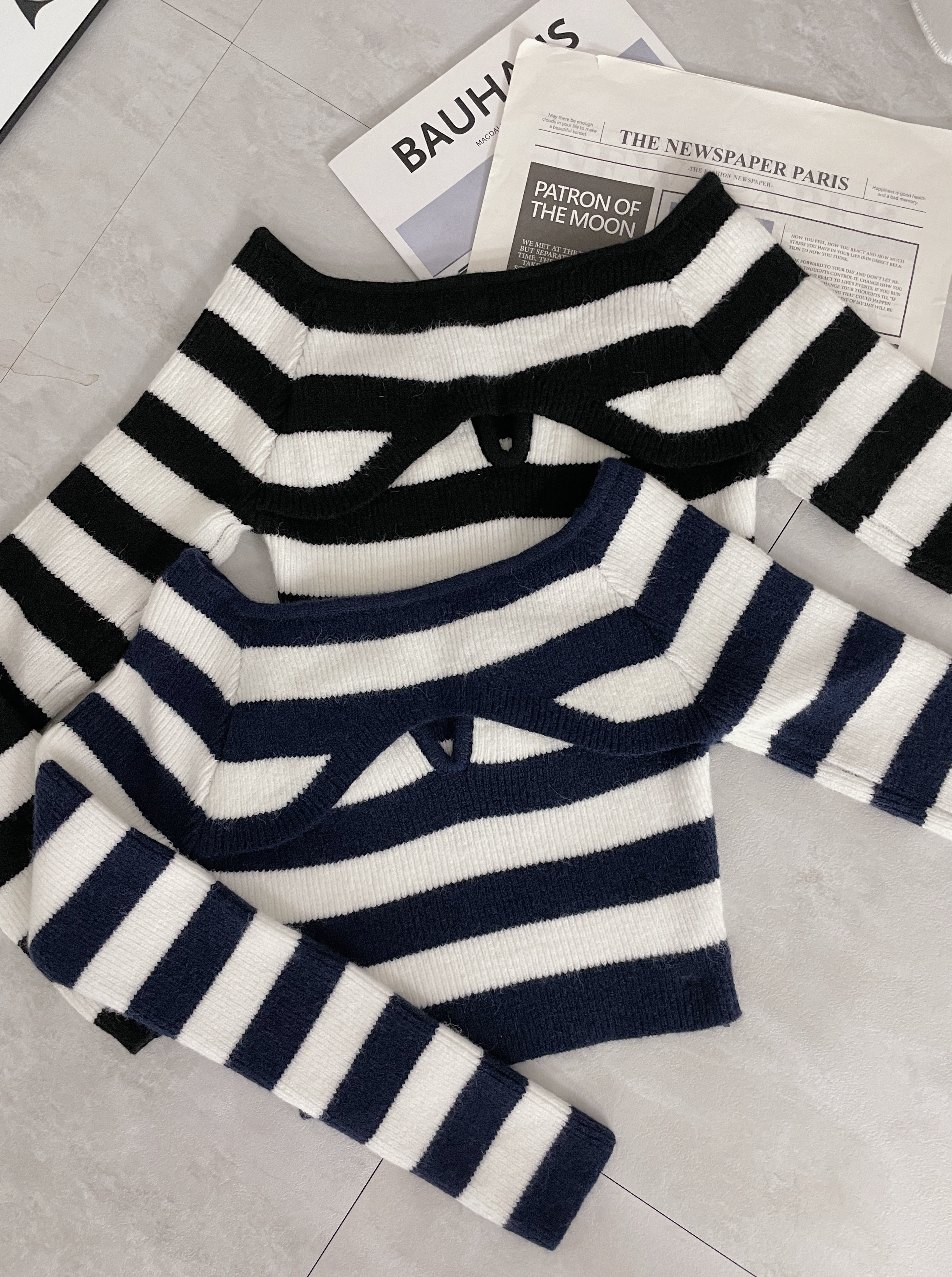 撞色條紋挖胸針織上衣