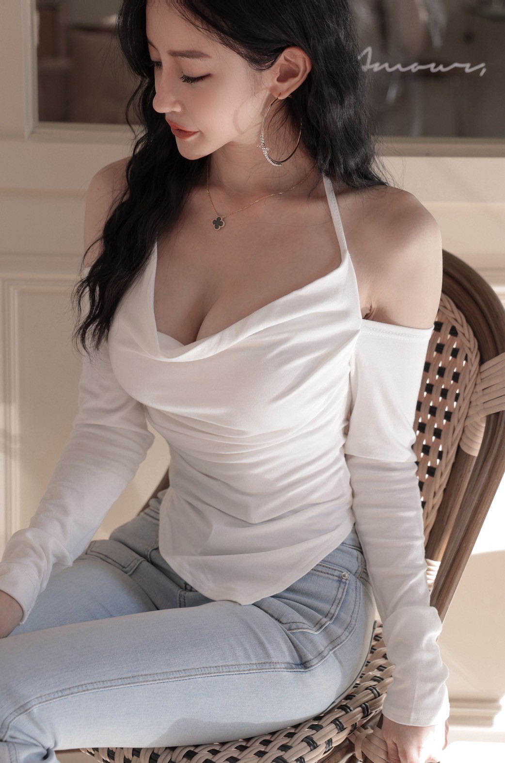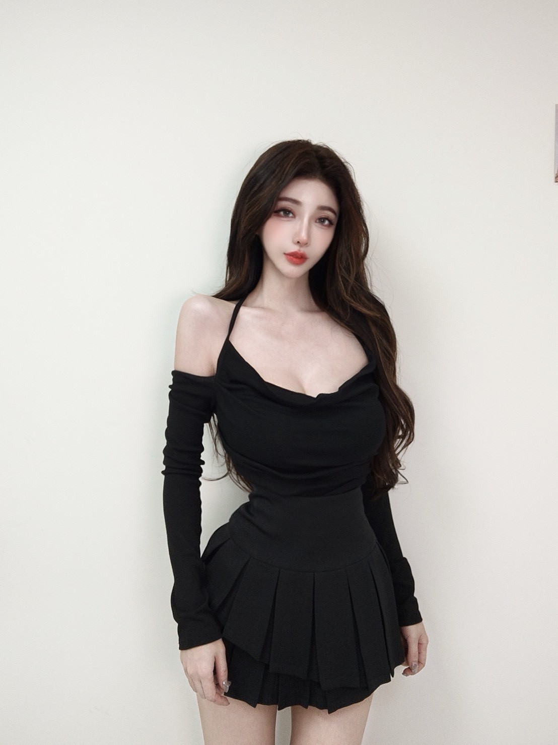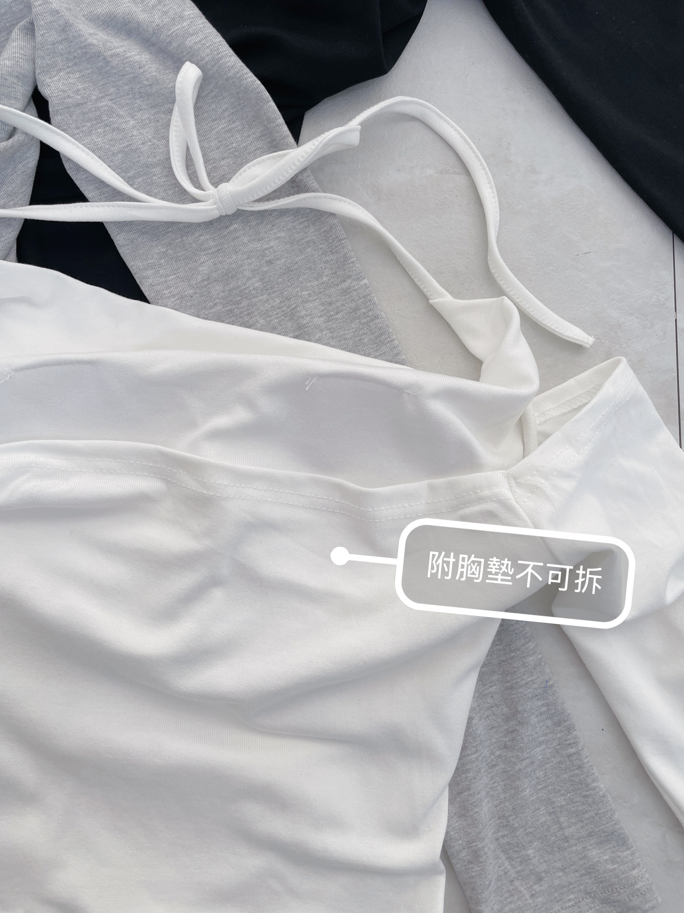 繞脖綁帶一字抓皺長袖上衣(附罩杯