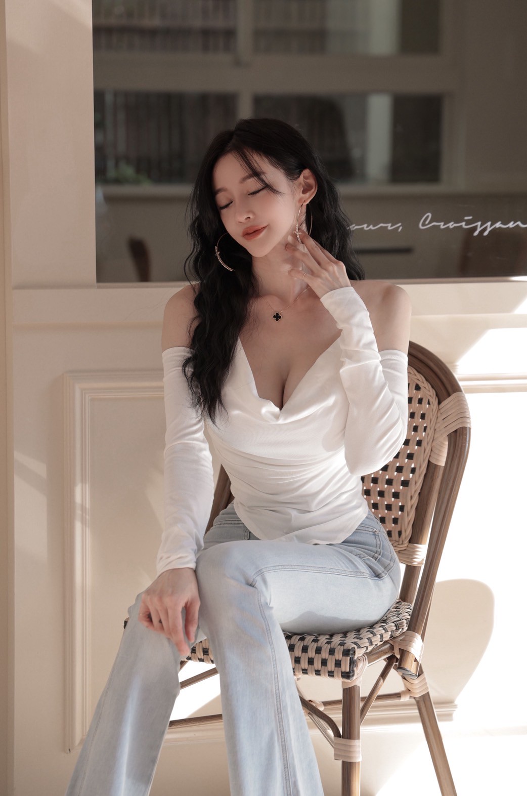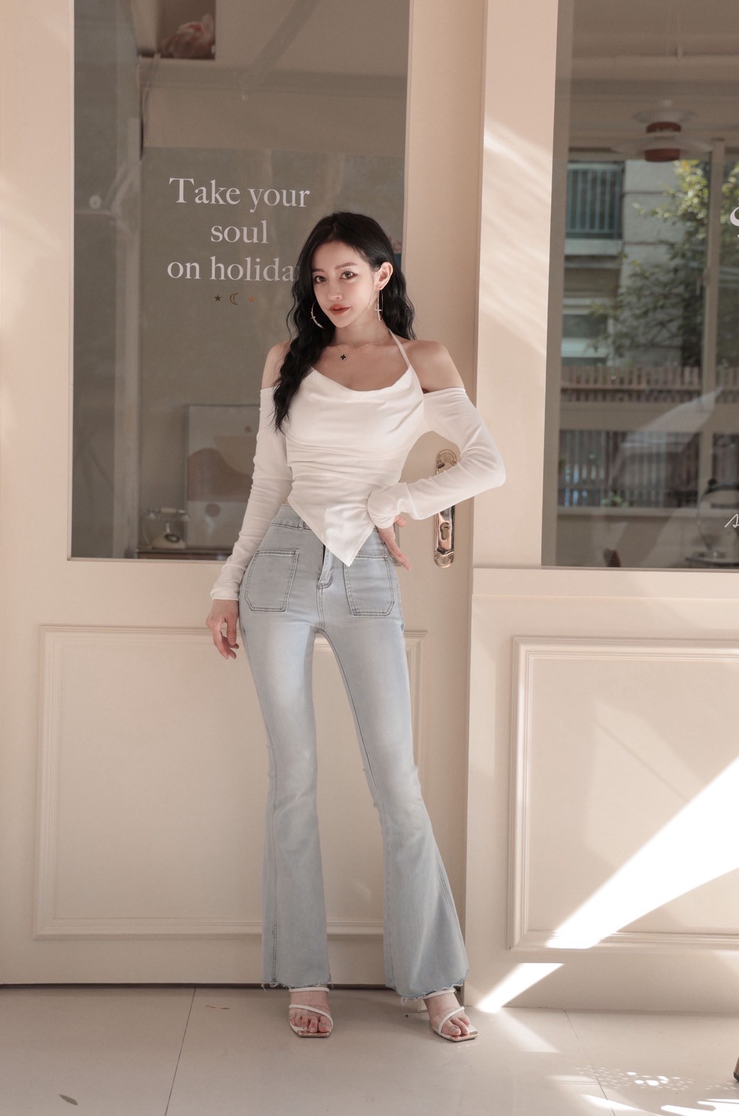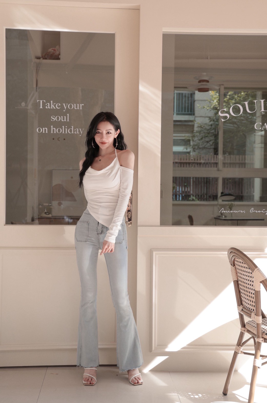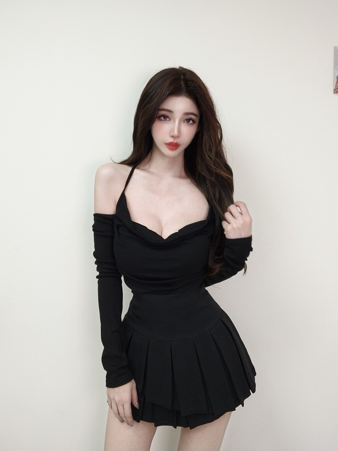 繞脖綁帶一字抓皺長袖上衣(附罩杯