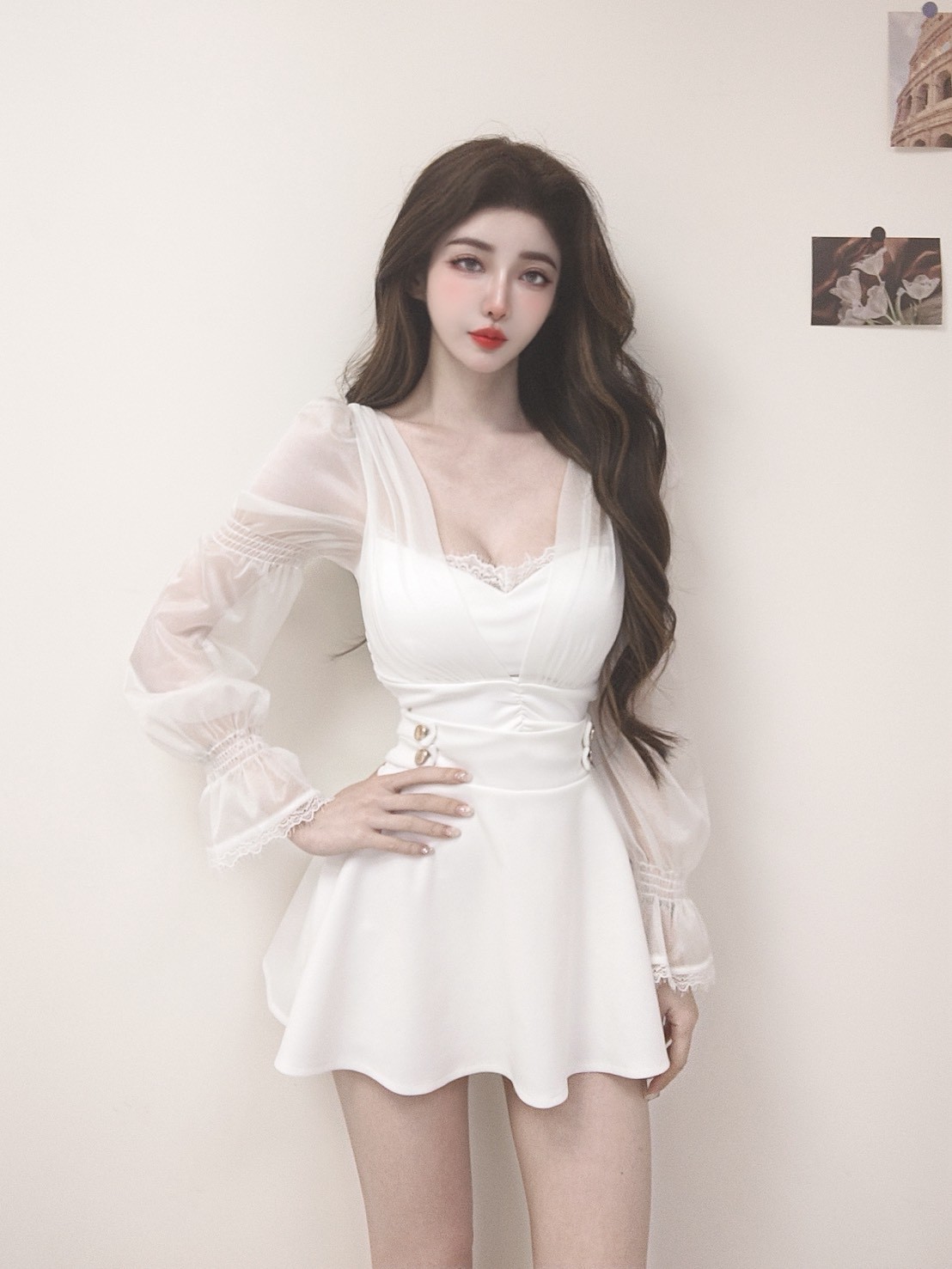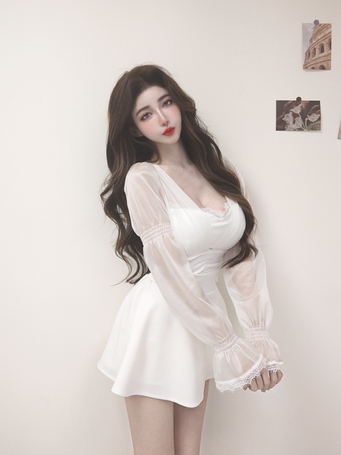 雪紗綻放 桃心拼蕾絲假兩件柔紗上衣