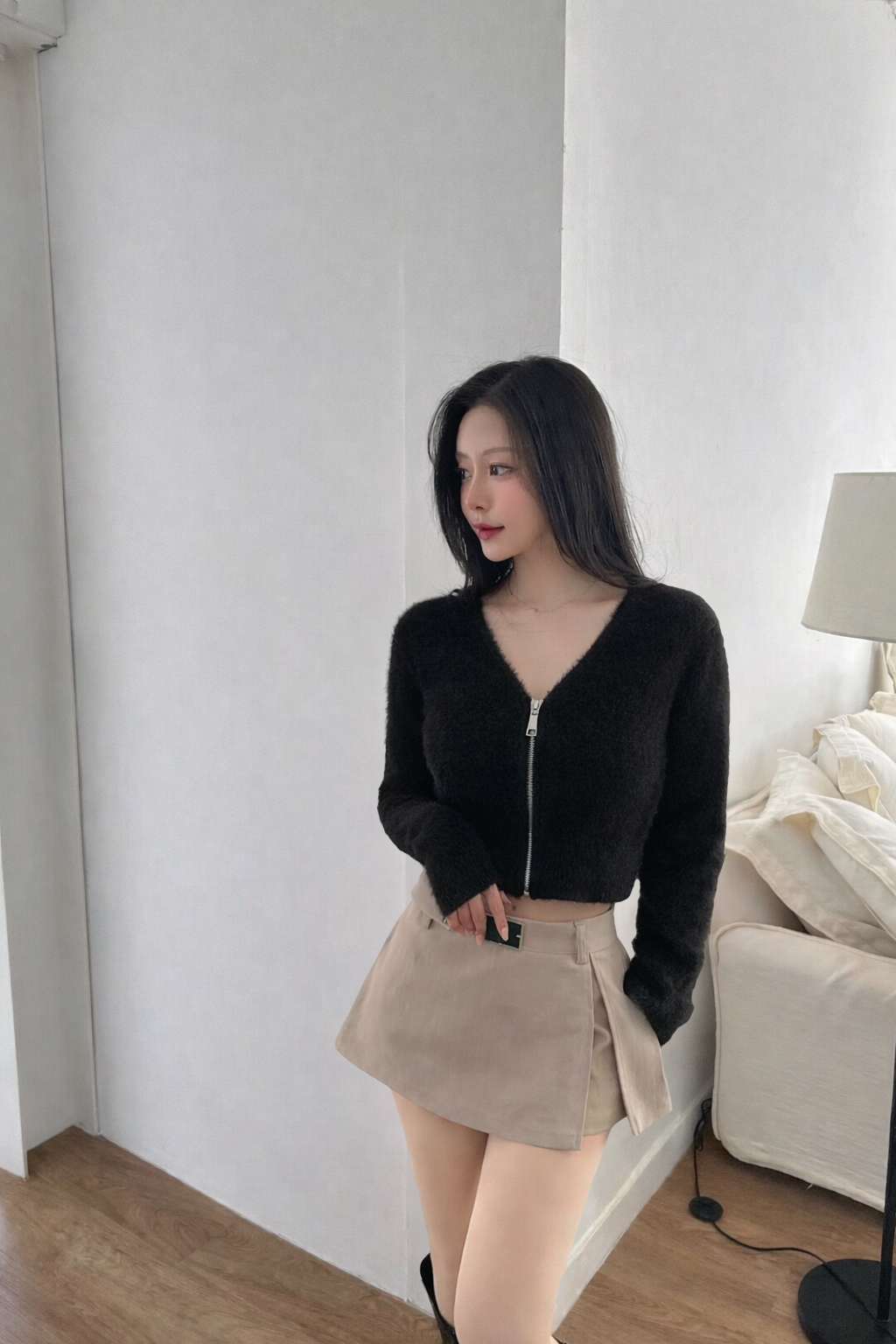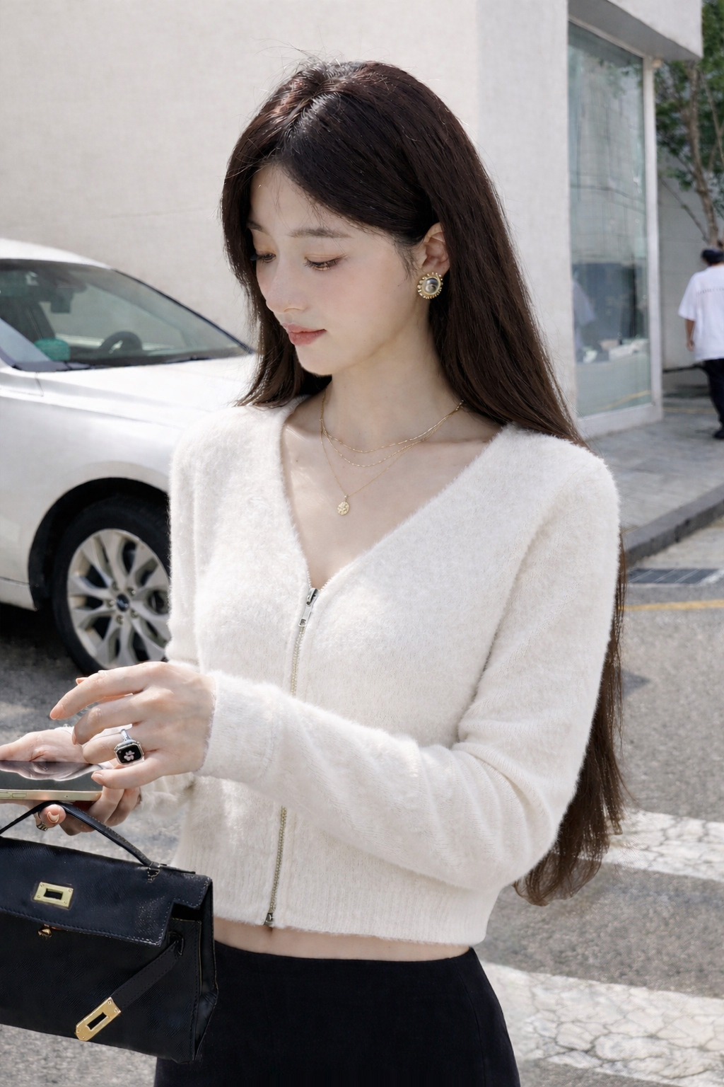 V領馬海毛拉鏈上衣