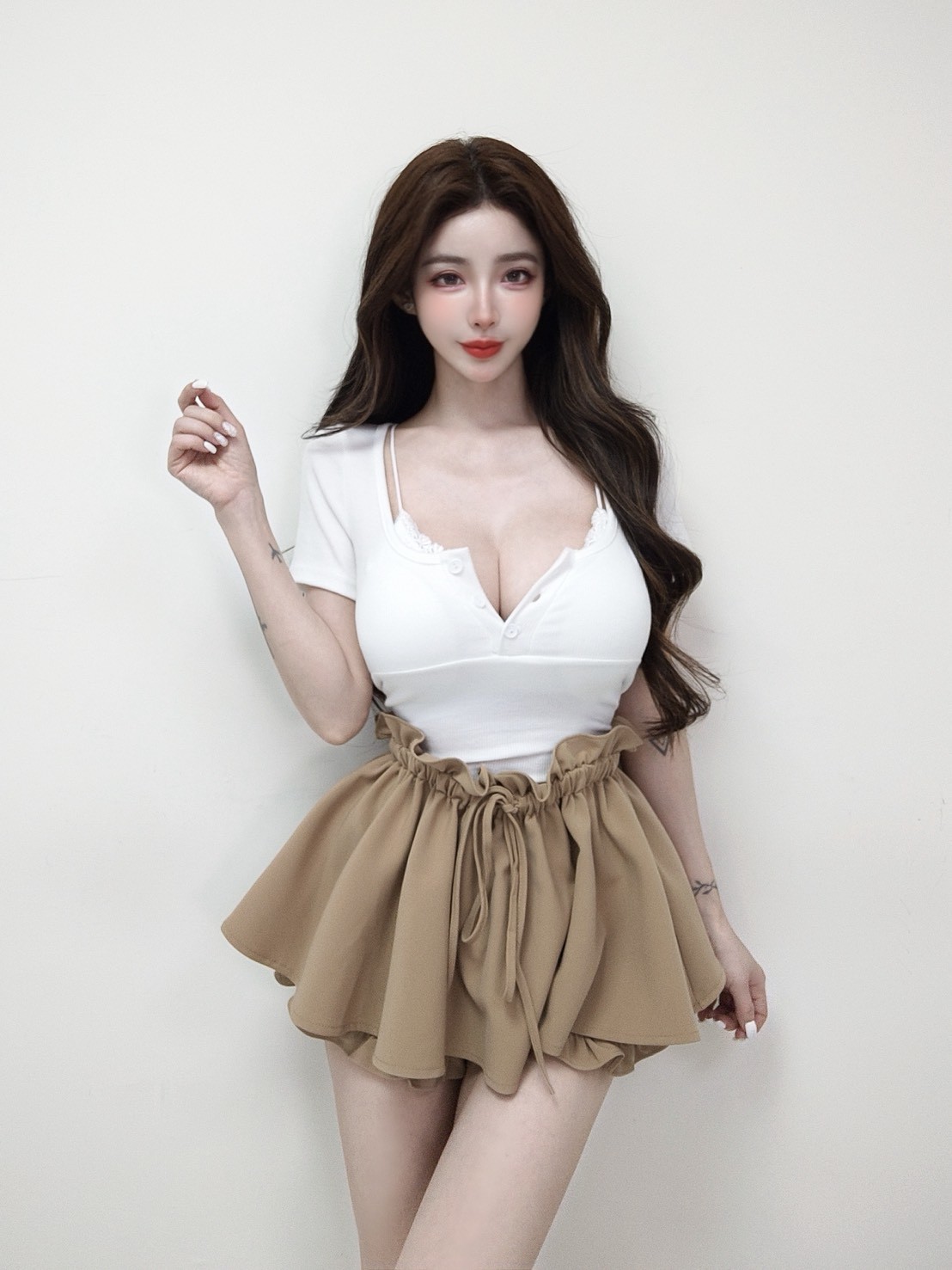 韓國羅紋假兩件蕾絲開釦短袖上衣