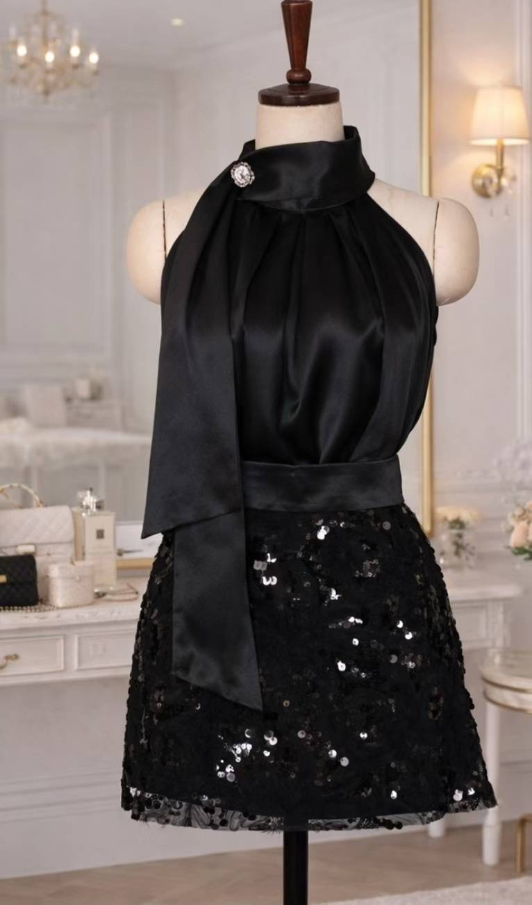 韓國氣質名媛 緞面削肩讚釦綁帶上衣+亮片短裙
