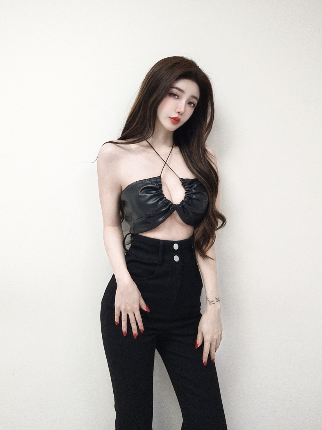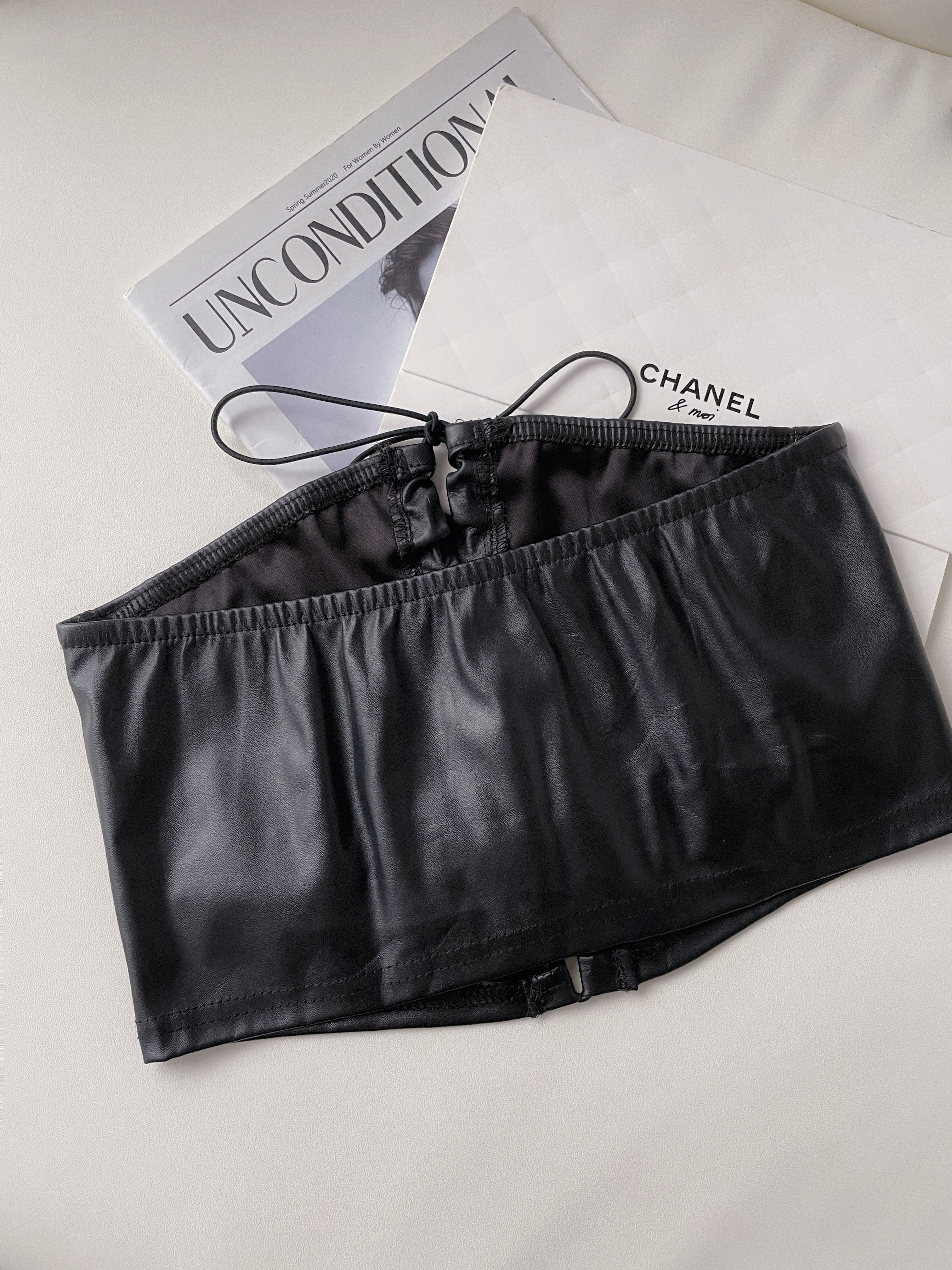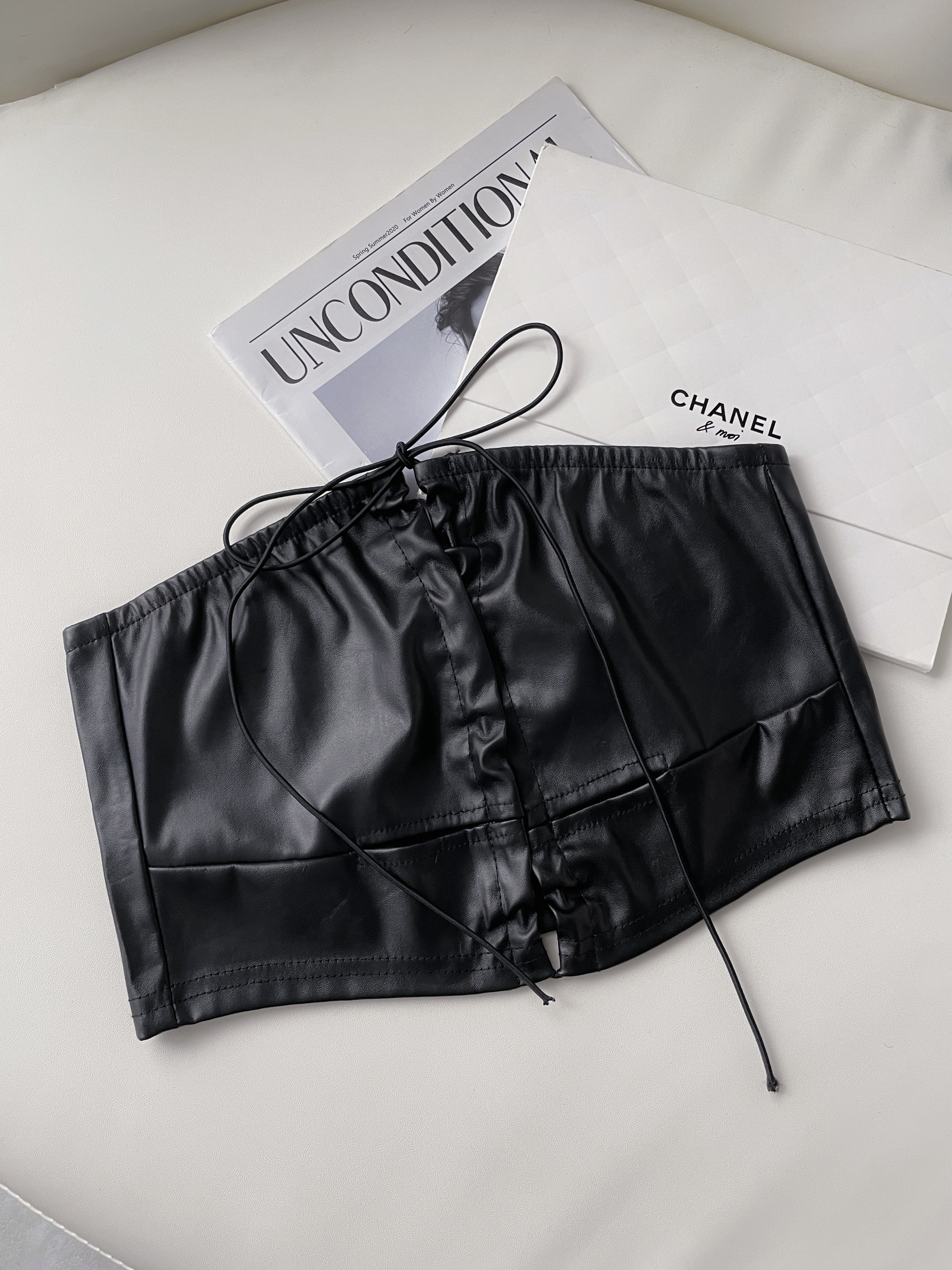 無附胸墊,整件皮革有微彈性,中間綁帶可自行調整鬆緊及抽皺度。
