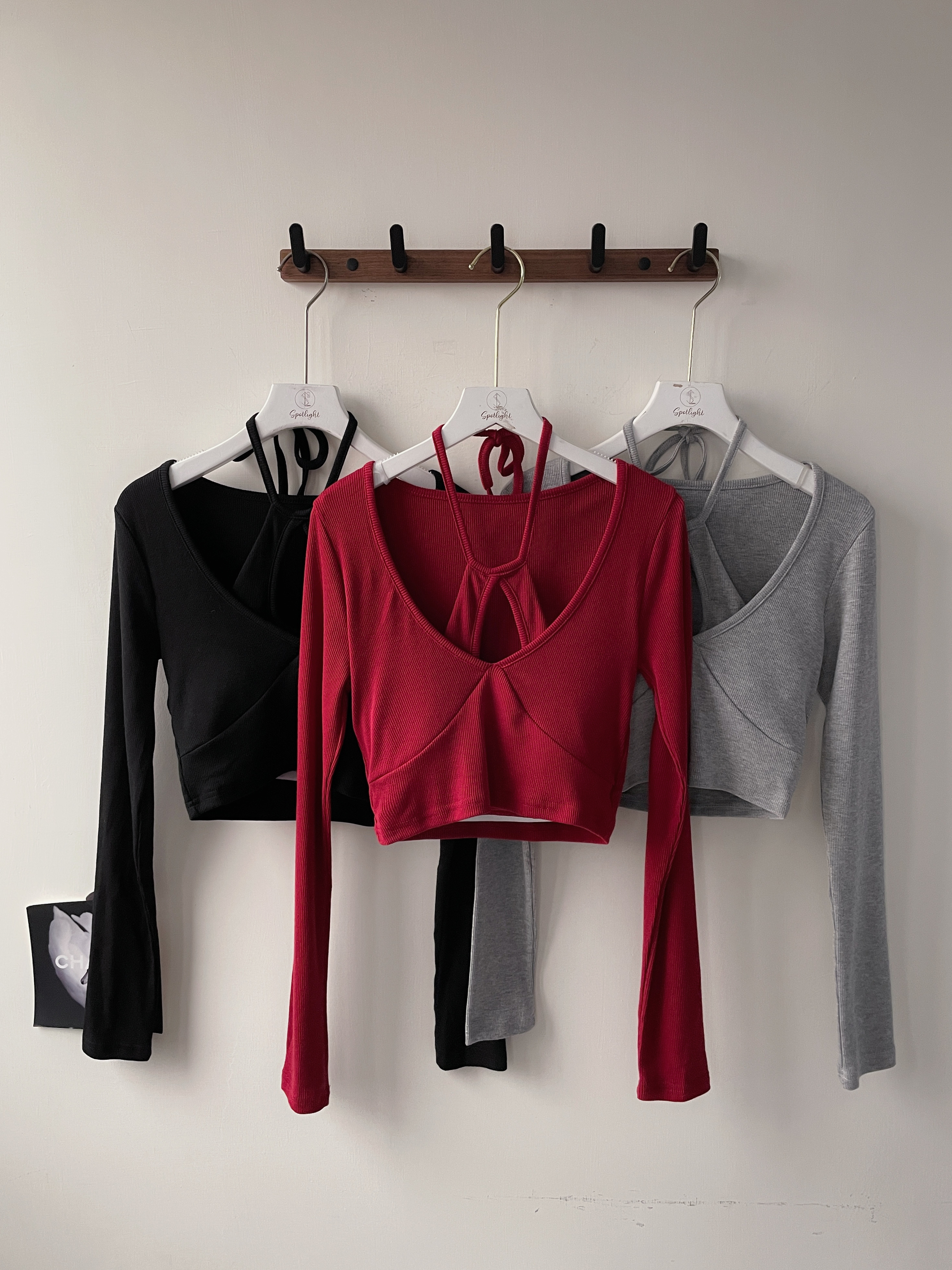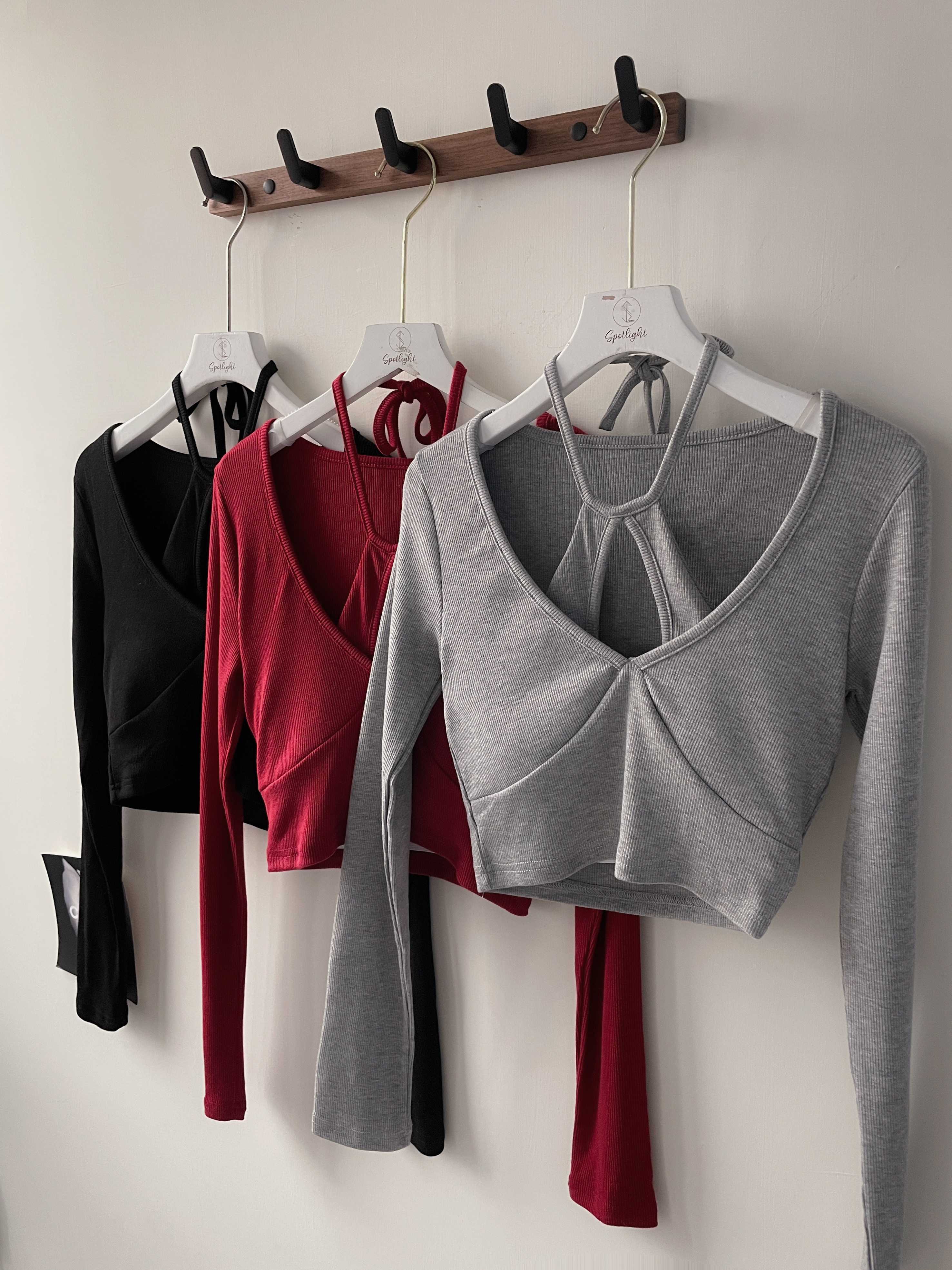 性感陷阱 羅紋繞脖挖胸假兩件式上衣