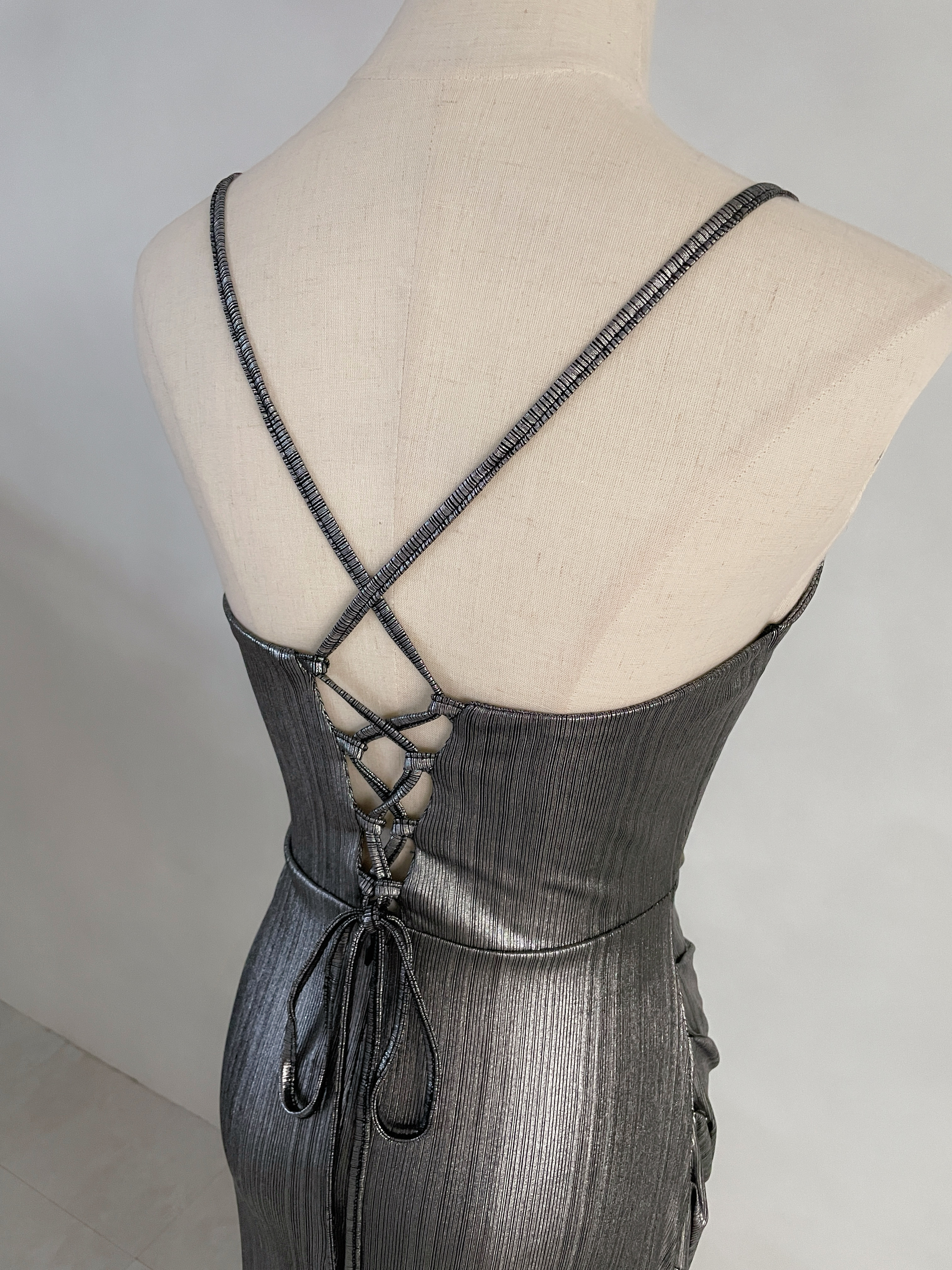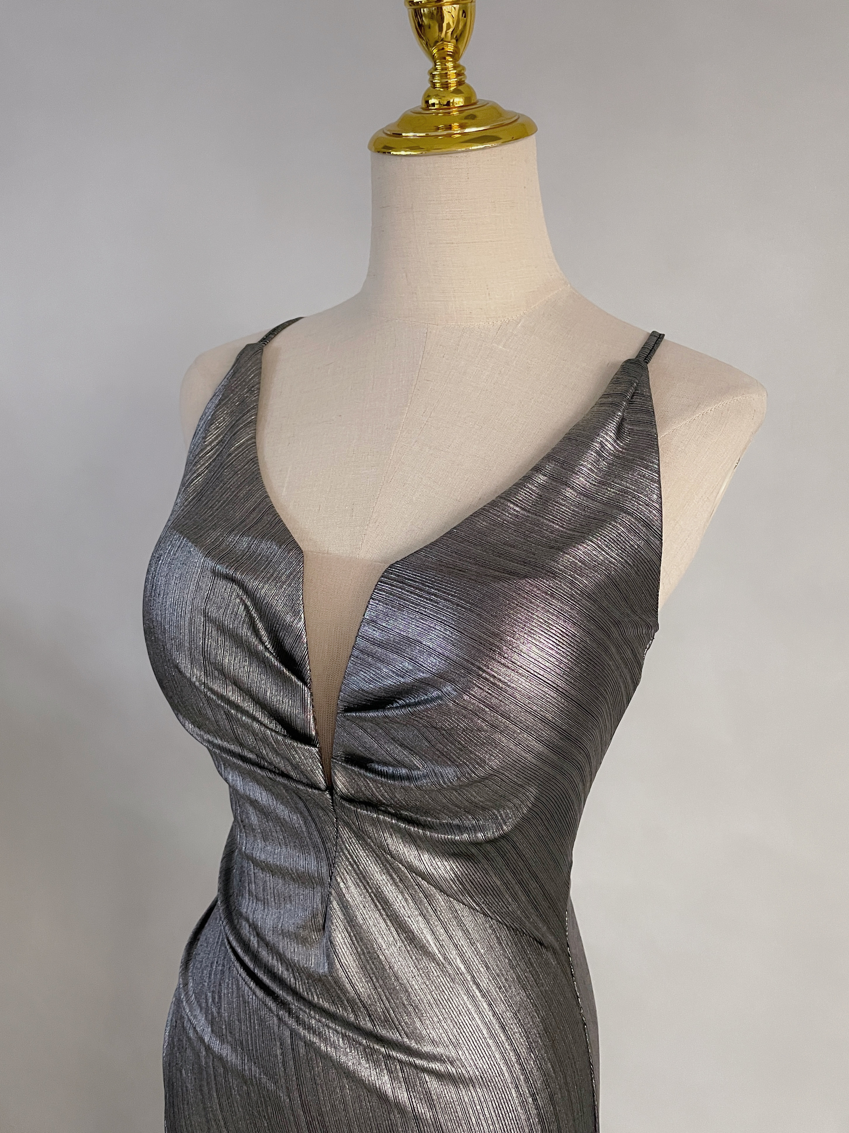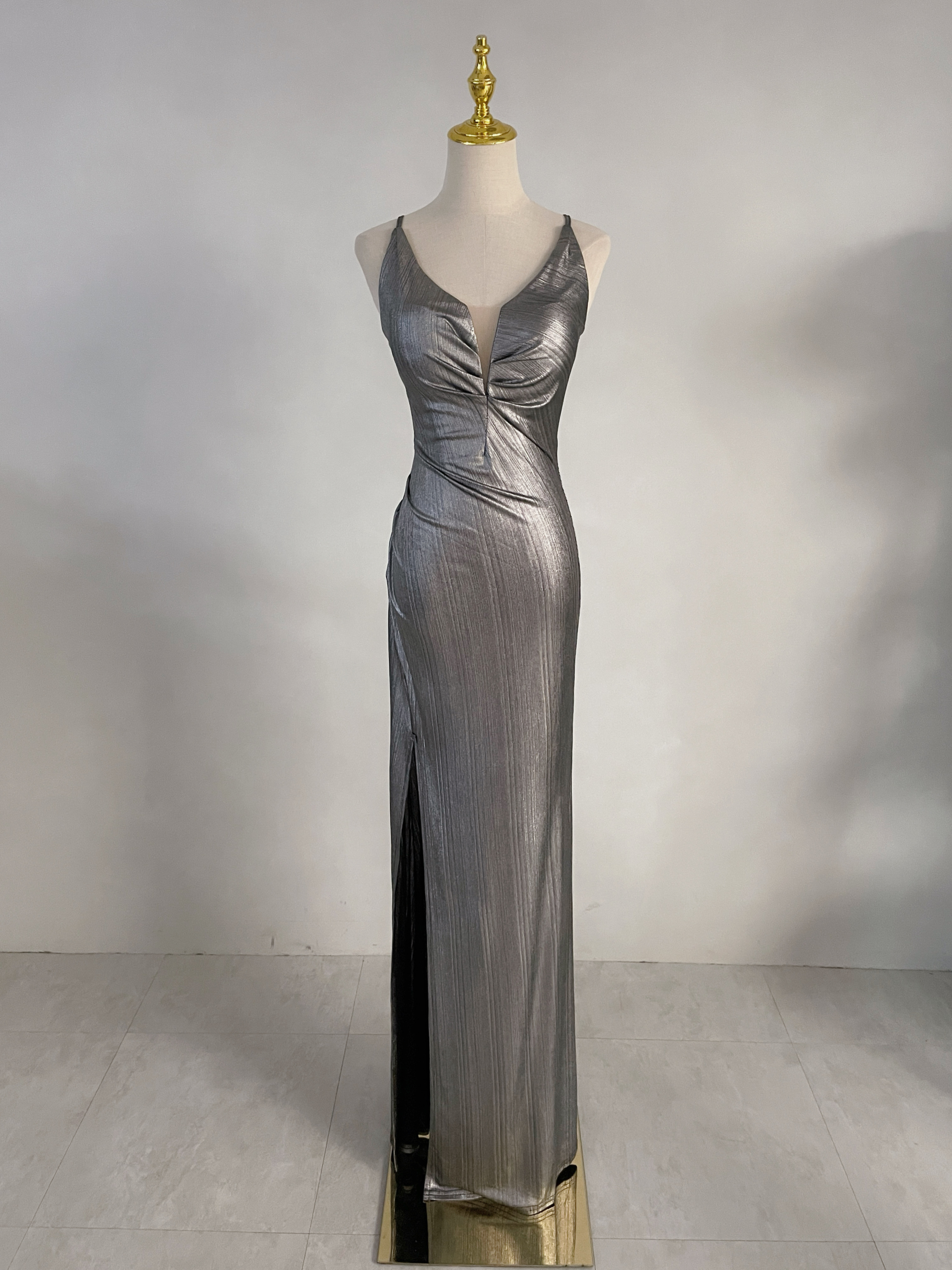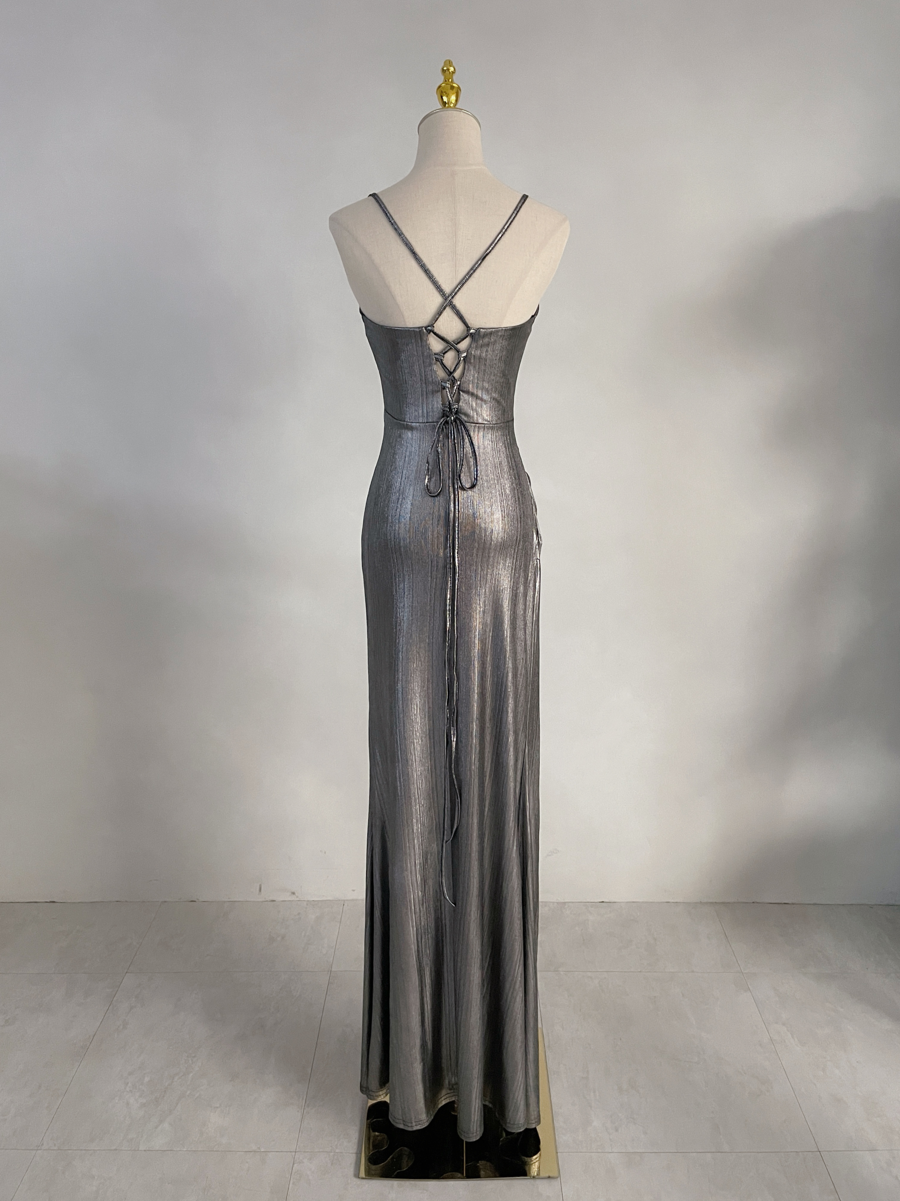 時尚前衛 金屬色網紗深V美背開衩長禮服