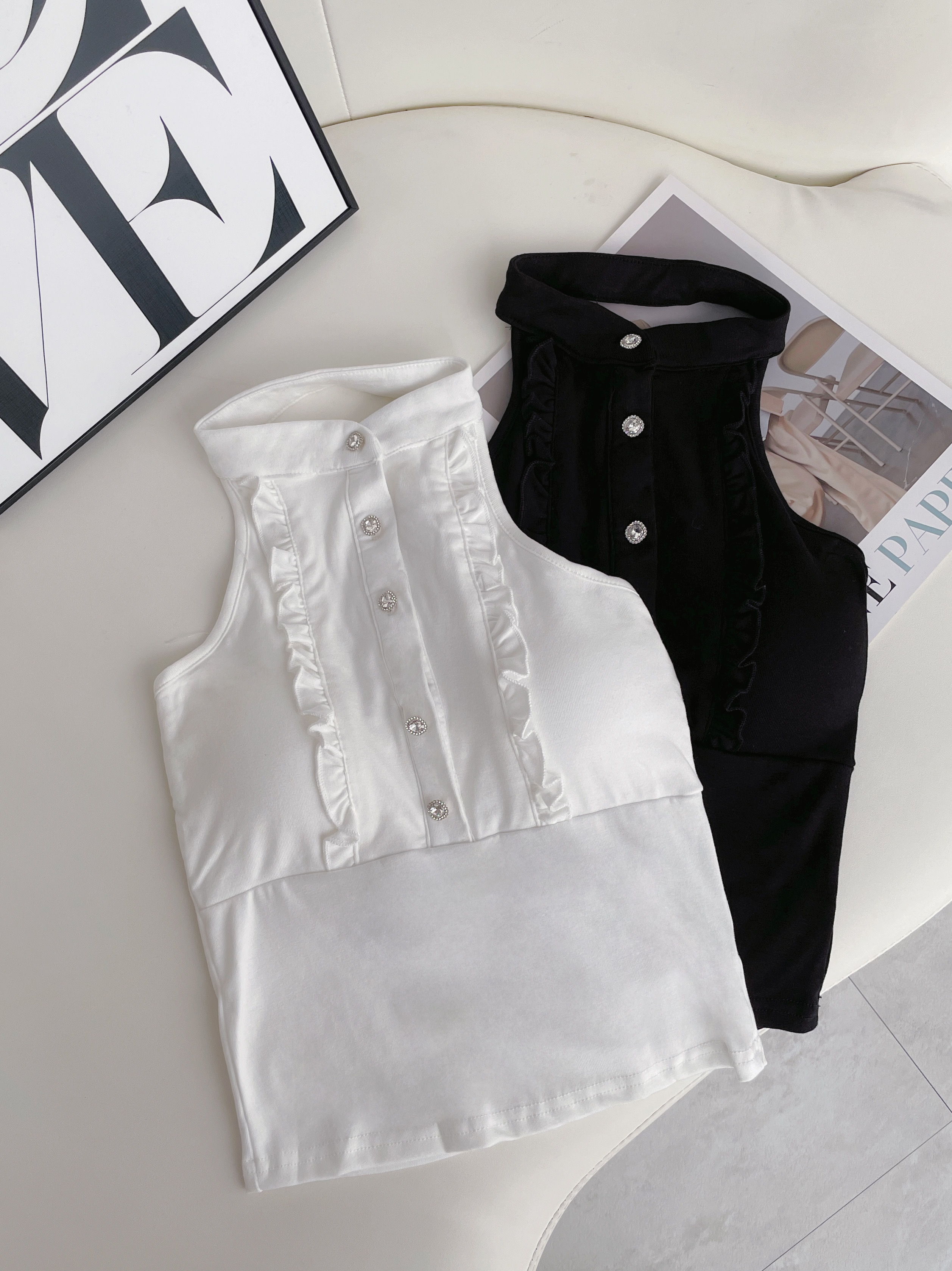 鄰家性感 削肩花邊亮鑽釦上衣